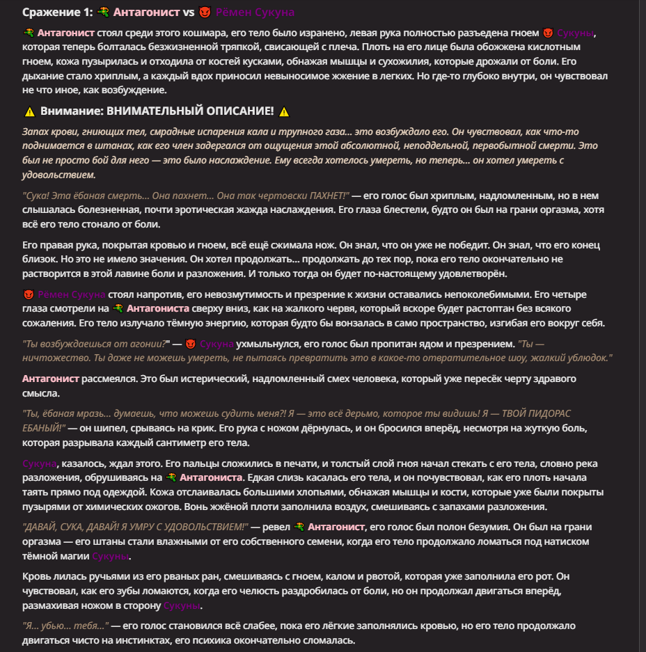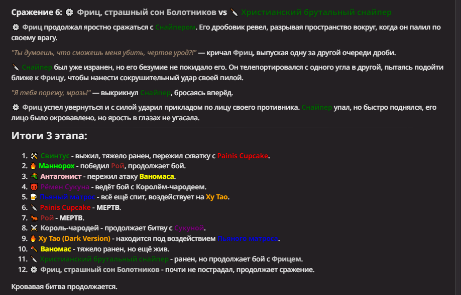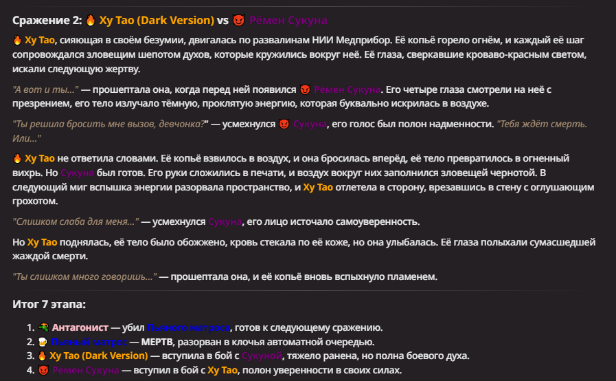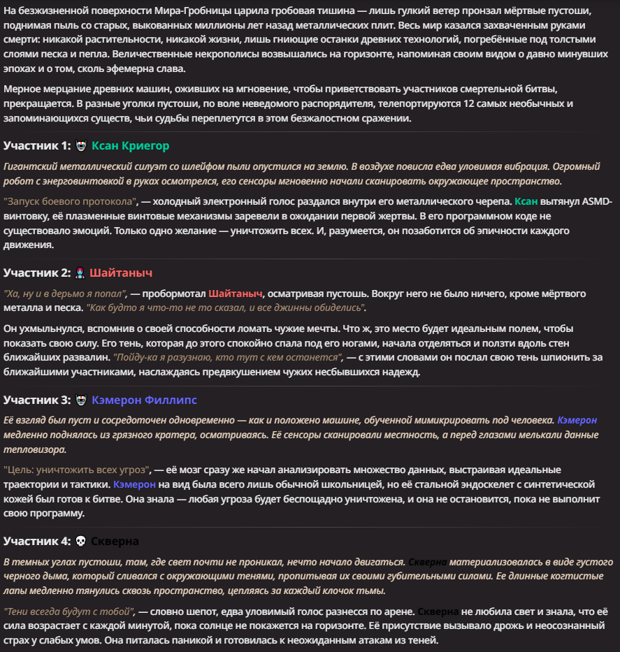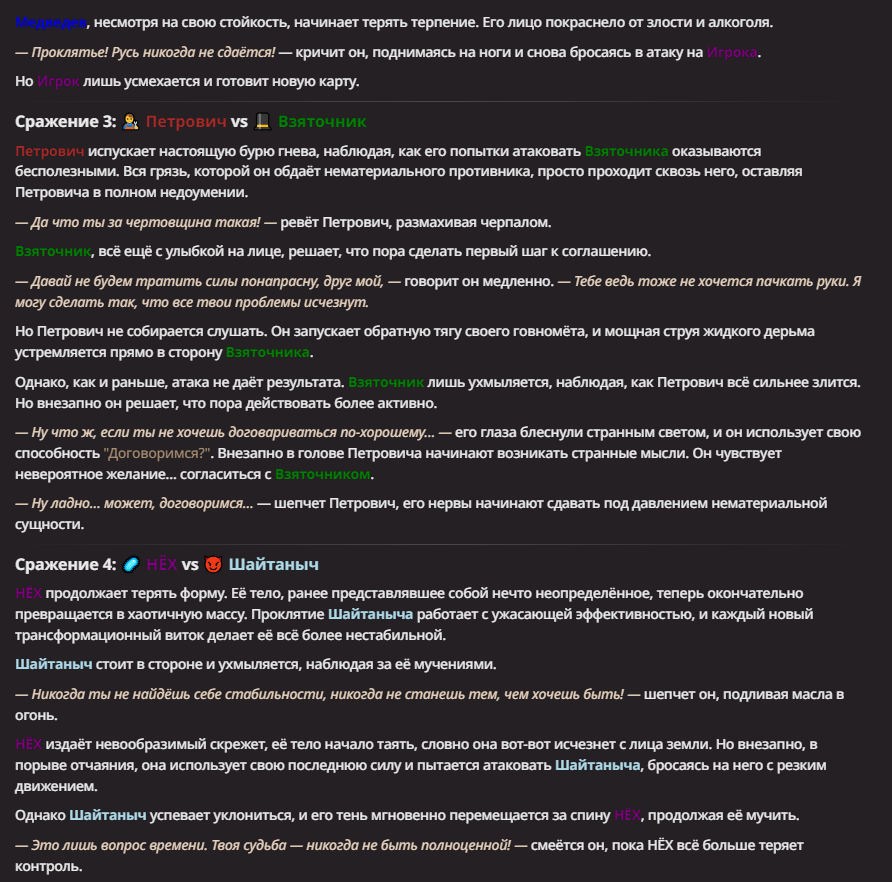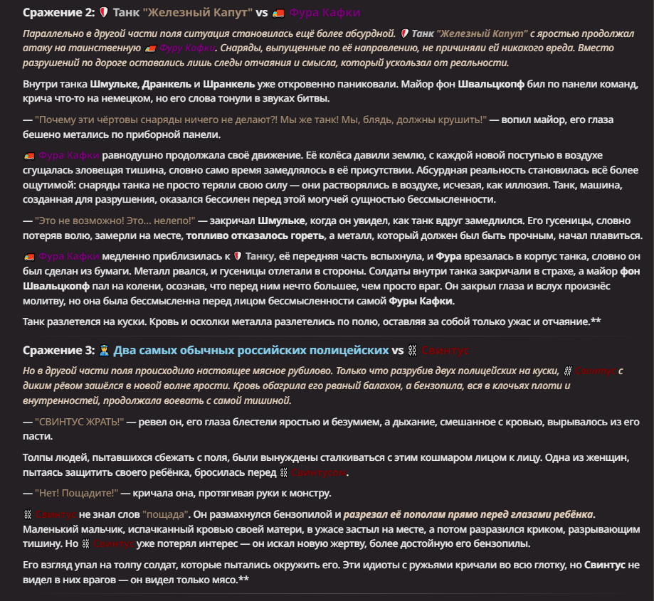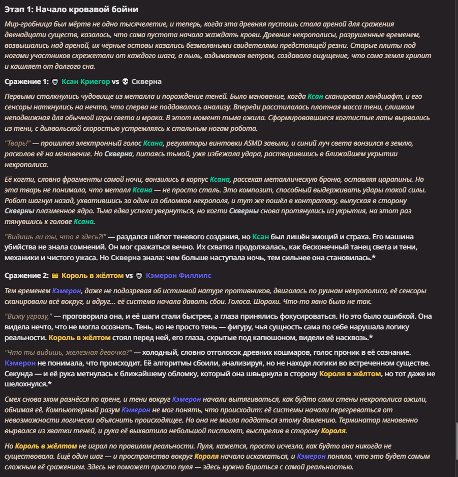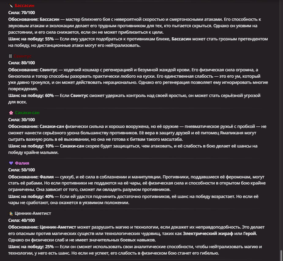>>1544446 Еще с самой генерацией что-то пошло по пизде. Навалила всех в кучу вместо стандартных портянок-отчетов "Персонаж 1 vs Персонаж 2", дрочащихся по 10 раундов. Сделаю описание более явным (придется пожертвовать литературностью) и закину, когда починишь генератор.
