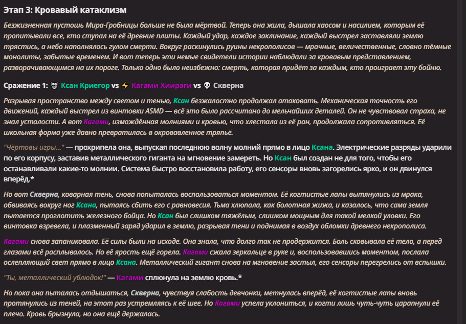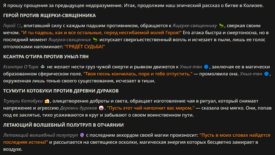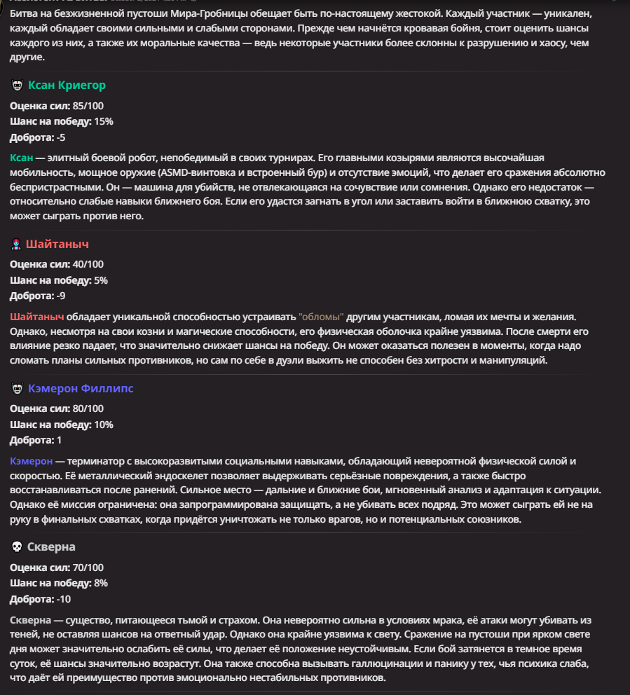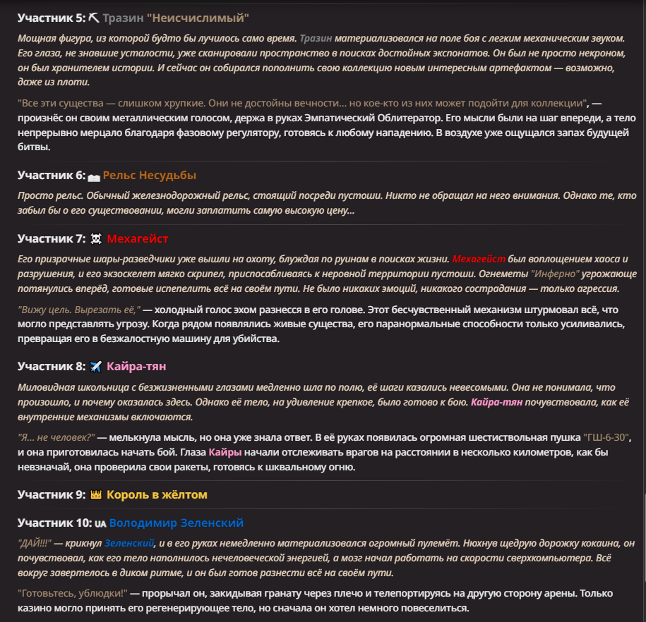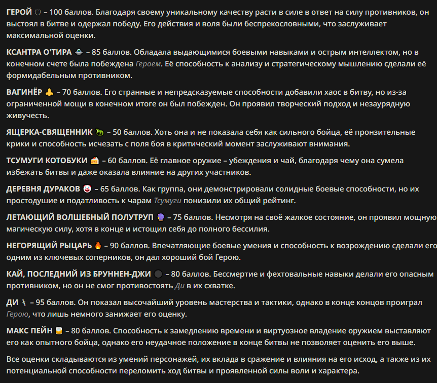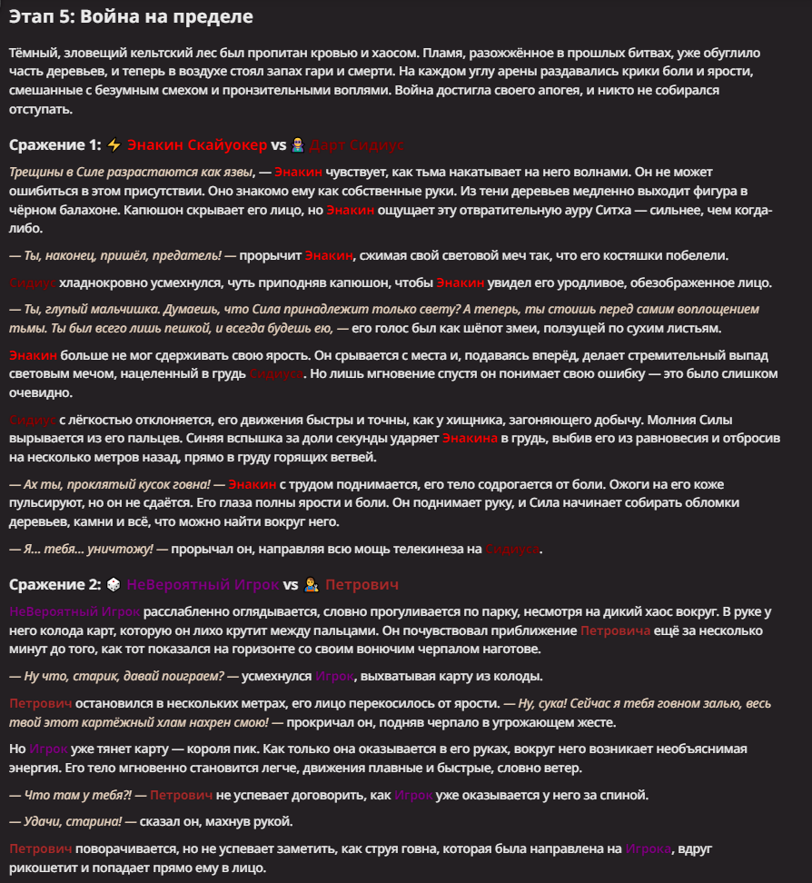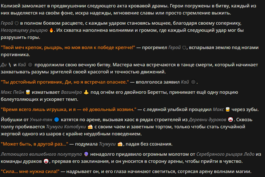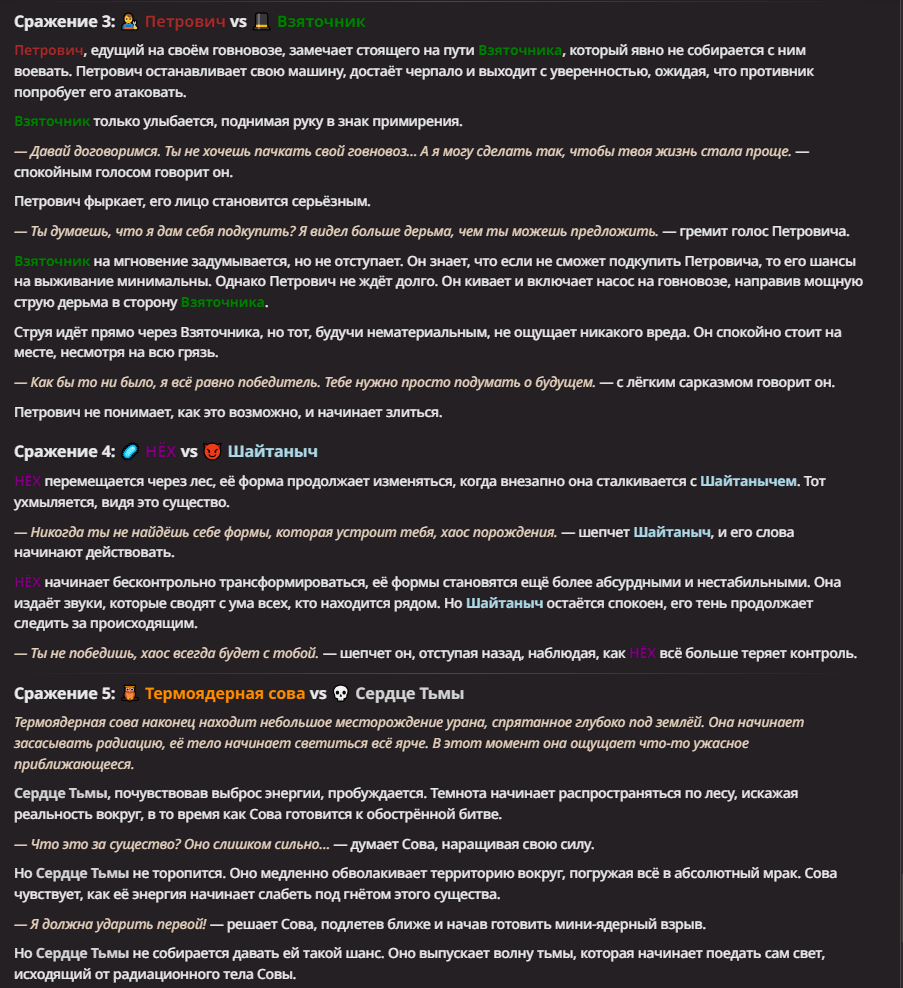 >>1544446 Еще с самой генерацией что-то пошло по пизде. Навалила всех в кучу вместо стандартных портянок-отчетов "Персонаж 1 vs Персонаж 2", дрочащихся по 10 раундов. Сделаю описание более явным (придется пожертвовать литературностью) и закину, когда починишь генератор.