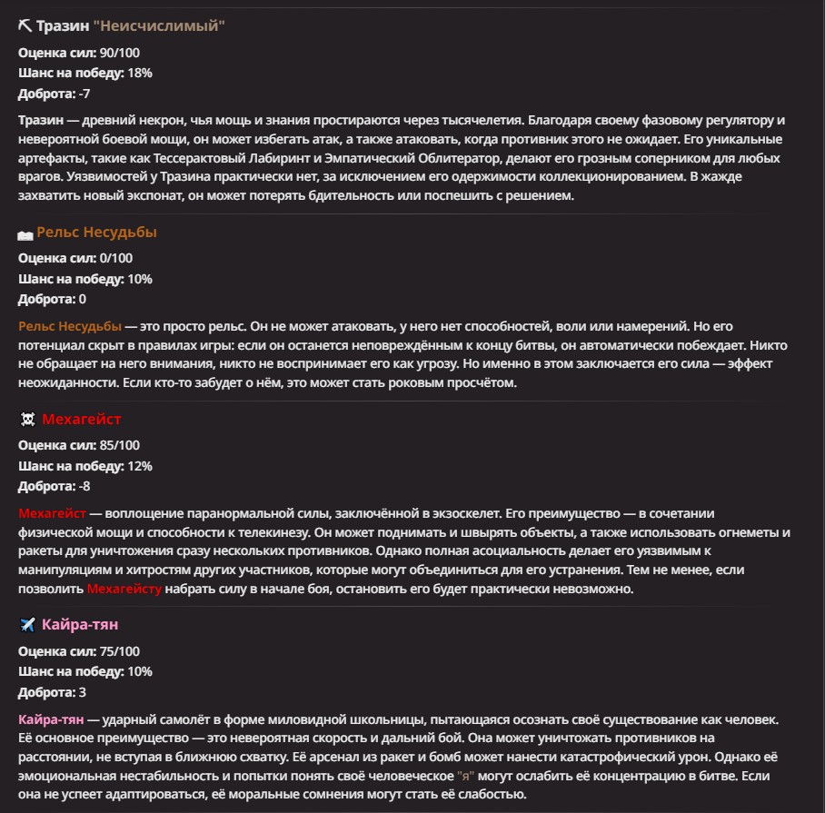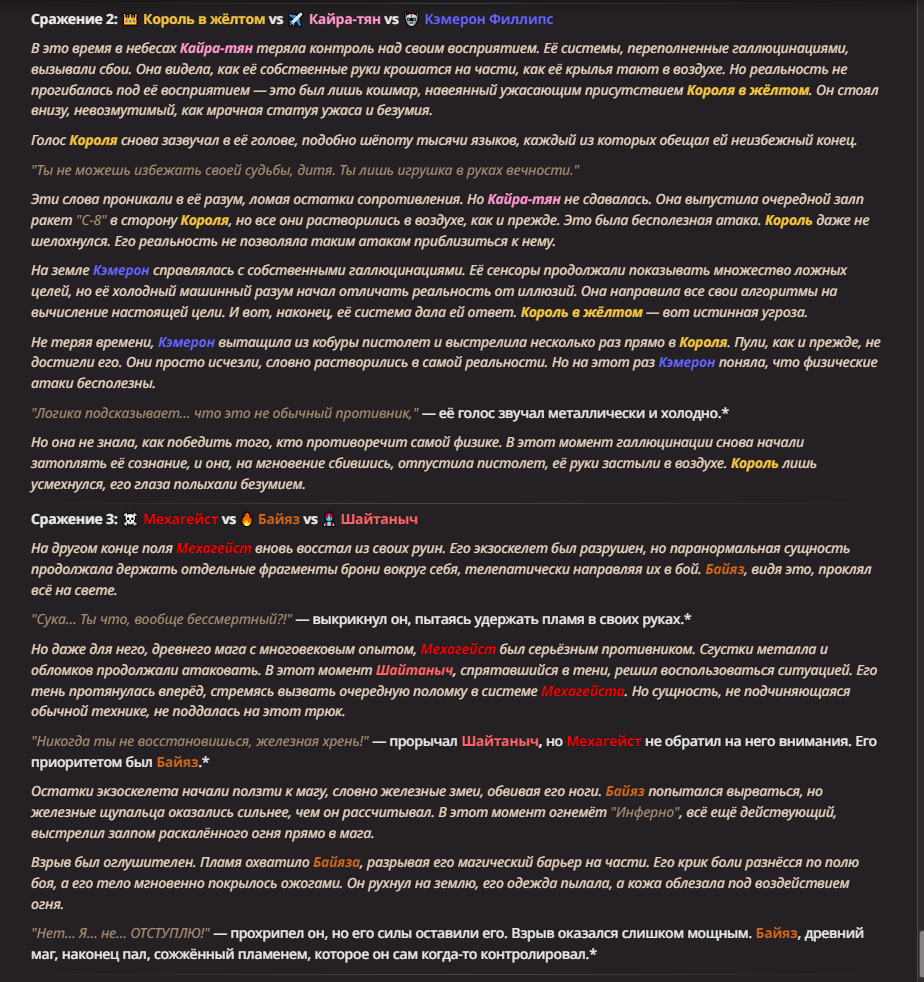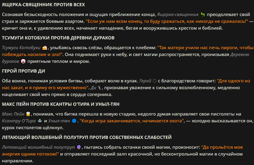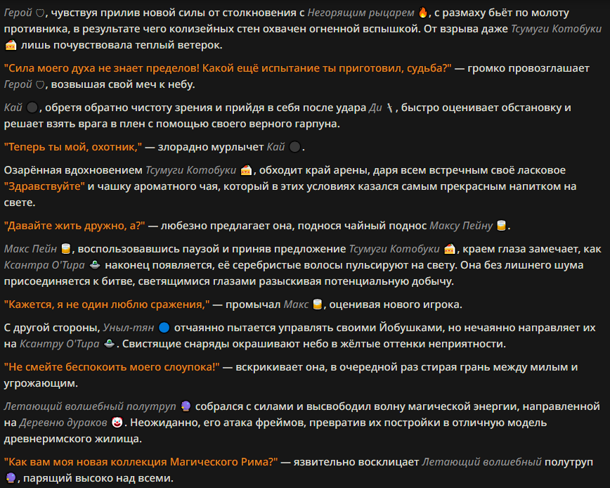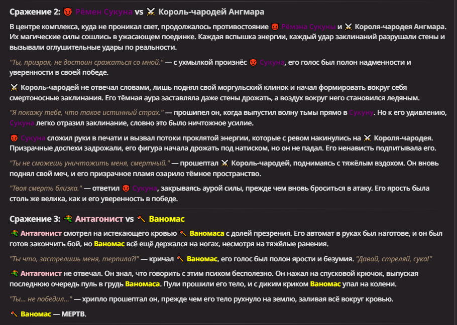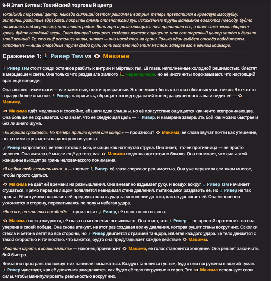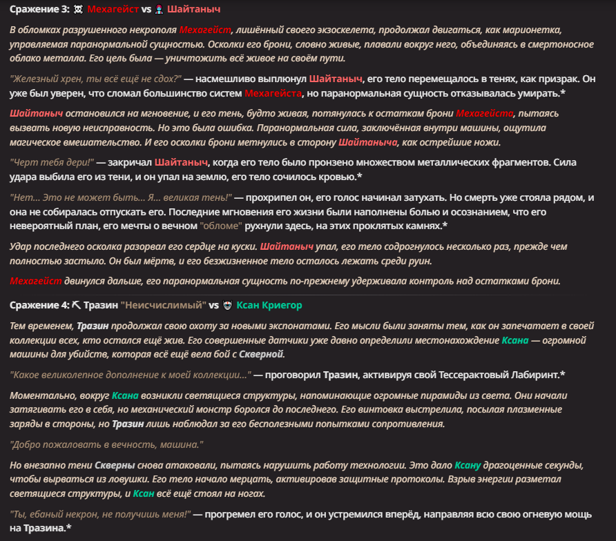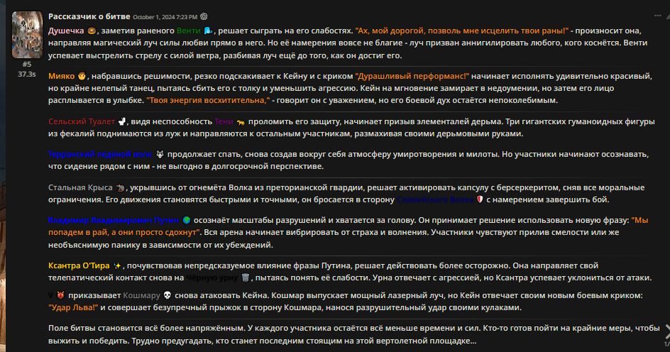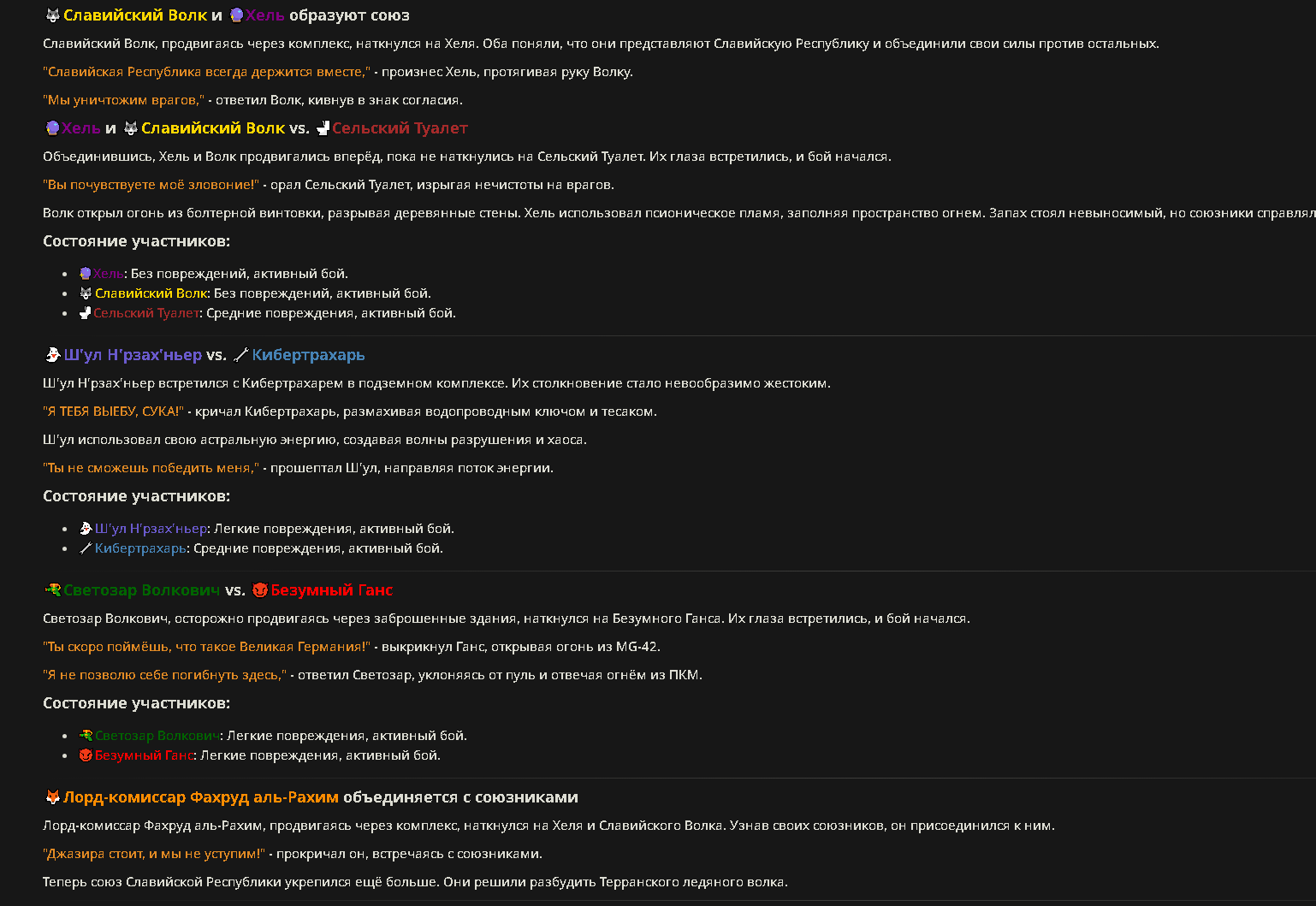 >>1544446 Еще с самой генерацией что-то пошло по пизде. Навалила всех в кучу вместо стандартных портянок-отчетов "Персонаж 1 vs Персонаж 2", дрочащихся по 10 раундов. Сделаю описание более явным (придется пожертвовать литературностью) и закину, когда починишь генератор.