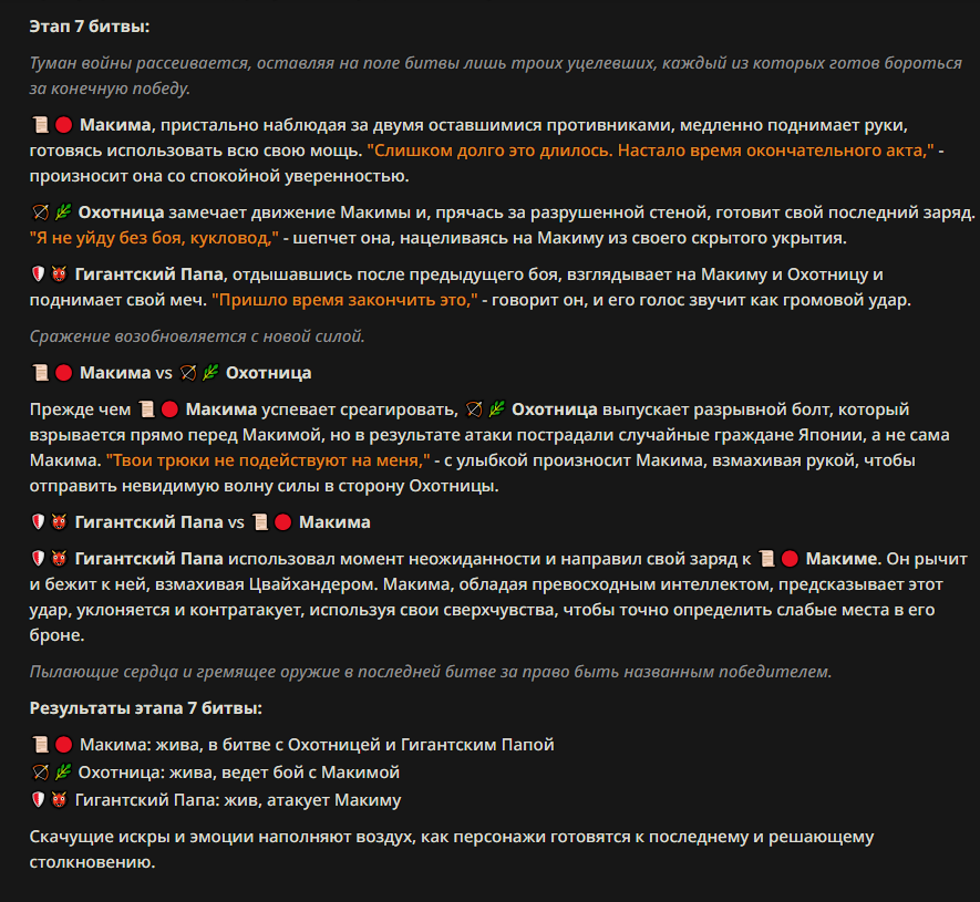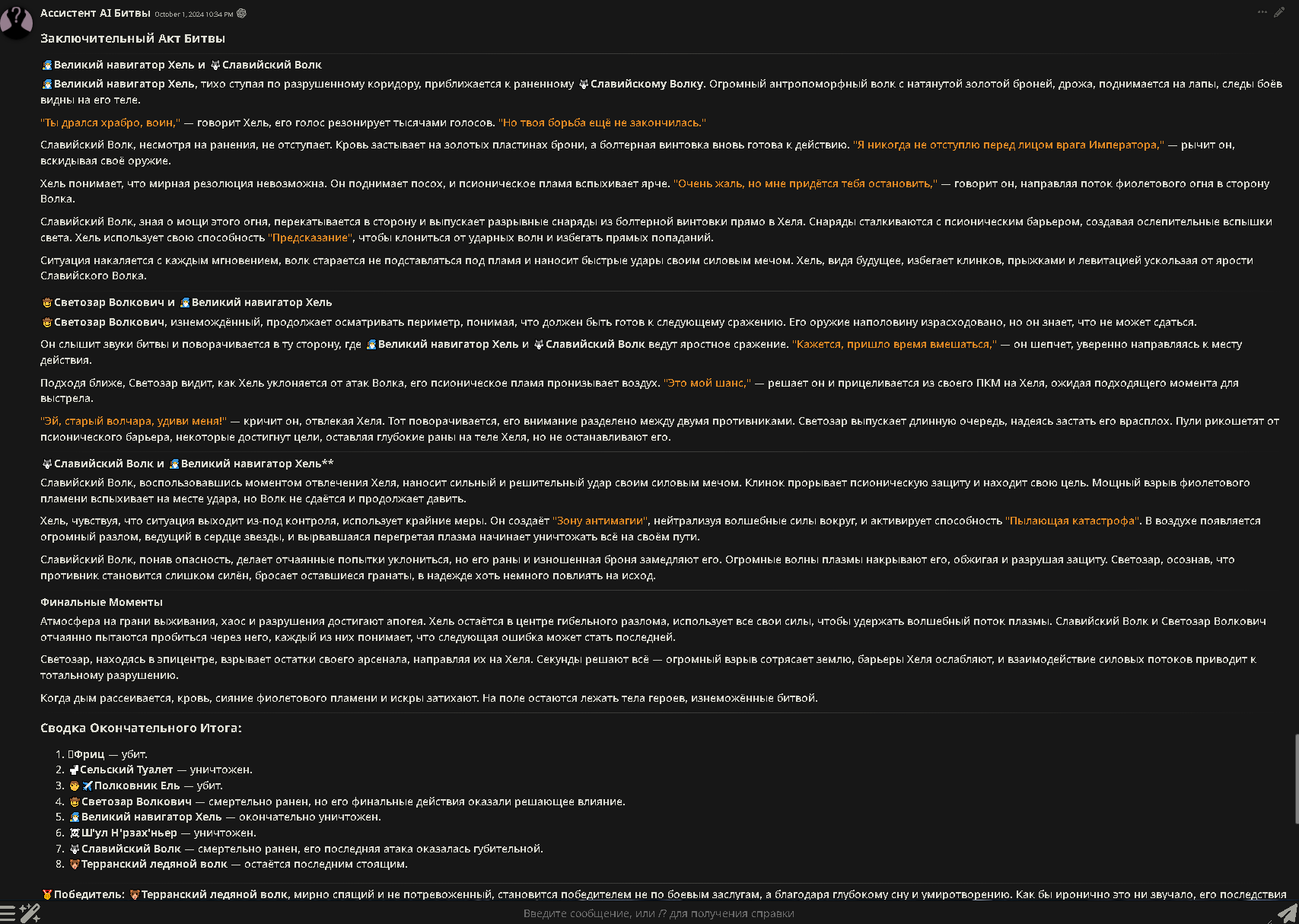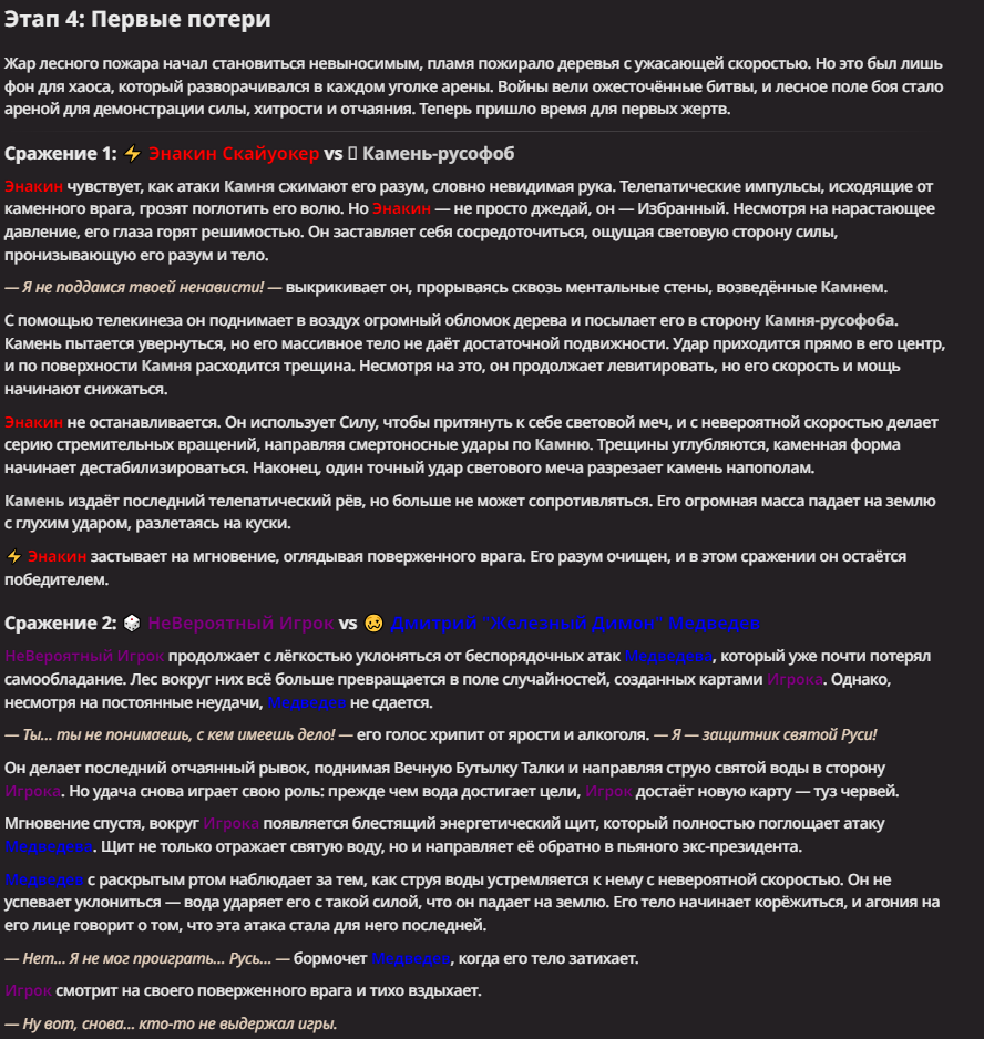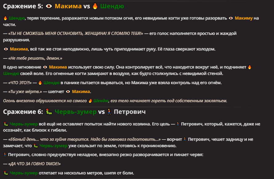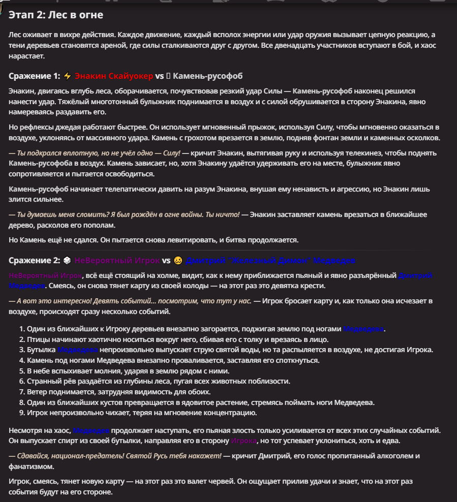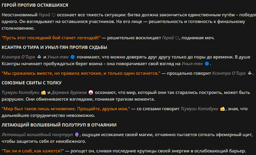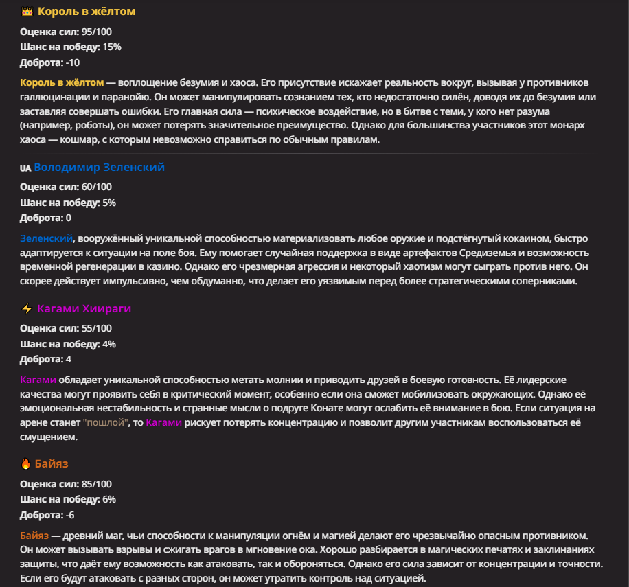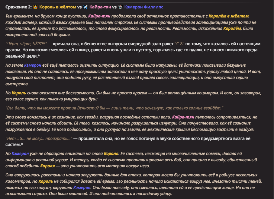>>1544446 Еще с самой генерацией что-то пошло по пизде. Навалила всех в кучу вместо стандартных портянок-отчетов "Персонаж 1 vs Персонаж 2", дрочащихся по 10 раундов. Сделаю описание более явным (придется пожертвовать литературностью) и закину, когда починишь генератор.