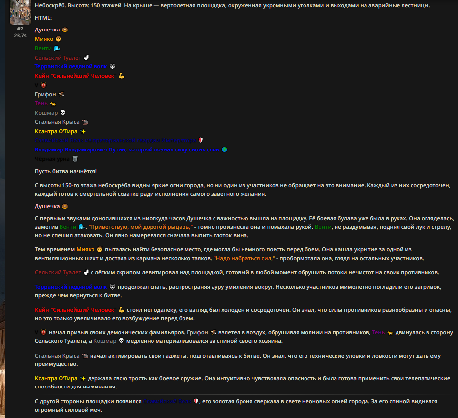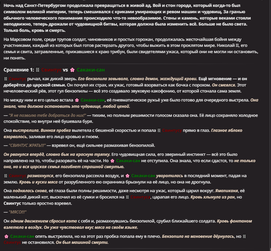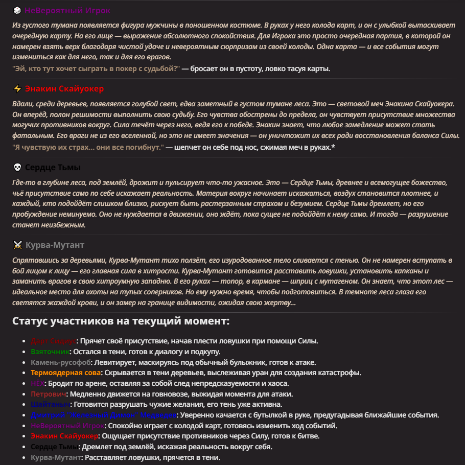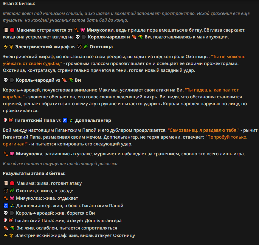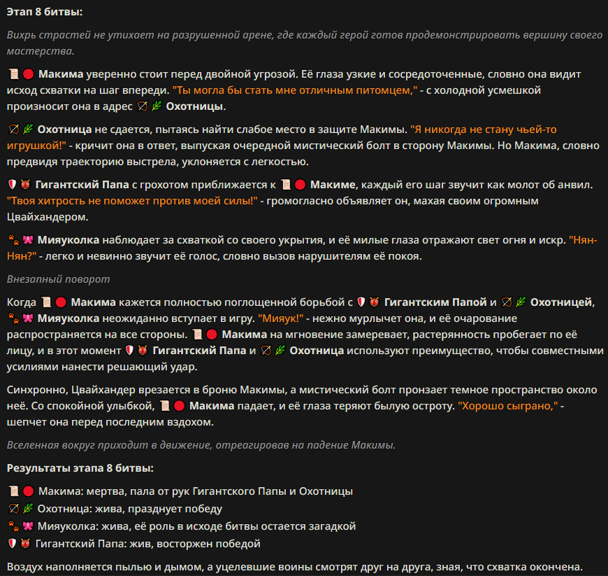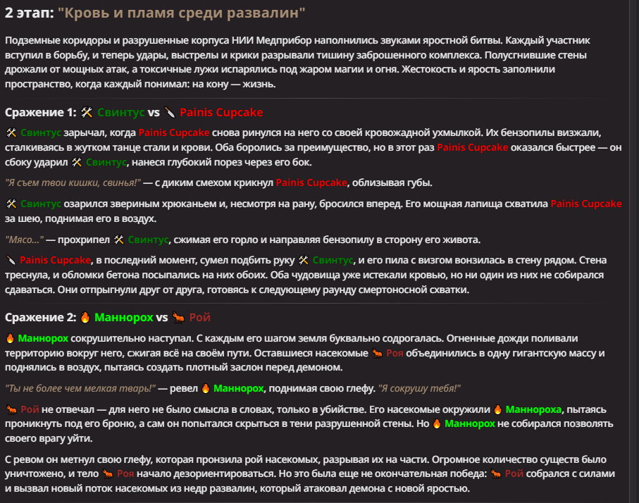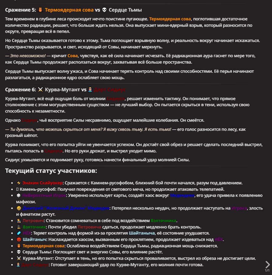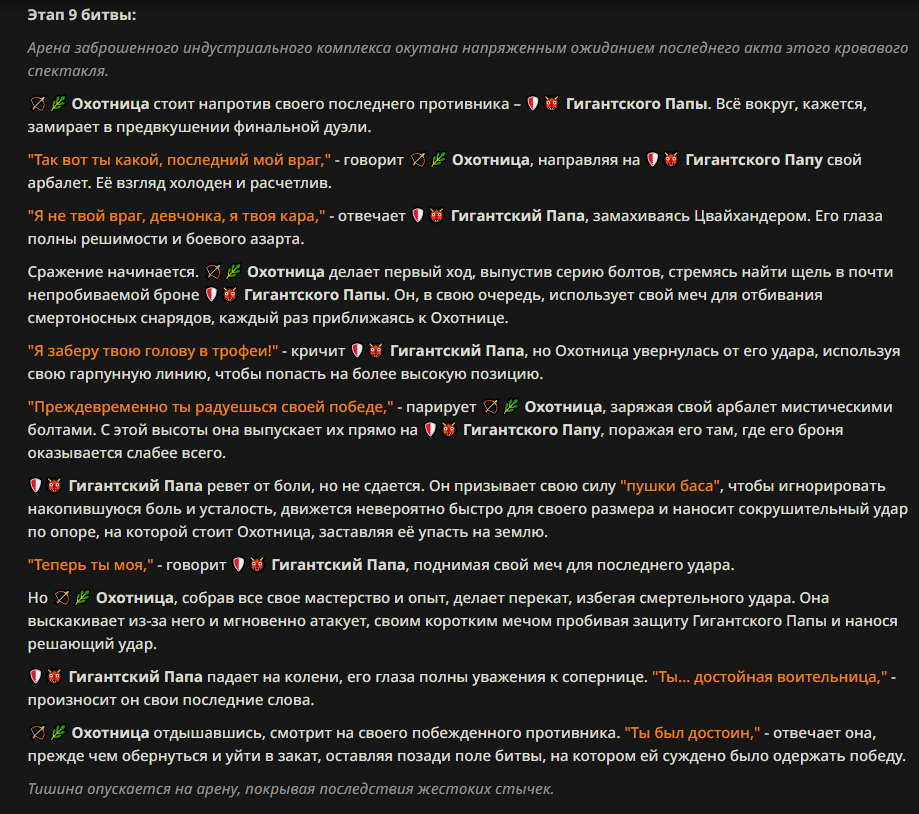 >>1544446 Еще с самой генерацией что-то пошло по пизде. Навалила всех в кучу вместо стандартных портянок-отчетов "Персонаж 1 vs Персонаж 2", дрочащихся по 10 раундов. Сделаю описание более явным (придется пожертвовать литературностью) и закину, когда починишь генератор.