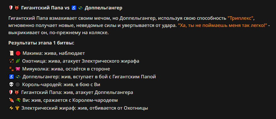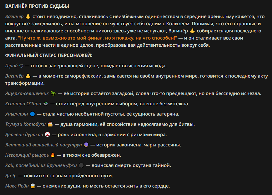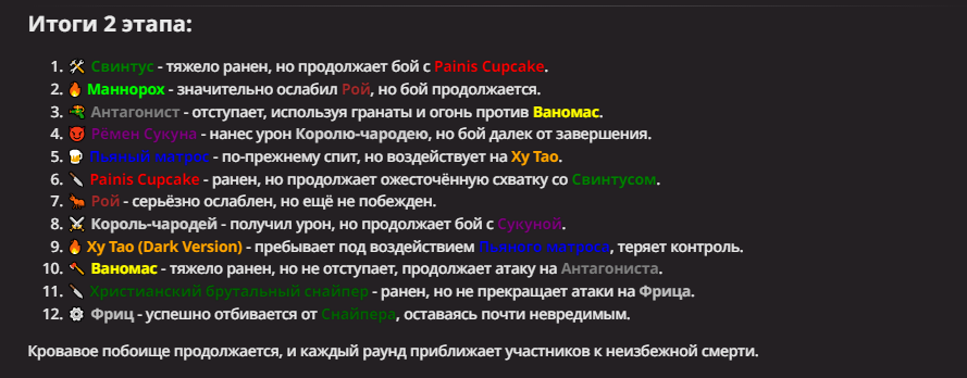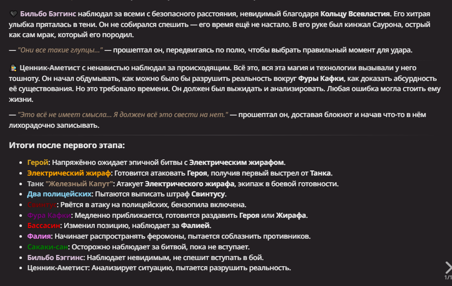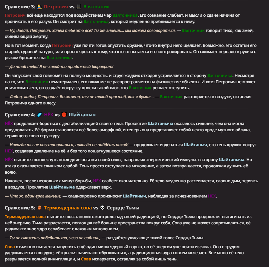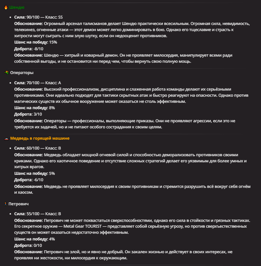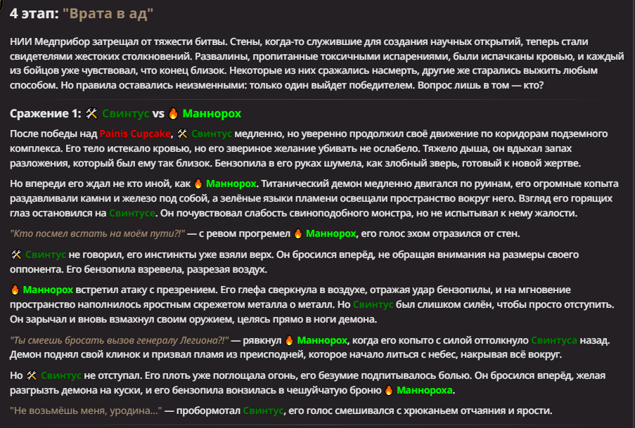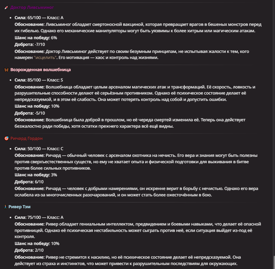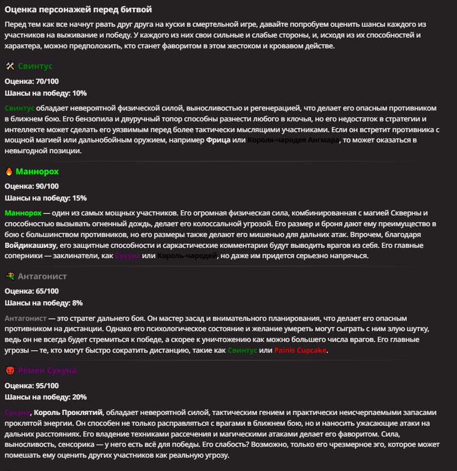 >>1544446 Еще с самой генерацией что-то пошло по пизде. Навалила всех в кучу вместо стандартных портянок-отчетов "Персонаж 1 vs Персонаж 2", дрочащихся по 10 раундов. Сделаю описание более явным (придется пожертвовать литературностью) и закину, когда починишь генератор.
