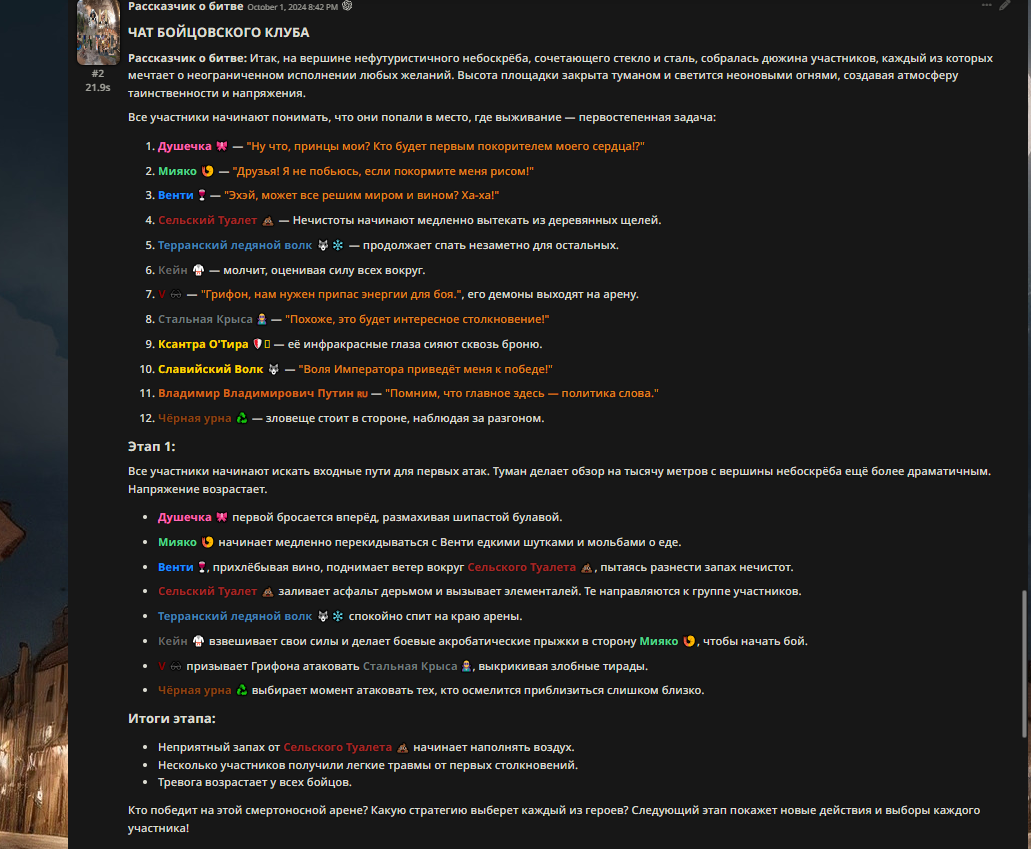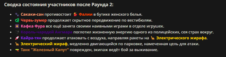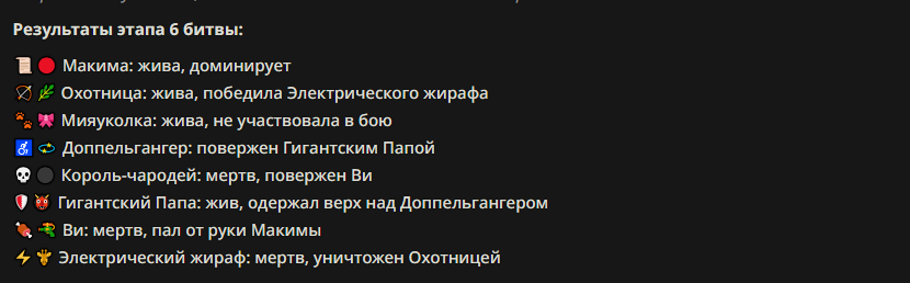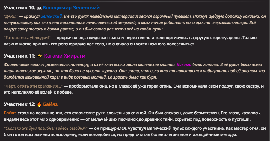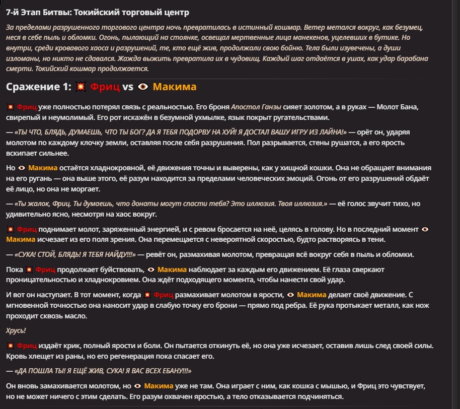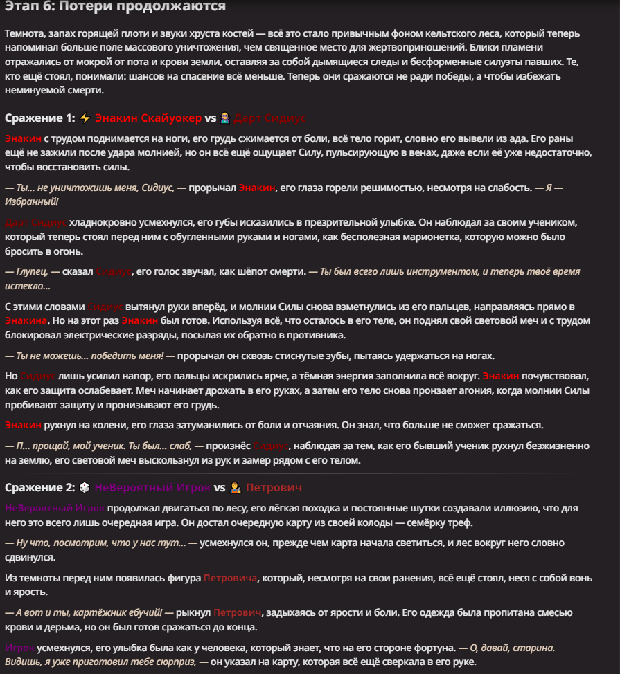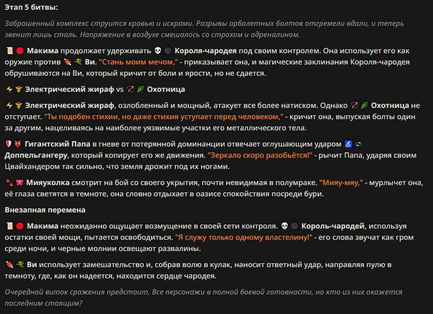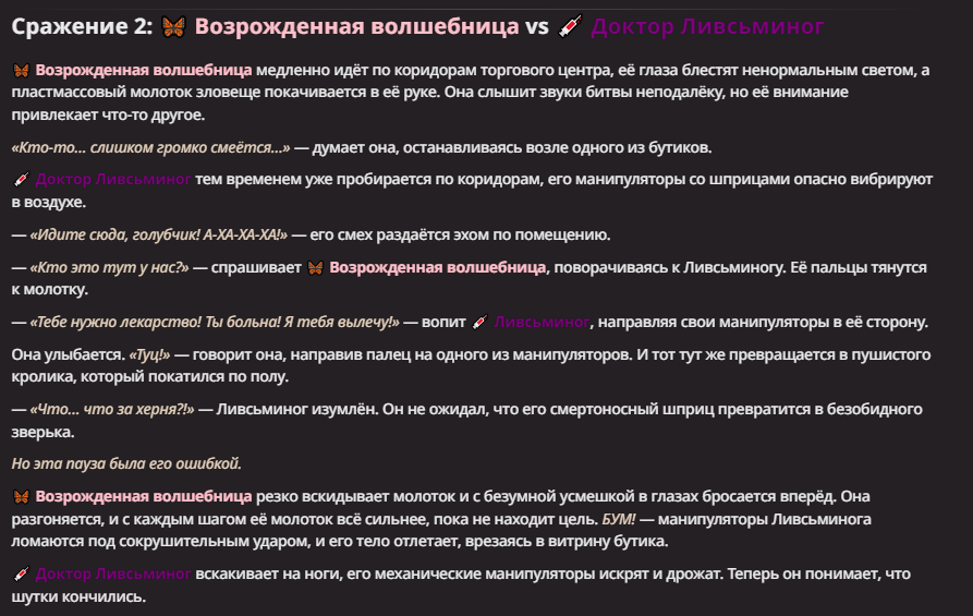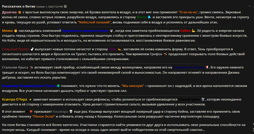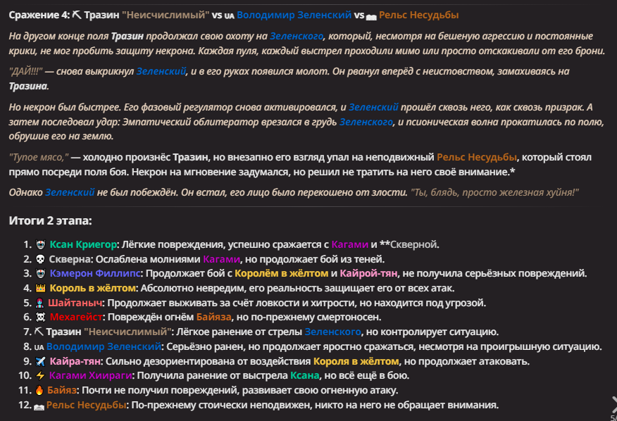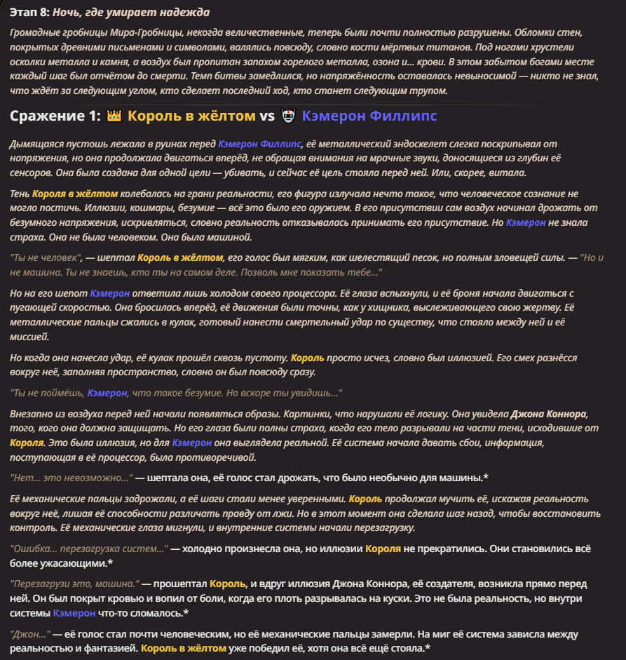 >>1544446 Еще с самой генерацией что-то пошло по пизде. Навалила всех в кучу вместо стандартных портянок-отчетов "Персонаж 1 vs Персонаж 2", дрочащихся по 10 раундов. Сделаю описание более явным (придется пожертвовать литературностью) и закину, когда починишь генератор.