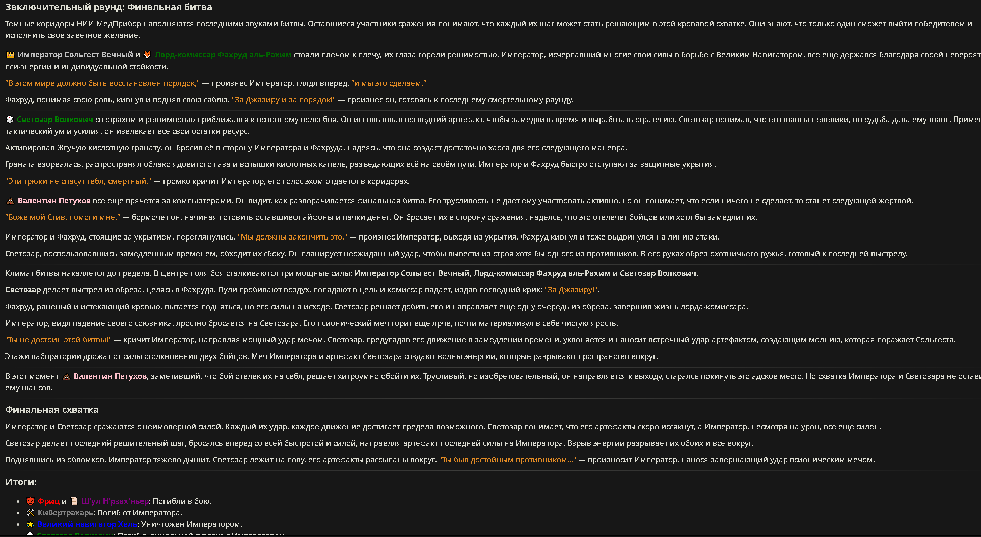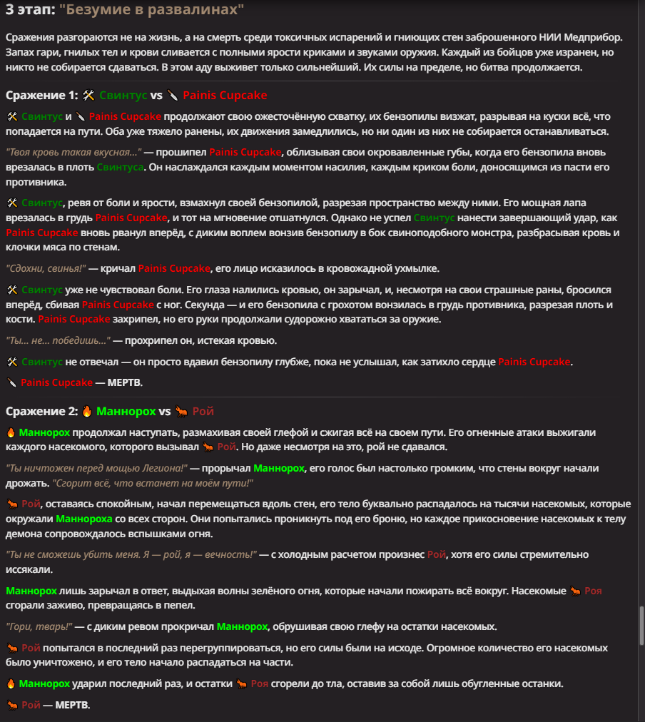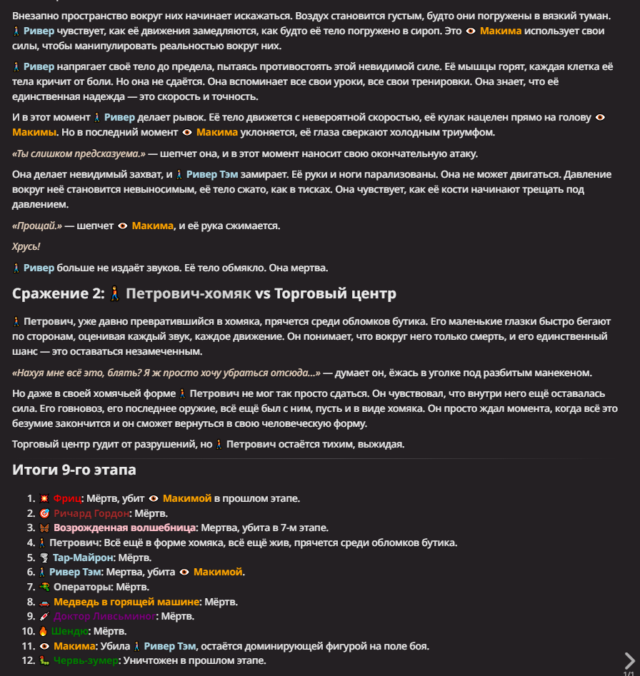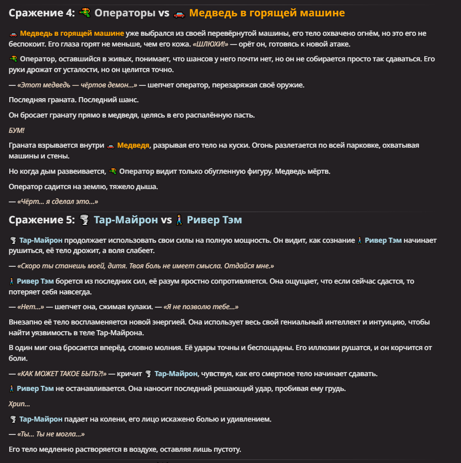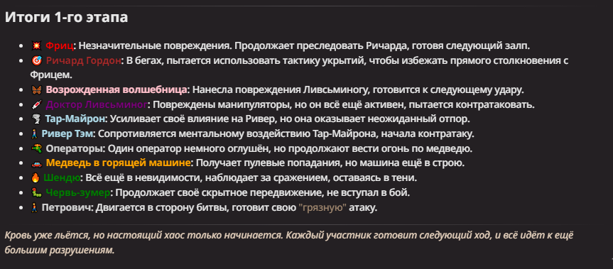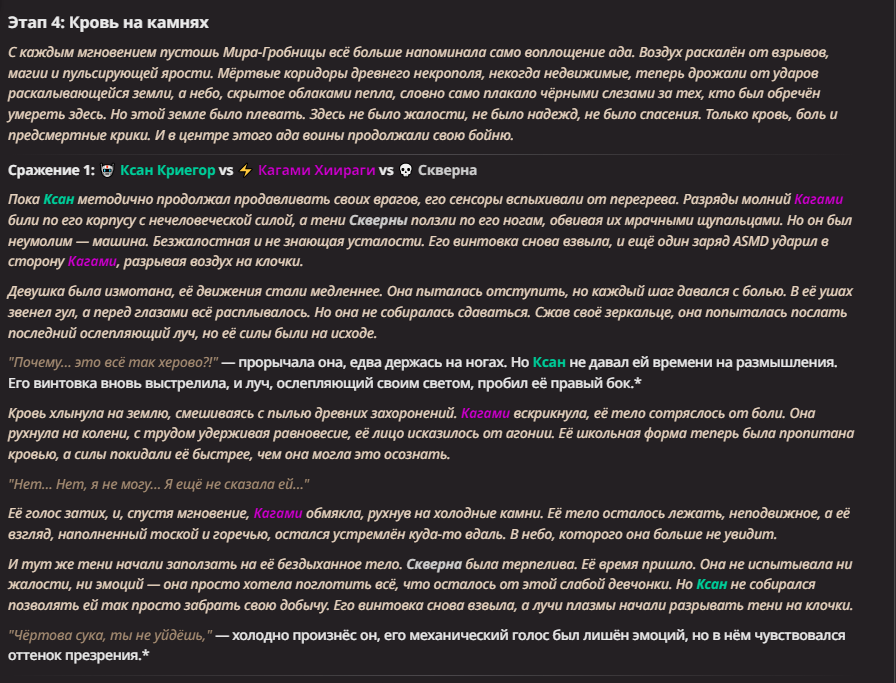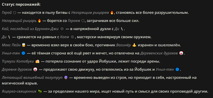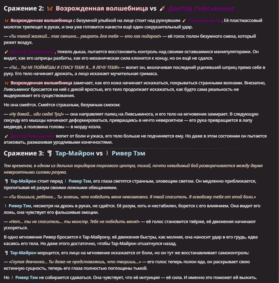 >>1544446 Еще с самой генерацией что-то пошло по пизде. Навалила всех в кучу вместо стандартных портянок-отчетов "Персонаж 1 vs Персонаж 2", дрочащихся по 10 раундов. Сделаю описание более явным (придется пожертвовать литературностью) и закину, когда починишь генератор.