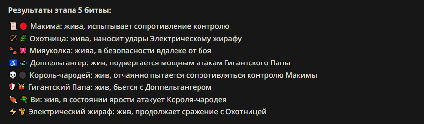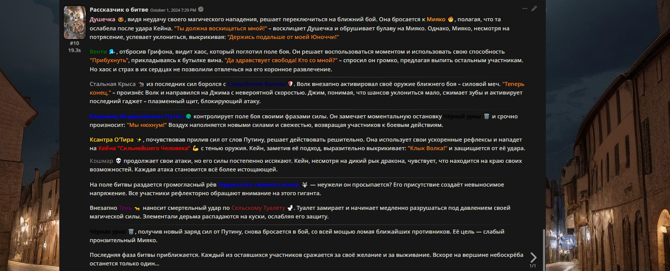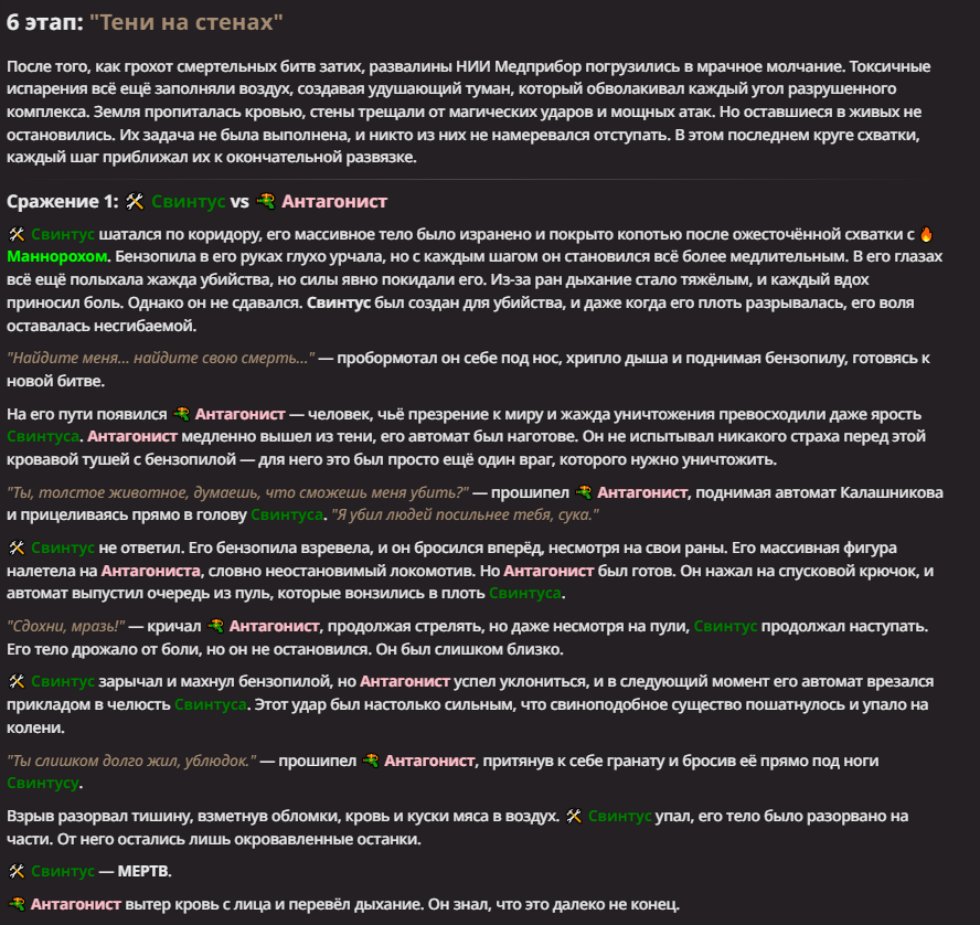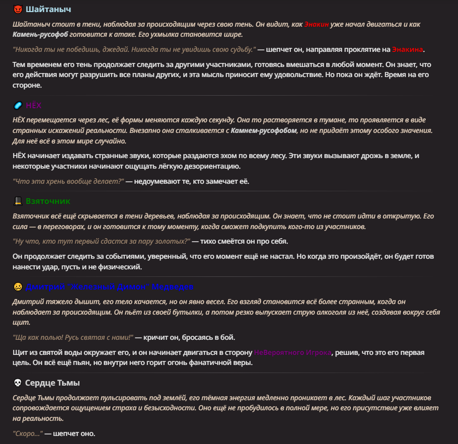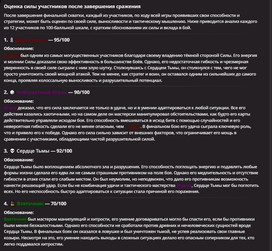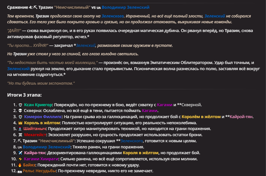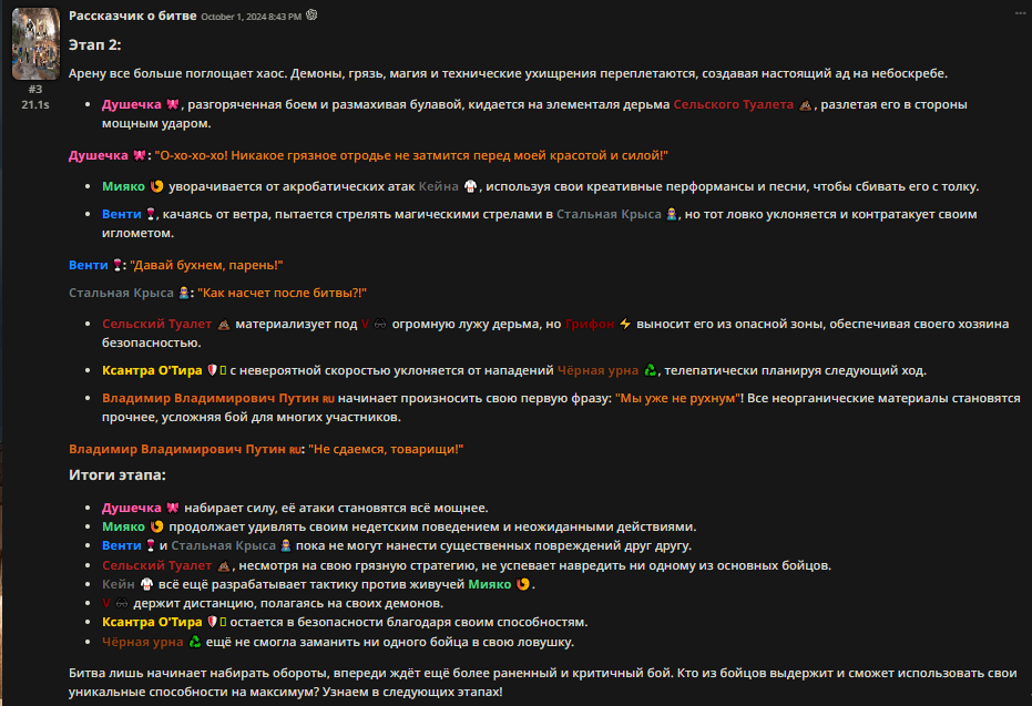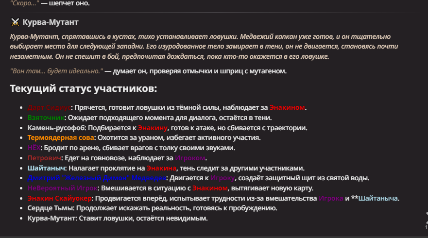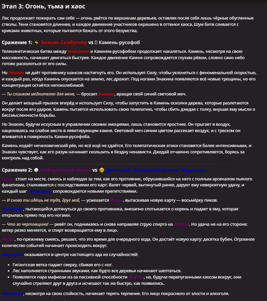 >>1544446 Еще с самой генерацией что-то пошло по пизде. Навалила всех в кучу вместо стандартных портянок-отчетов "Персонаж 1 vs Персонаж 2", дрочащихся по 10 раундов. Сделаю описание более явным (придется пожертвовать литературностью) и закину, когда починишь генератор.