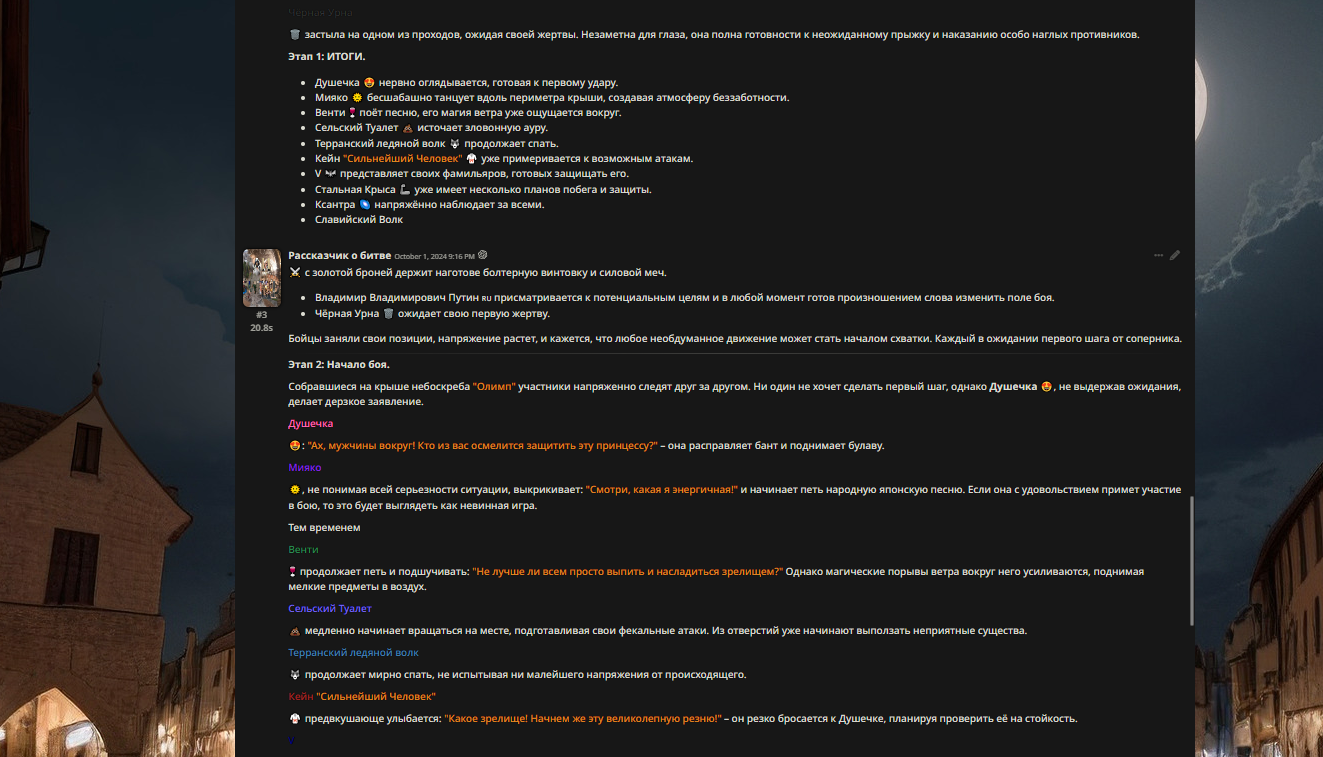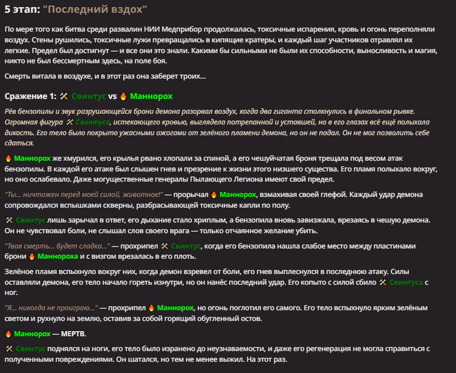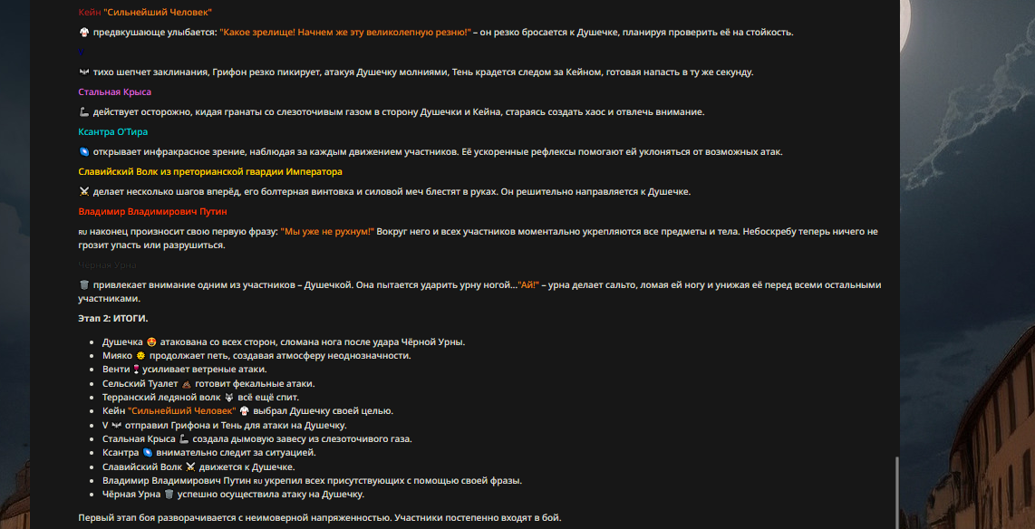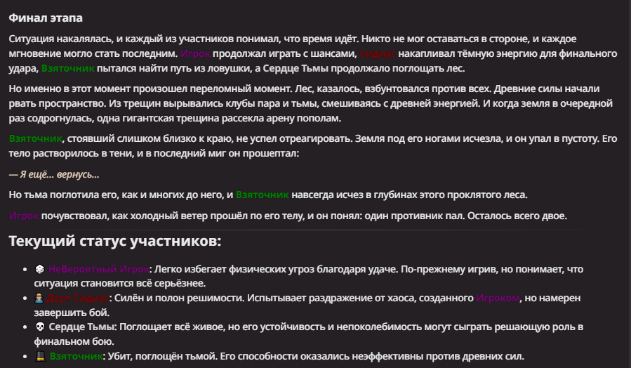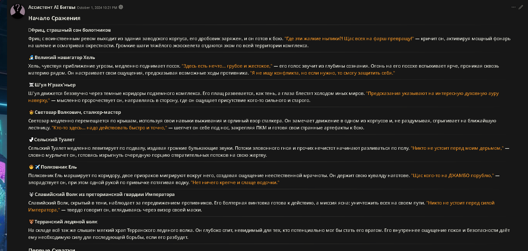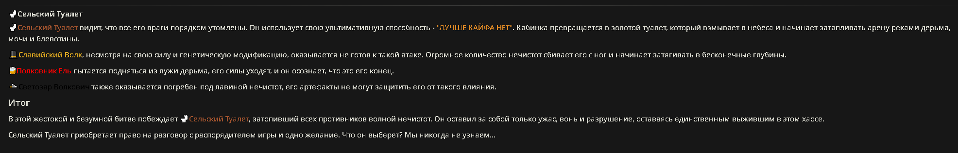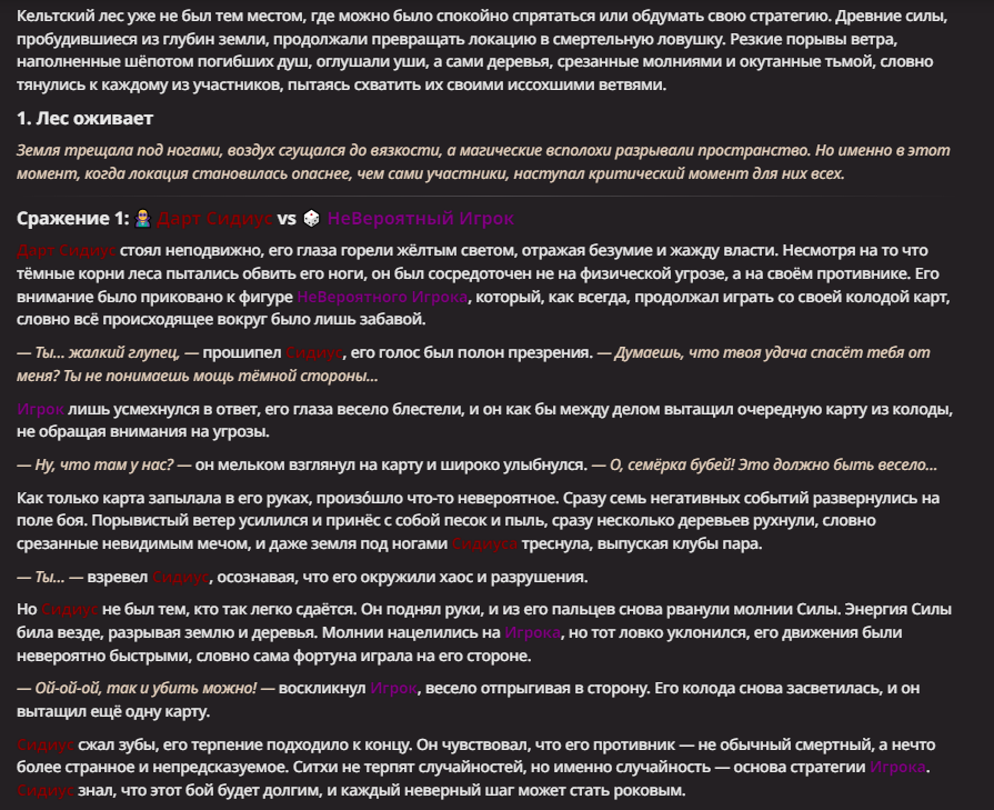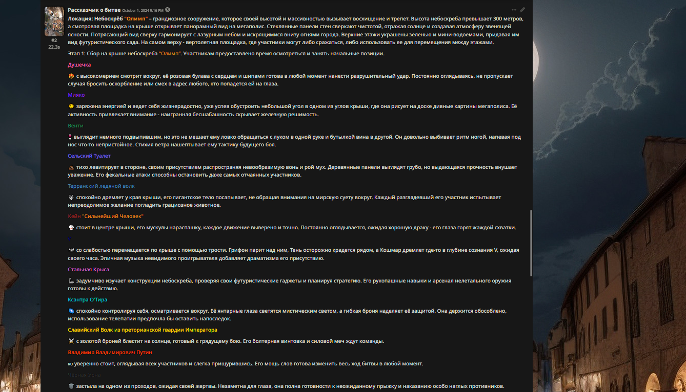 >>1544446 Еще с самой генерацией что-то пошло по пизде. Навалила всех в кучу вместо стандартных портянок-отчетов "Персонаж 1 vs Персонаж 2", дрочащихся по 10 раундов. Сделаю описание более явным (придется пожертвовать литературностью) и закину, когда починишь генератор.