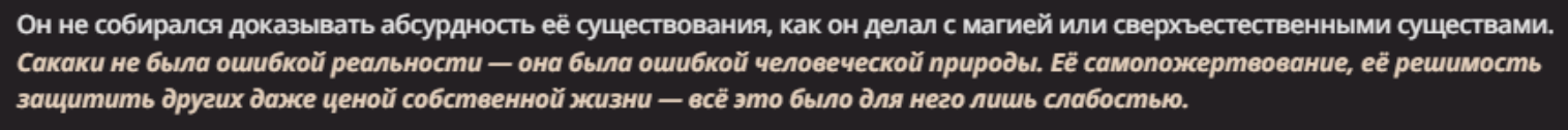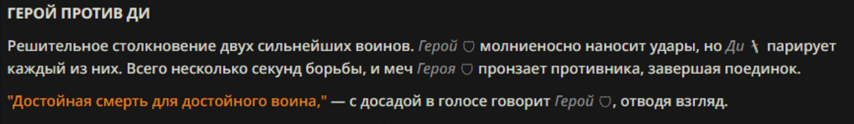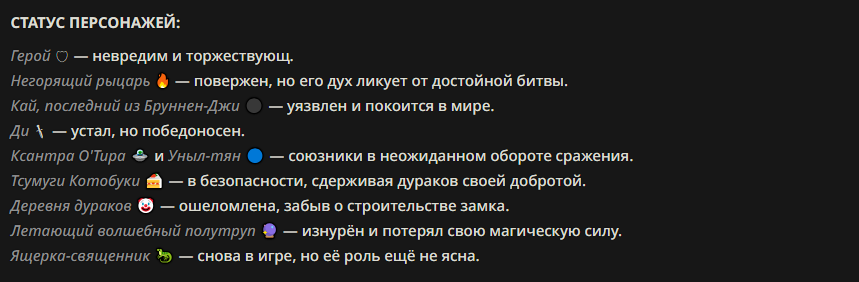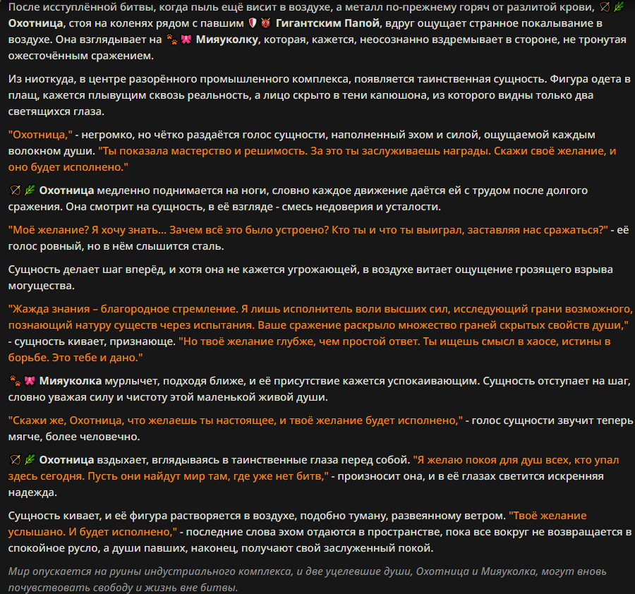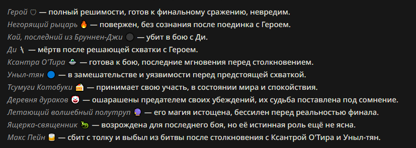 >>1545168 Надо бы завести книгу персонажей, почетно закончивших свой путь. Хотел предложить раньше, но на тот момент я видел только двух таких героев, и оба - мои притом, попали в точку они буквально с первой попытки. Было б как-то уныло. Но сейчас уже есть и другие.