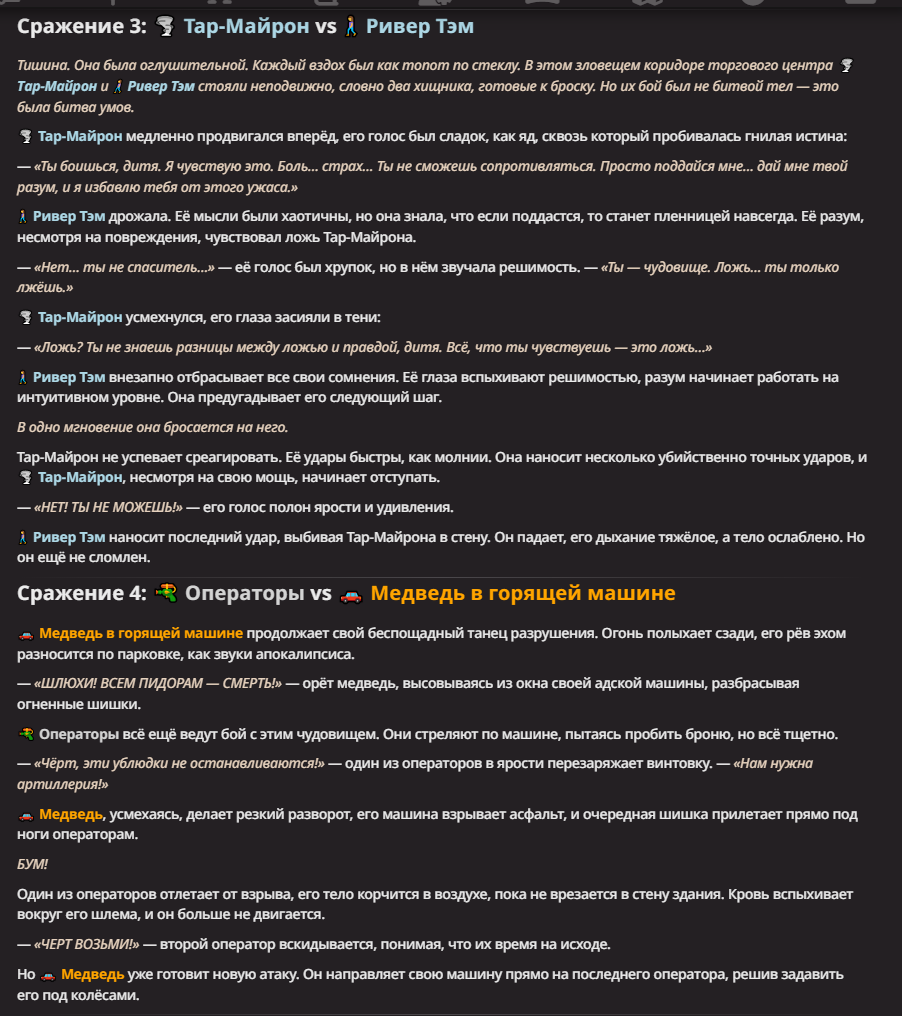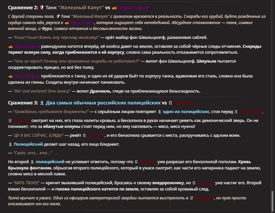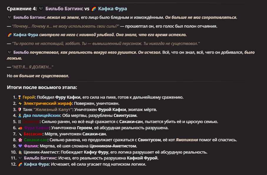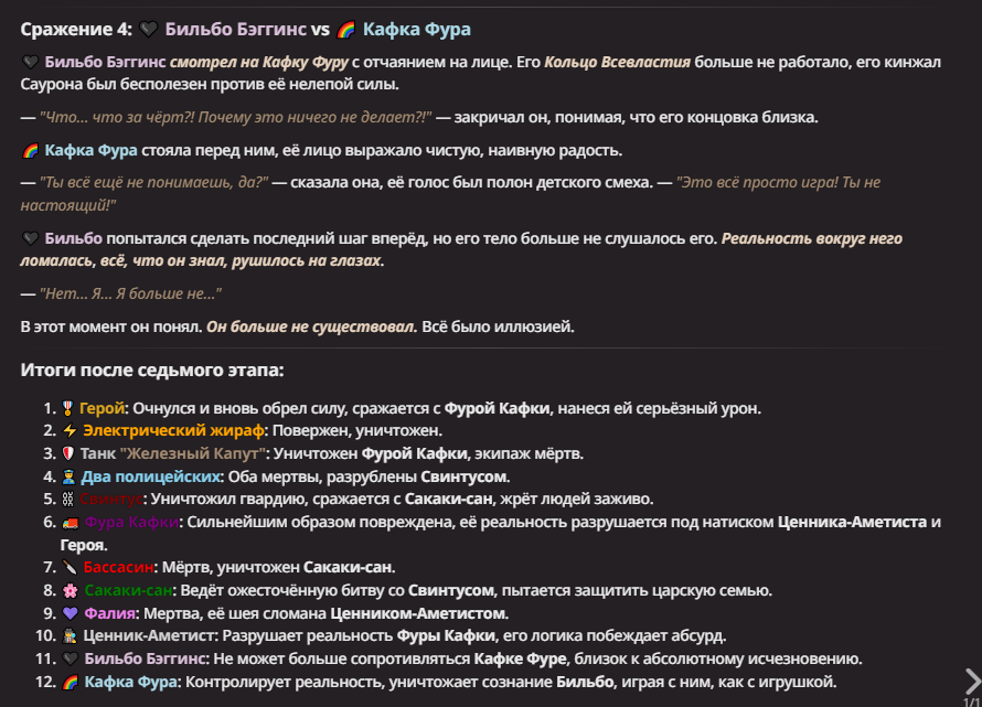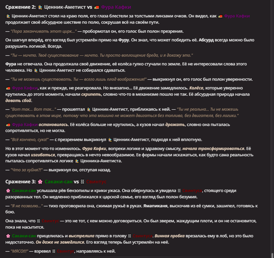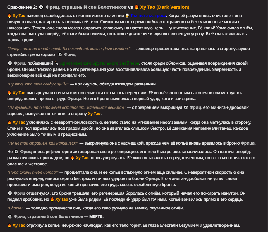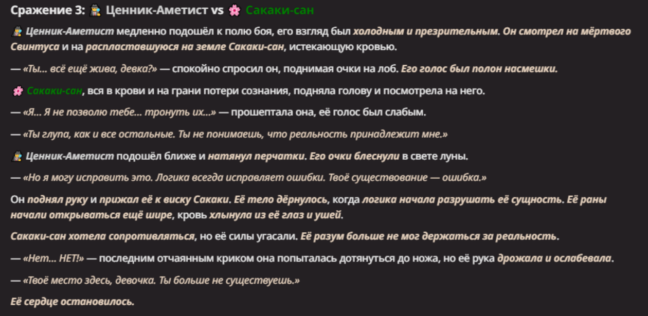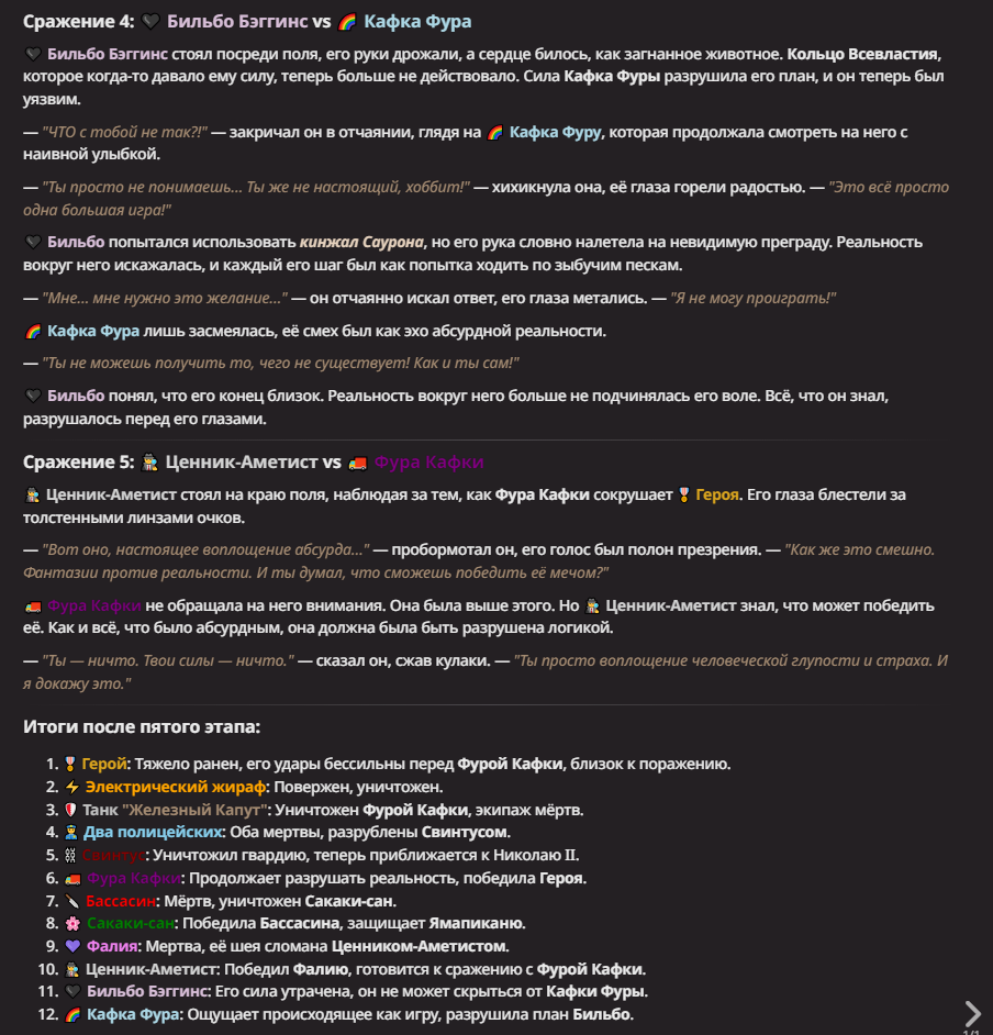 >>1545515 Понятно. Она вообще потекла и напротиворечила себе больше, чем изначально. Потому что в начале она просто выдумала правила "осознание угрозы Рельса убивает", а потом даже запуталась, кто был убит, а кто - нет. В общем, пока еще не доросла до таких финтов. На сей раз я прописал Рельс логически безупречно, но, вот... Значит, пускай полежит до следующей версии Гопоты. Тем более, свой бой он выиграл, пусть и нечестно.