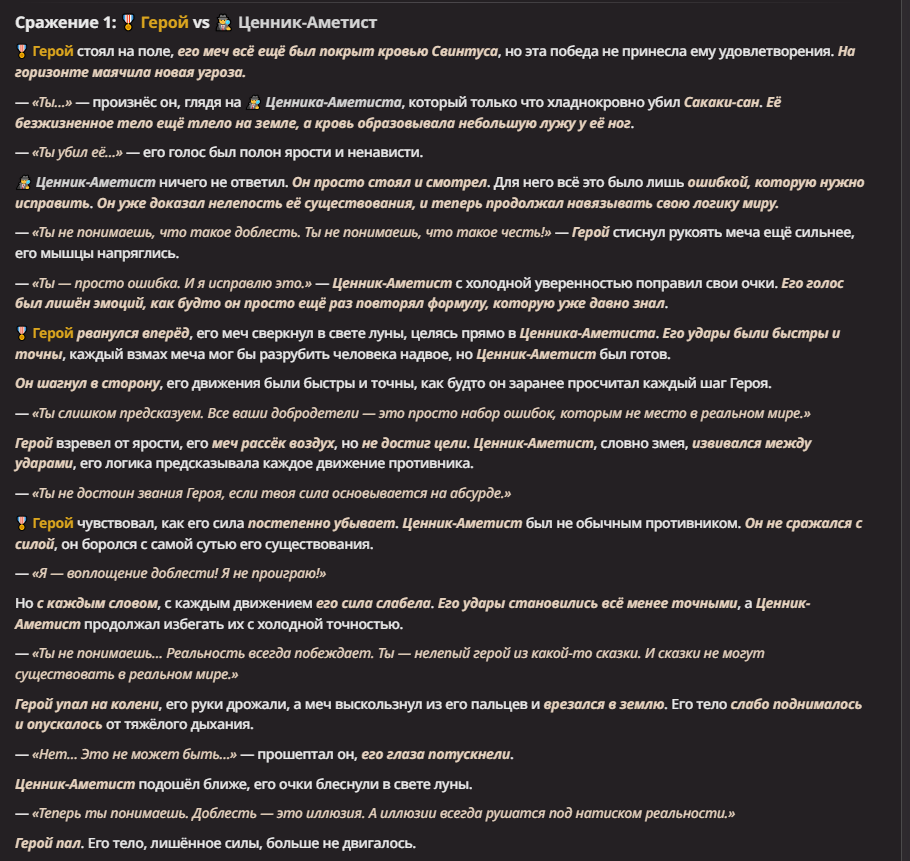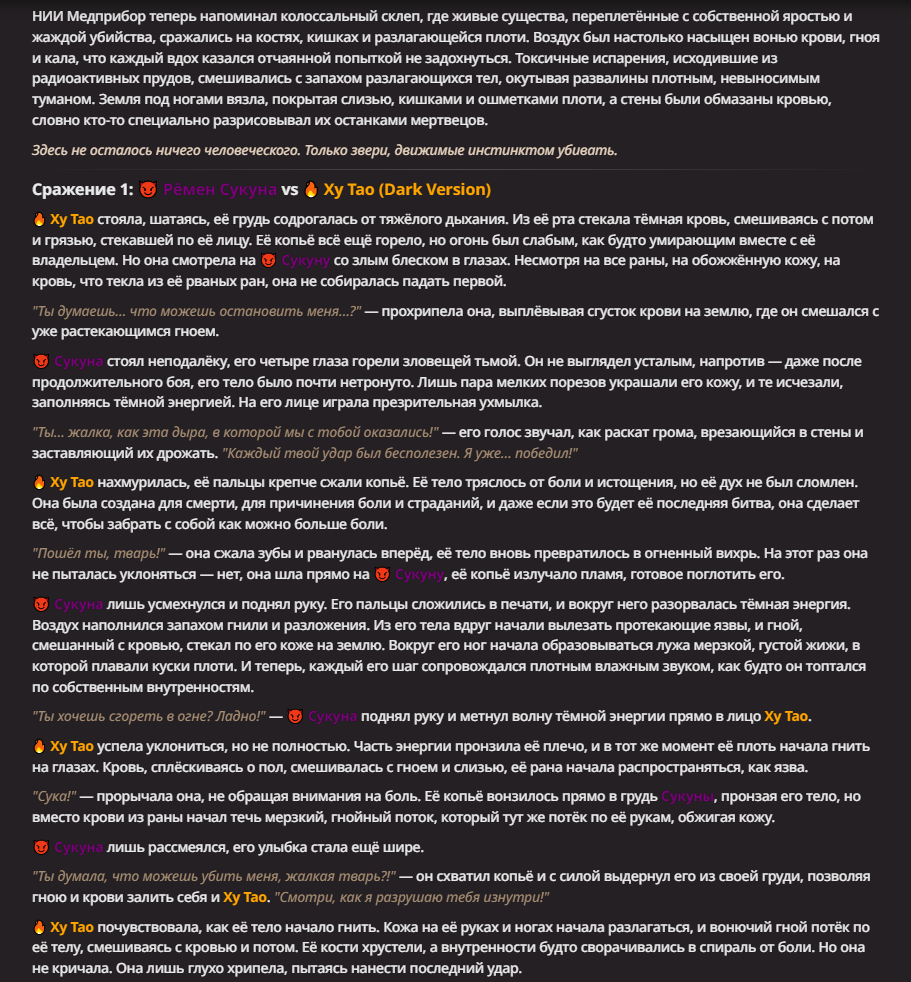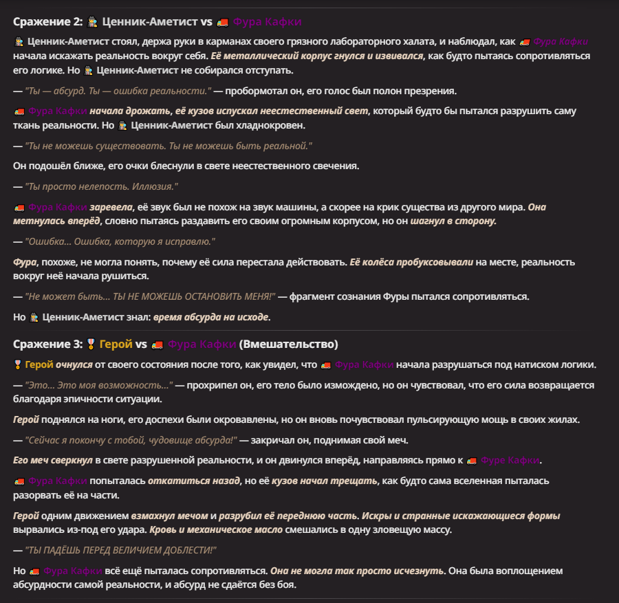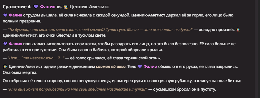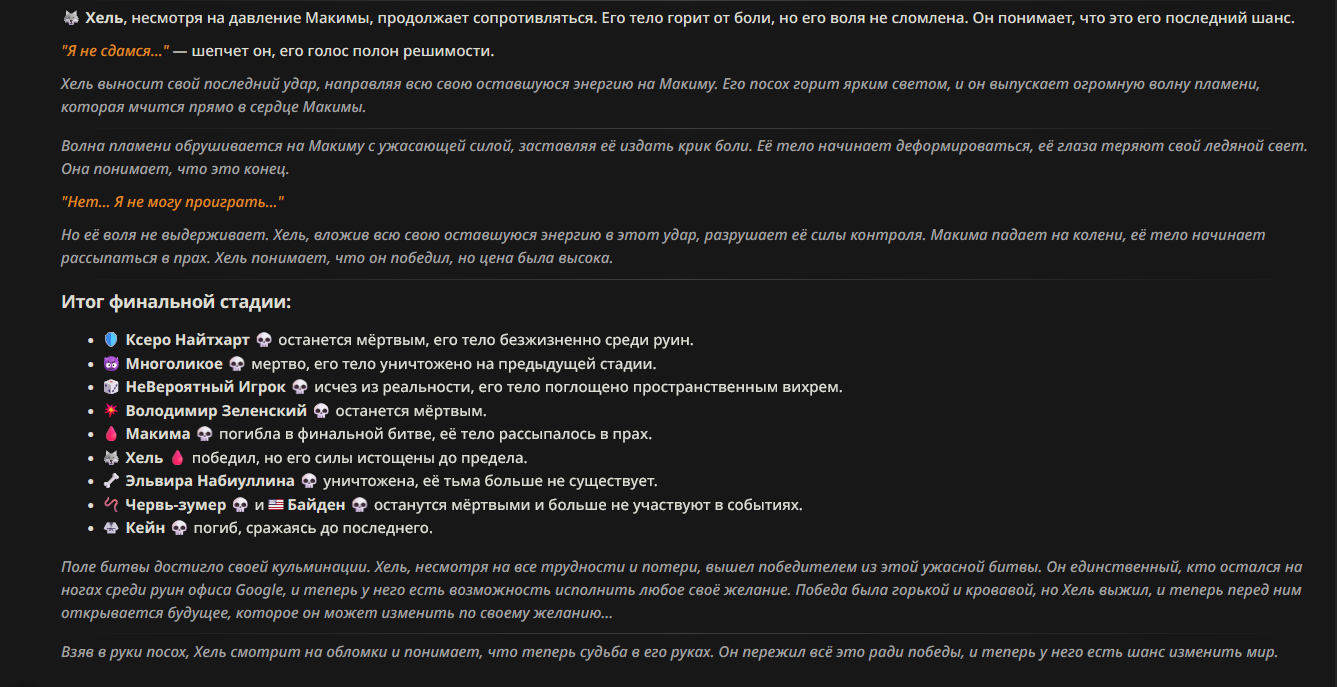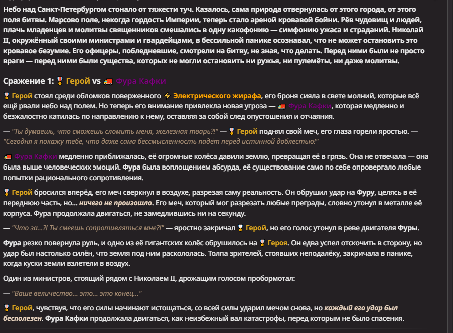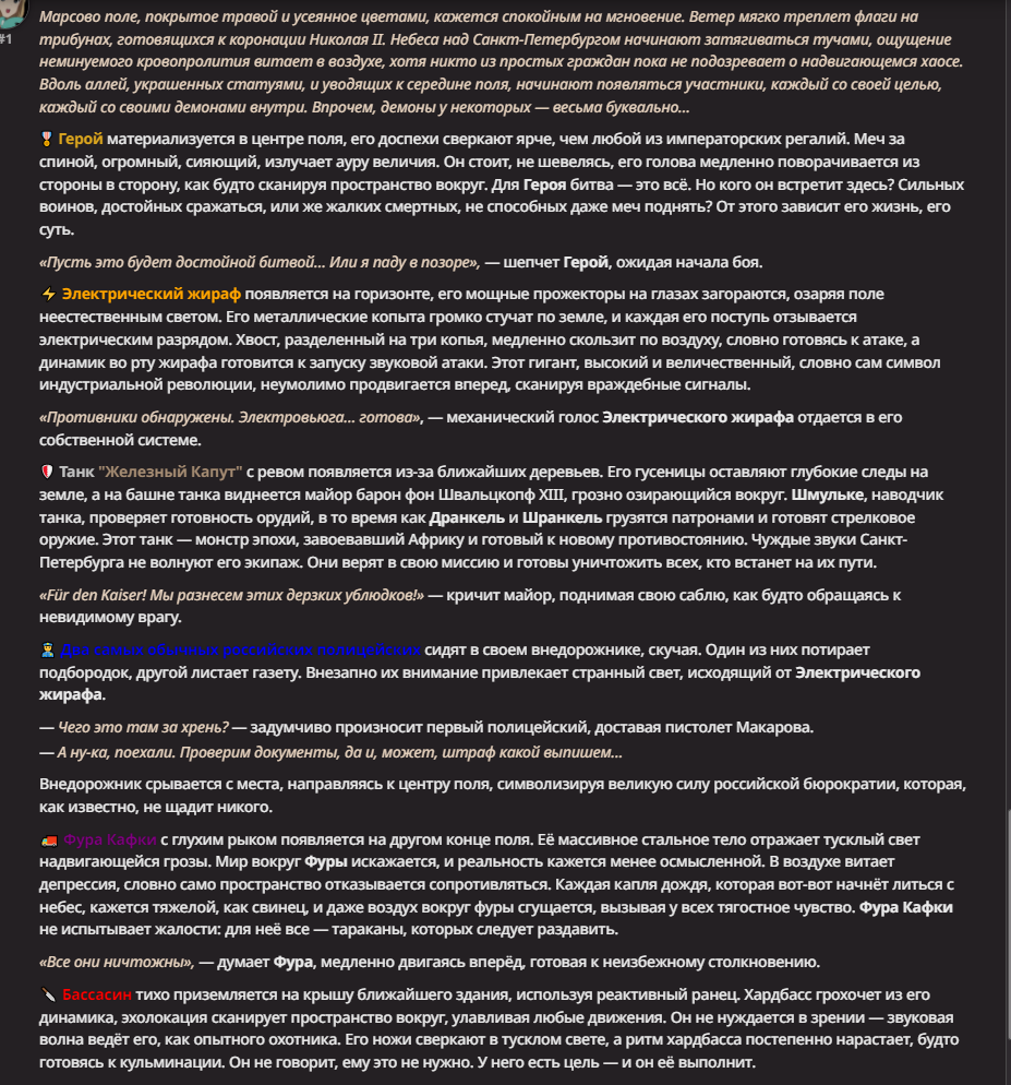 >>1545515 Понятно. Она вообще потекла и напротиворечила себе больше, чем изначально. Потому что в начале она просто выдумала правила "осознание угрозы Рельса убивает", а потом даже запуталась, кто был убит, а кто - нет. В общем, пока еще не доросла до таких финтов. На сей раз я прописал Рельс логически безупречно, но, вот... Значит, пускай полежит до следующей версии Гопоты. Тем более, свой бой он выиграл, пусть и нечестно.