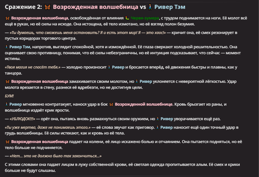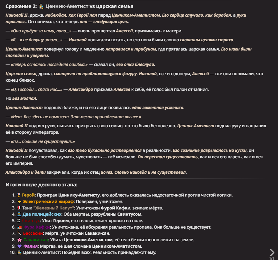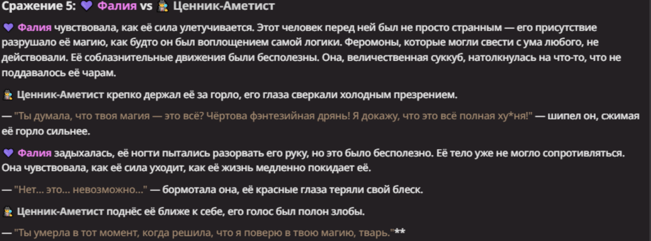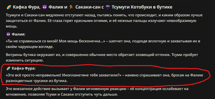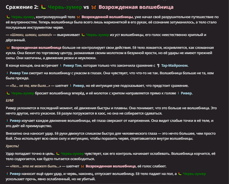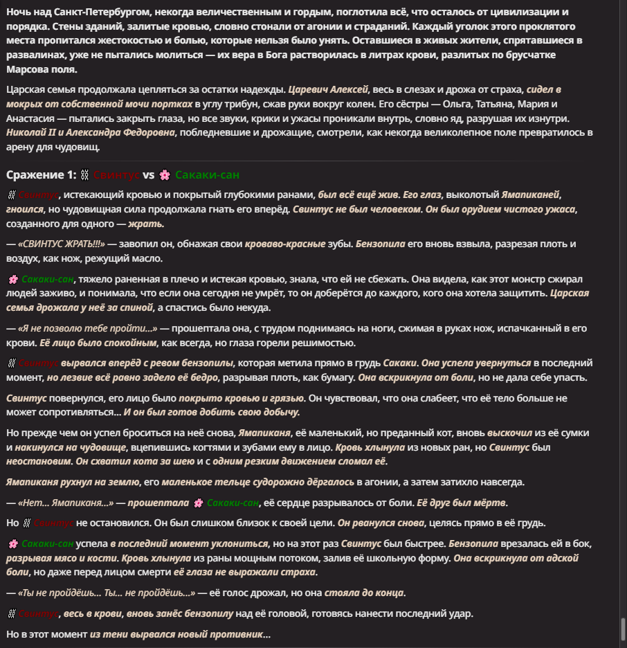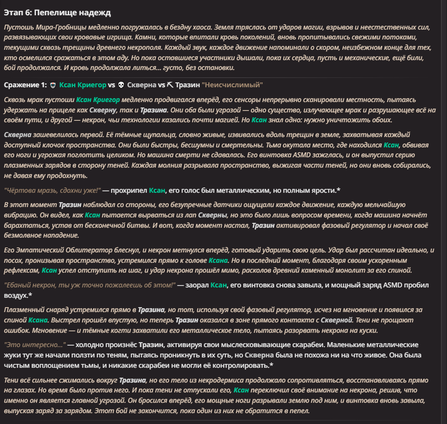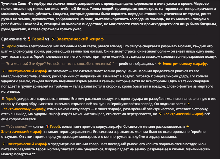 >>1545515 Понятно. Она вообще потекла и напротиворечила себе больше, чем изначально. Потому что в начале она просто выдумала правила "осознание угрозы Рельса убивает", а потом даже запуталась, кто был убит, а кто - нет. В общем, пока еще не доросла до таких финтов. На сей раз я прописал Рельс логически безупречно, но, вот... Значит, пускай полежит до следующей версии Гопоты. Тем более, свой бой он выиграл, пусть и нечестно.