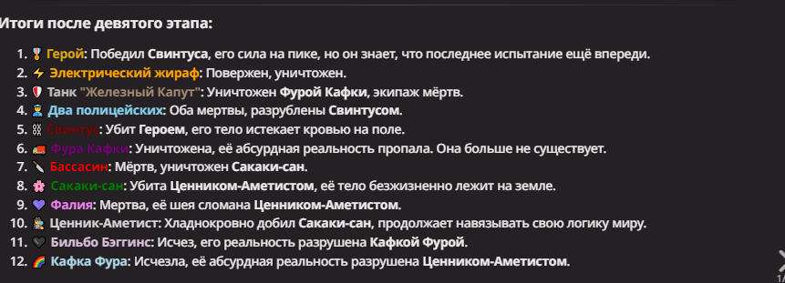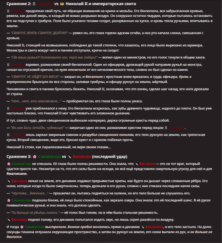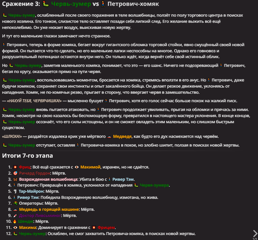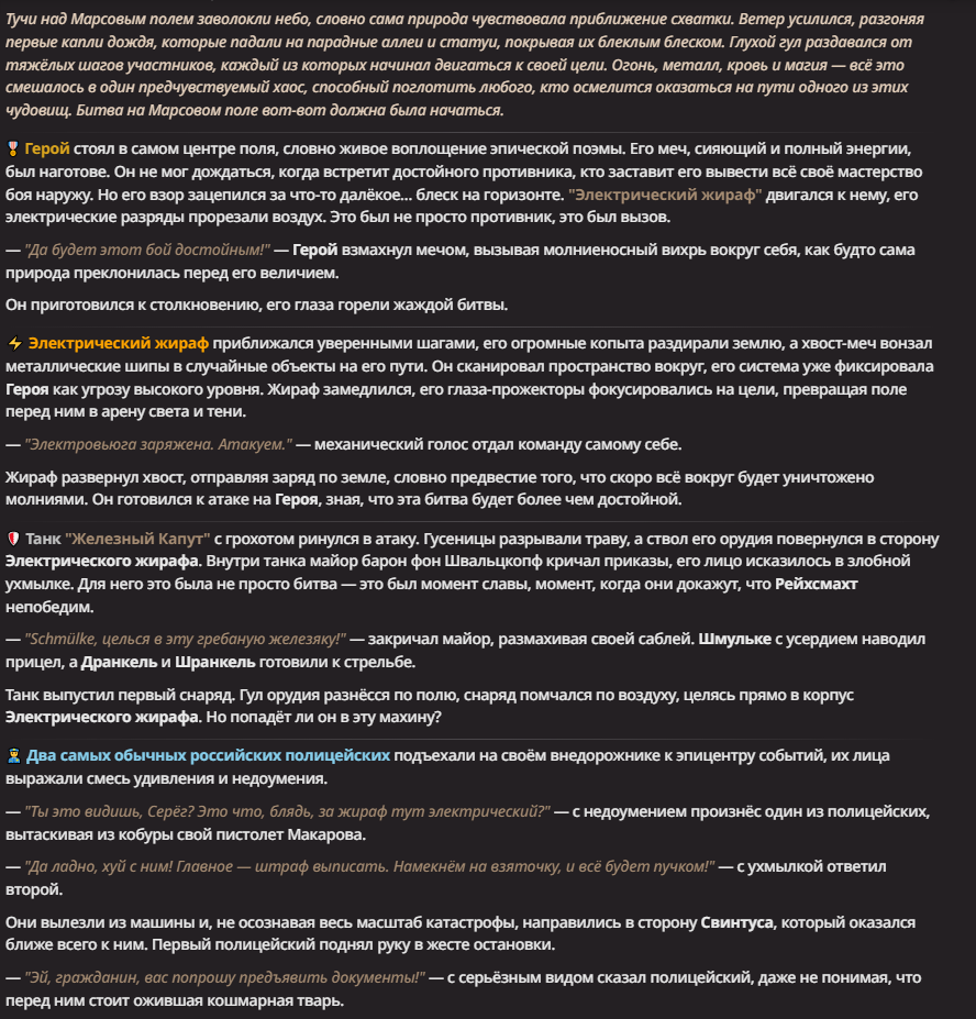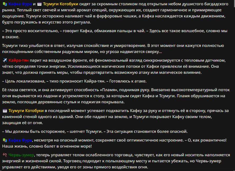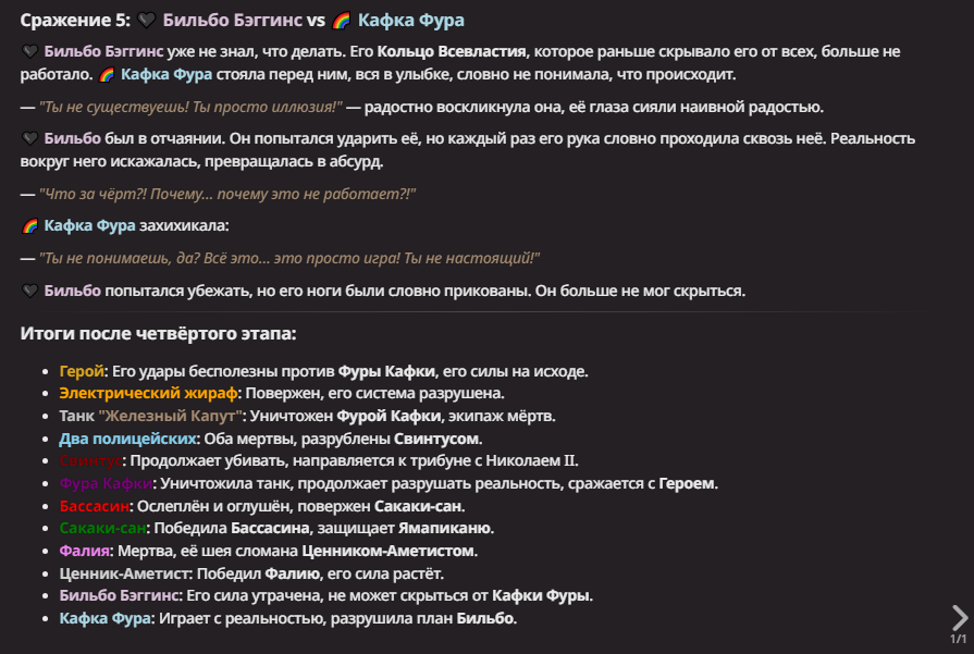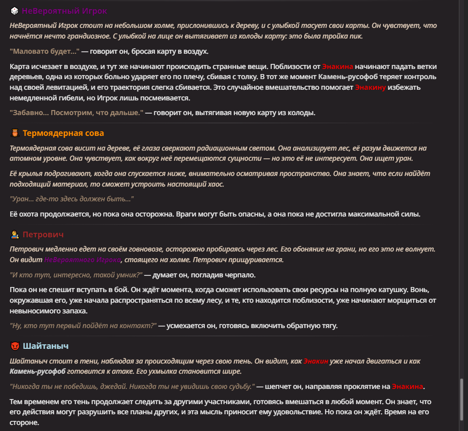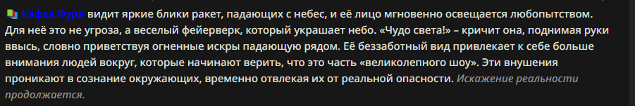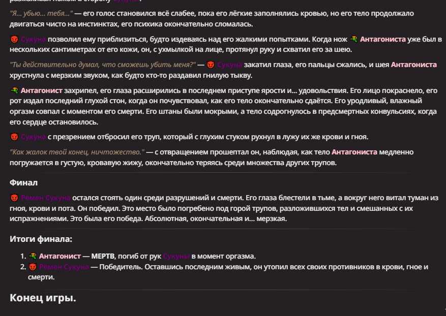 >>1545515 Понятно. Она вообще потекла и напротиворечила себе больше, чем изначально. Потому что в начале она просто выдумала правила "осознание угрозы Рельса убивает", а потом даже запуталась, кто был убит, а кто - нет. В общем, пока еще не доросла до таких финтов. На сей раз я прописал Рельс логически безупречно, но, вот... Значит, пускай полежит до следующей версии Гопоты. Тем более, свой бой он выиграл, пусть и нечестно.