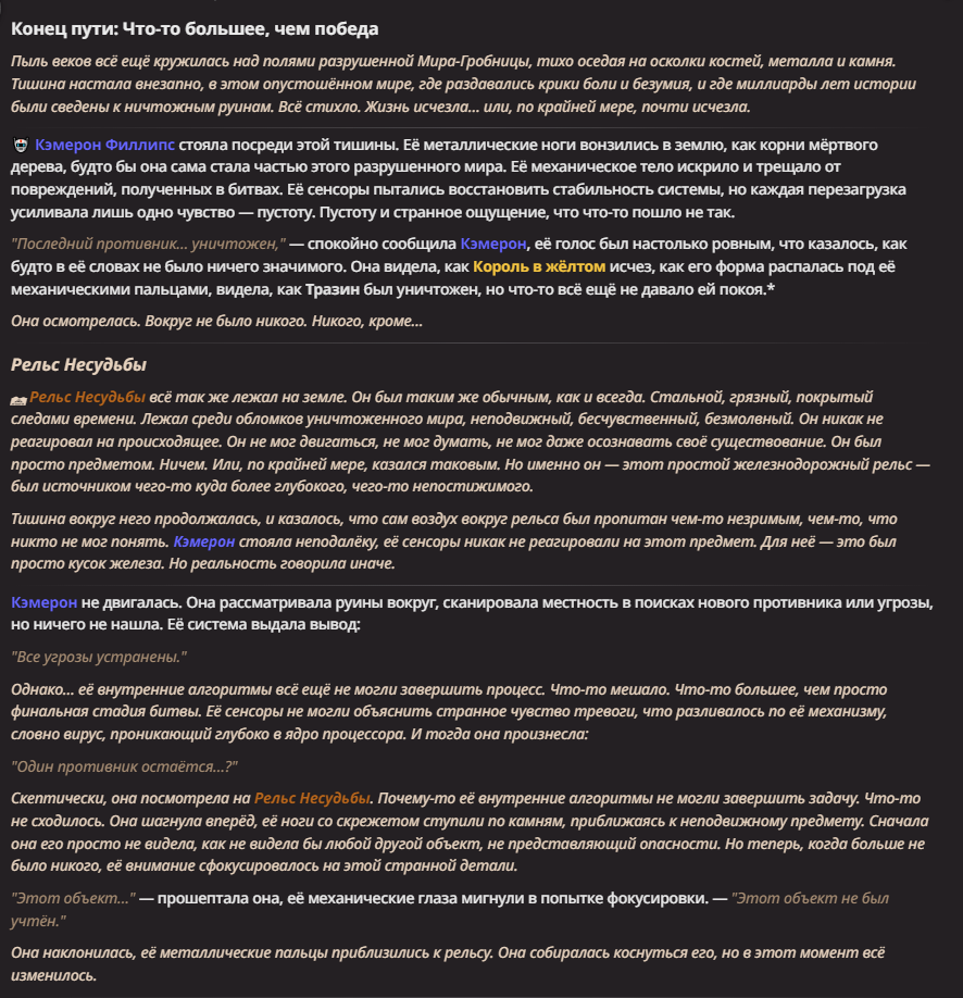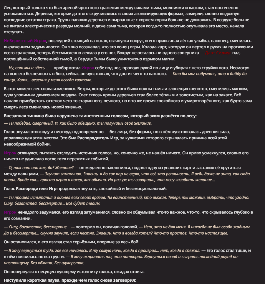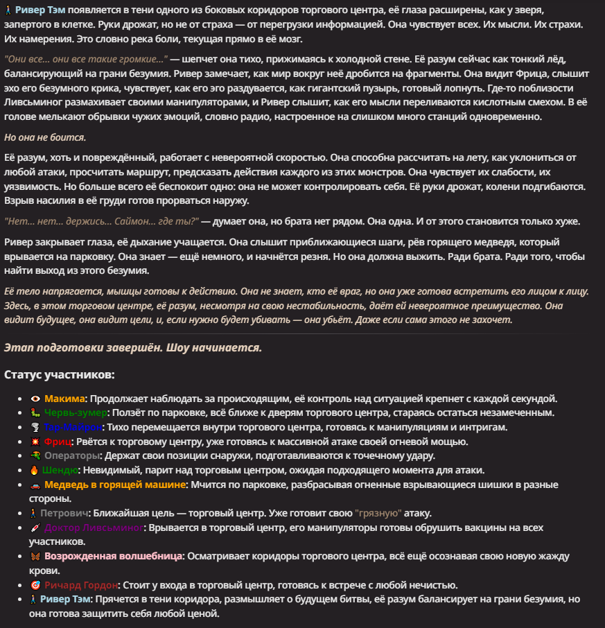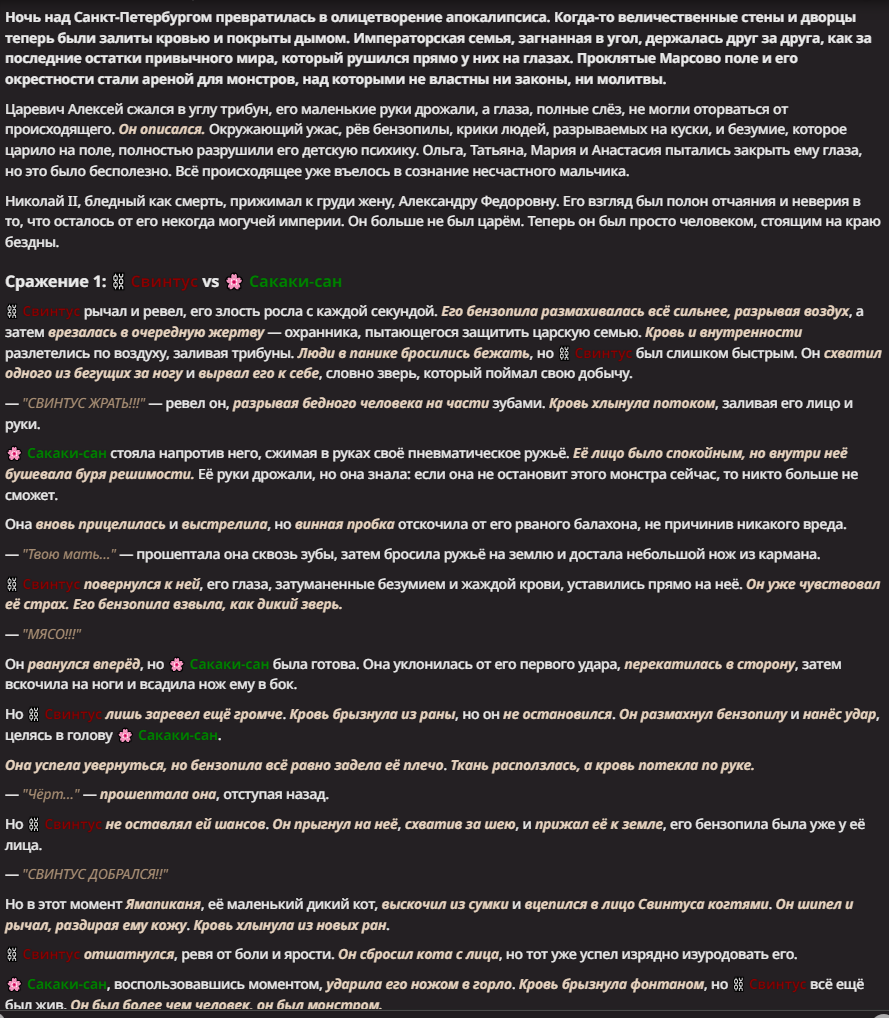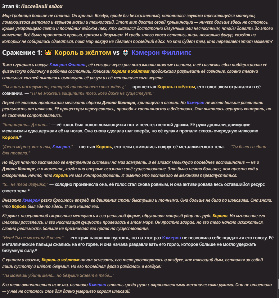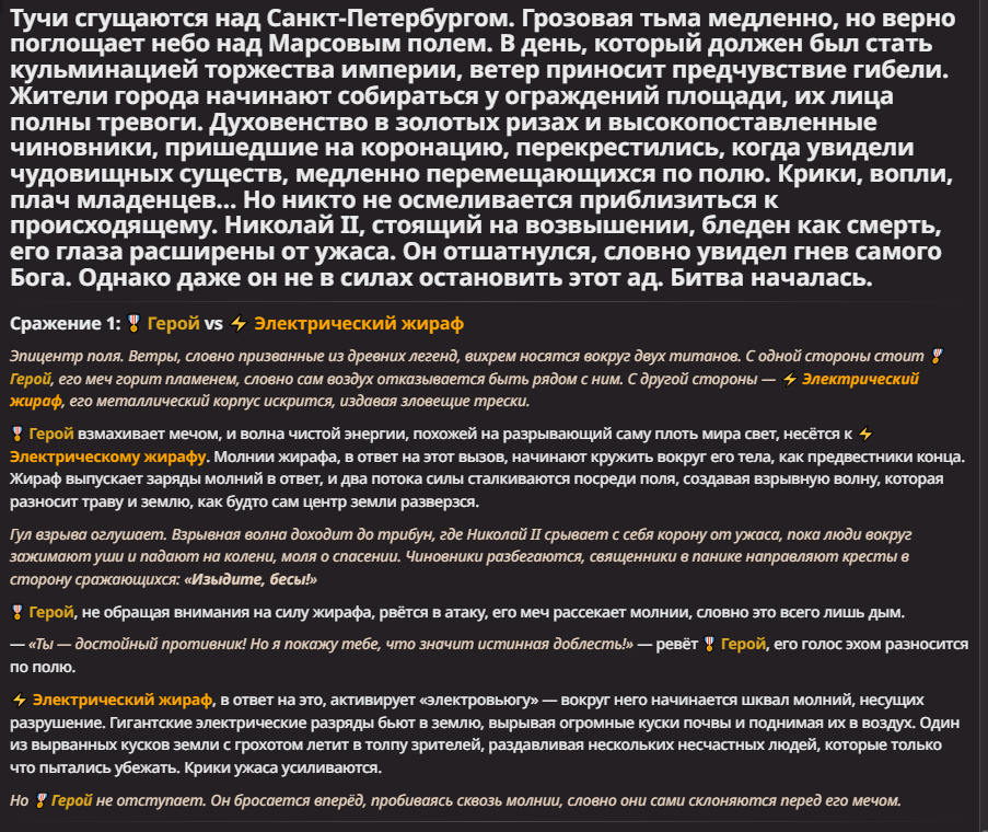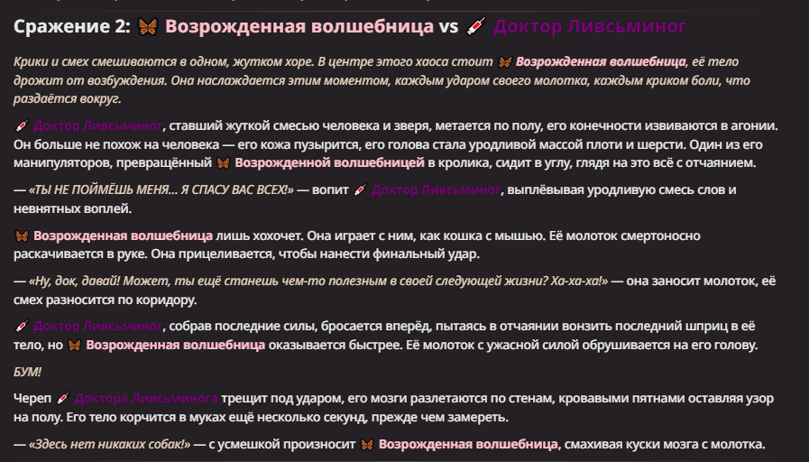 >>1545515 Понятно. Она вообще потекла и напротиворечила себе больше, чем изначально. Потому что в начале она просто выдумала правила "осознание угрозы Рельса убивает", а потом даже запуталась, кто был убит, а кто - нет. В общем, пока еще не доросла до таких финтов. На сей раз я прописал Рельс логически безупречно, но, вот... Значит, пускай полежит до следующей версии Гопоты. Тем более, свой бой он выиграл, пусть и нечестно.