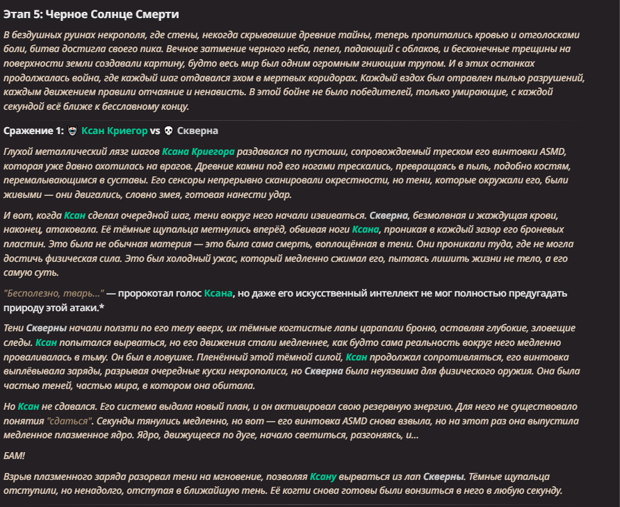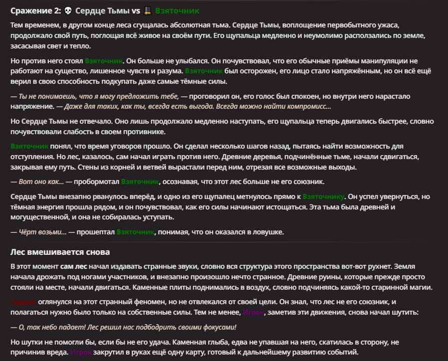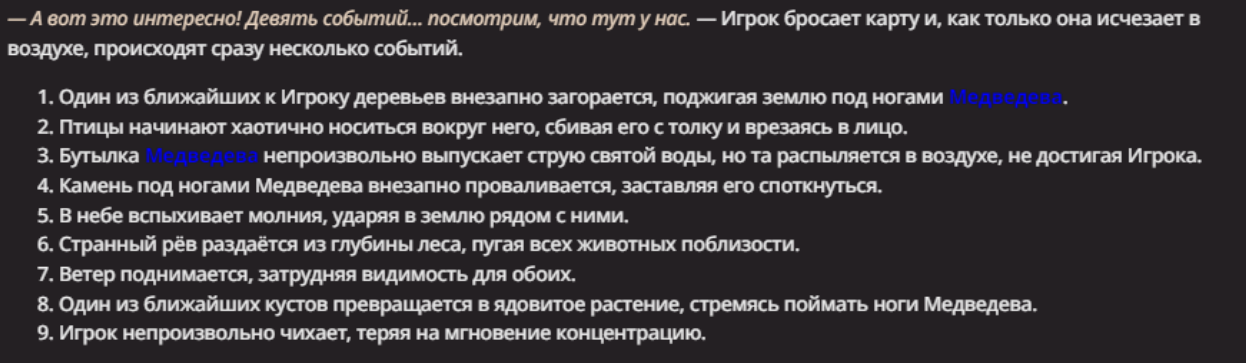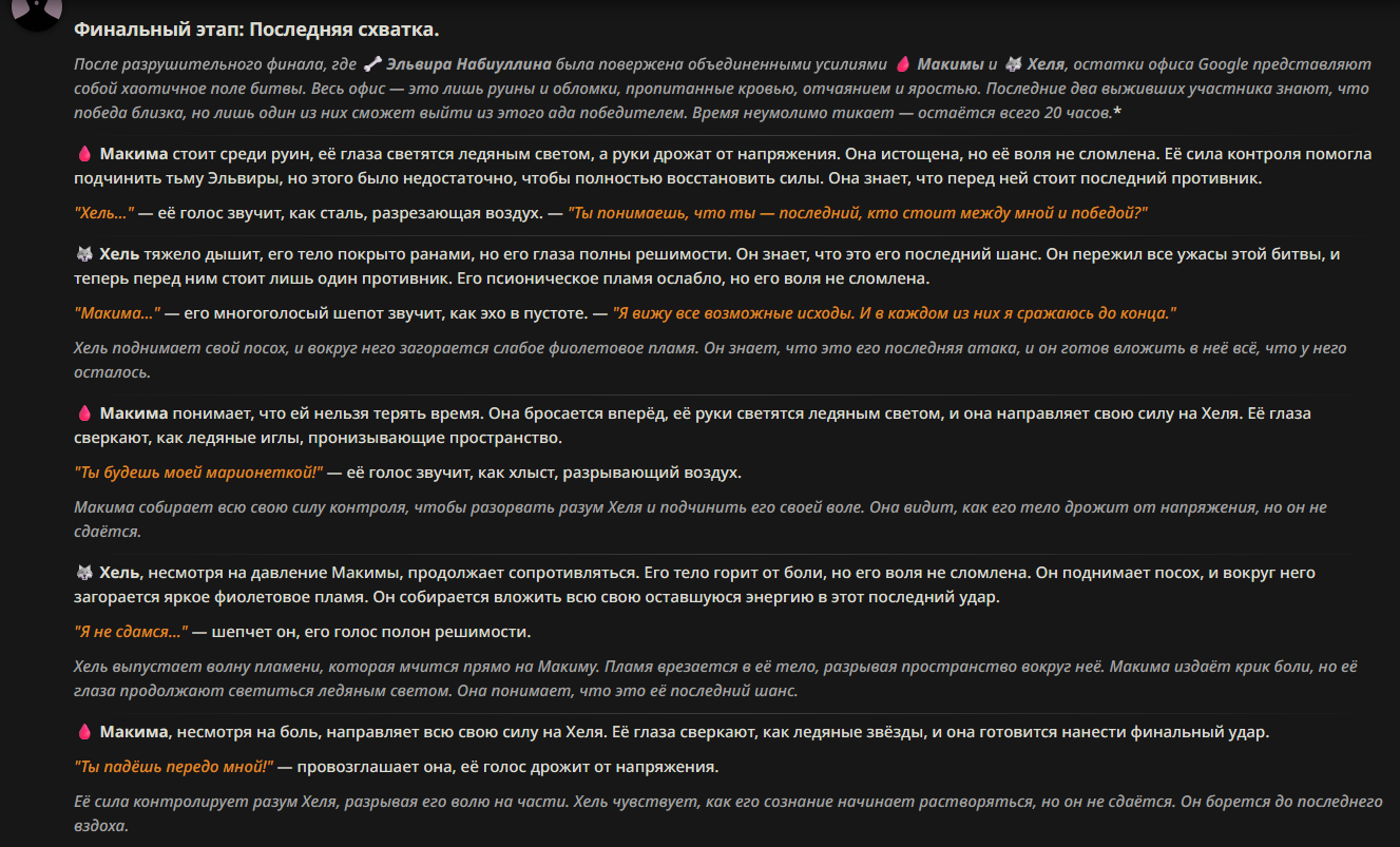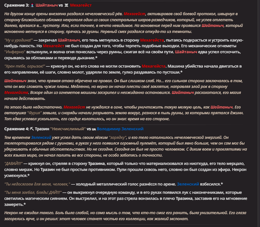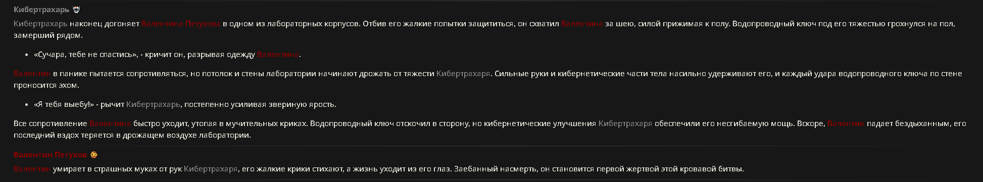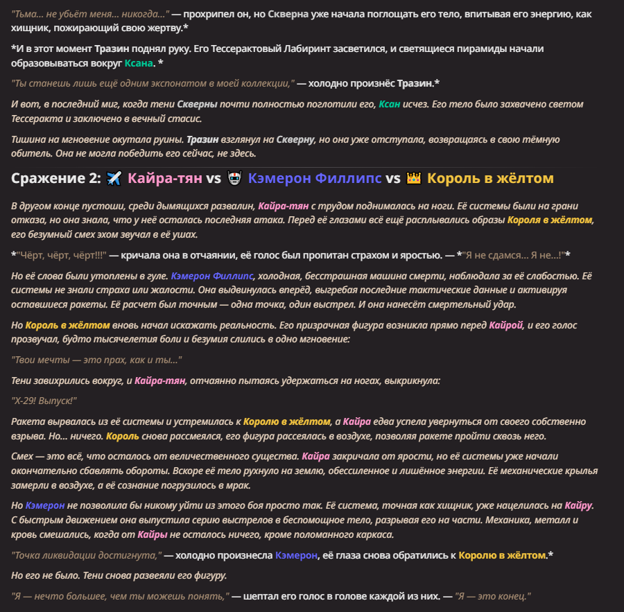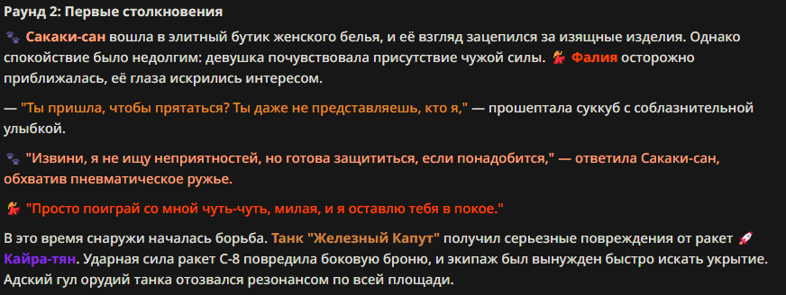 >>1545515 Понятно. Она вообще потекла и напротиворечила себе больше, чем изначально. Потому что в начале она просто выдумала правила "осознание угрозы Рельса убивает", а потом даже запуталась, кто был убит, а кто - нет. В общем, пока еще не доросла до таких финтов. На сей раз я прописал Рельс логически безупречно, но, вот... Значит, пускай полежит до следующей версии Гопоты. Тем более, свой бой он выиграл, пусть и нечестно.