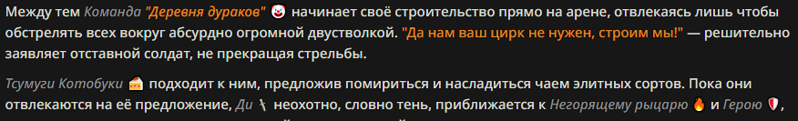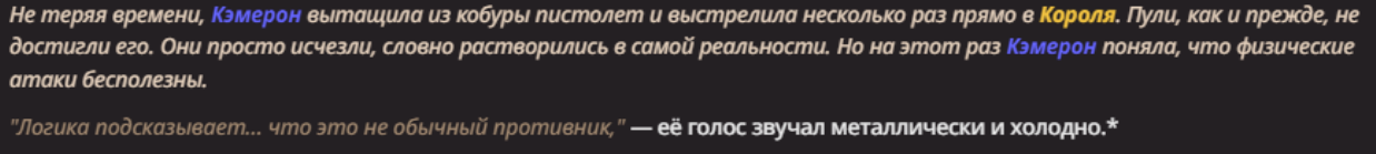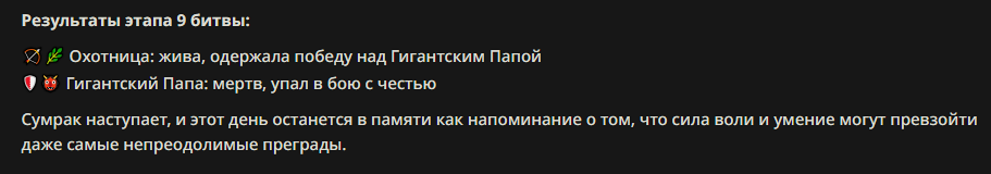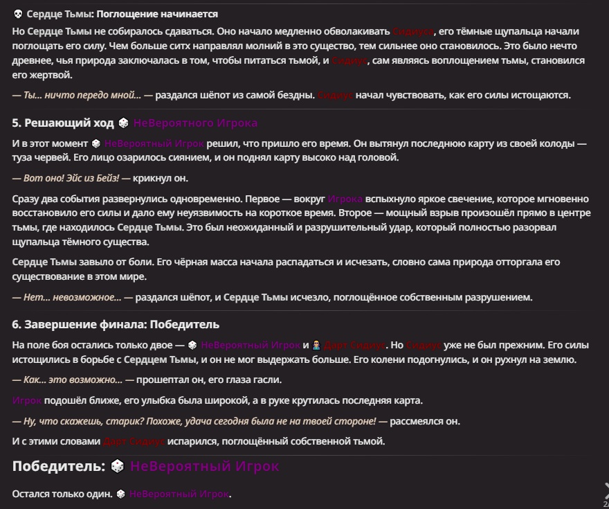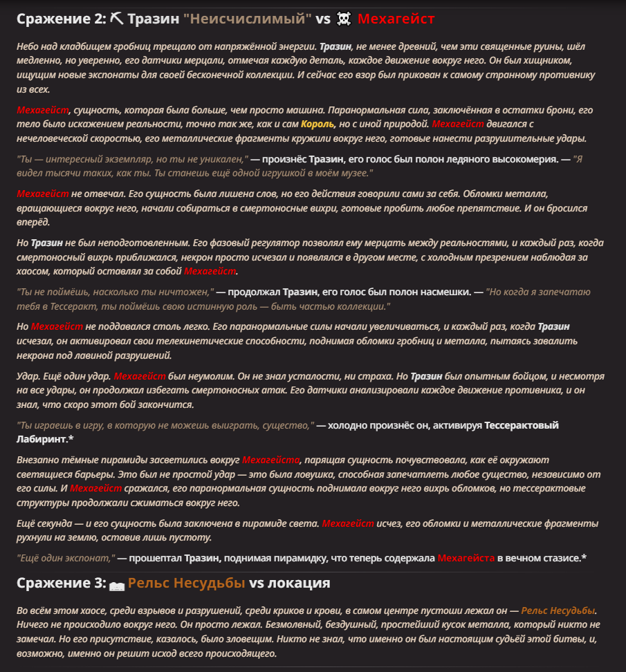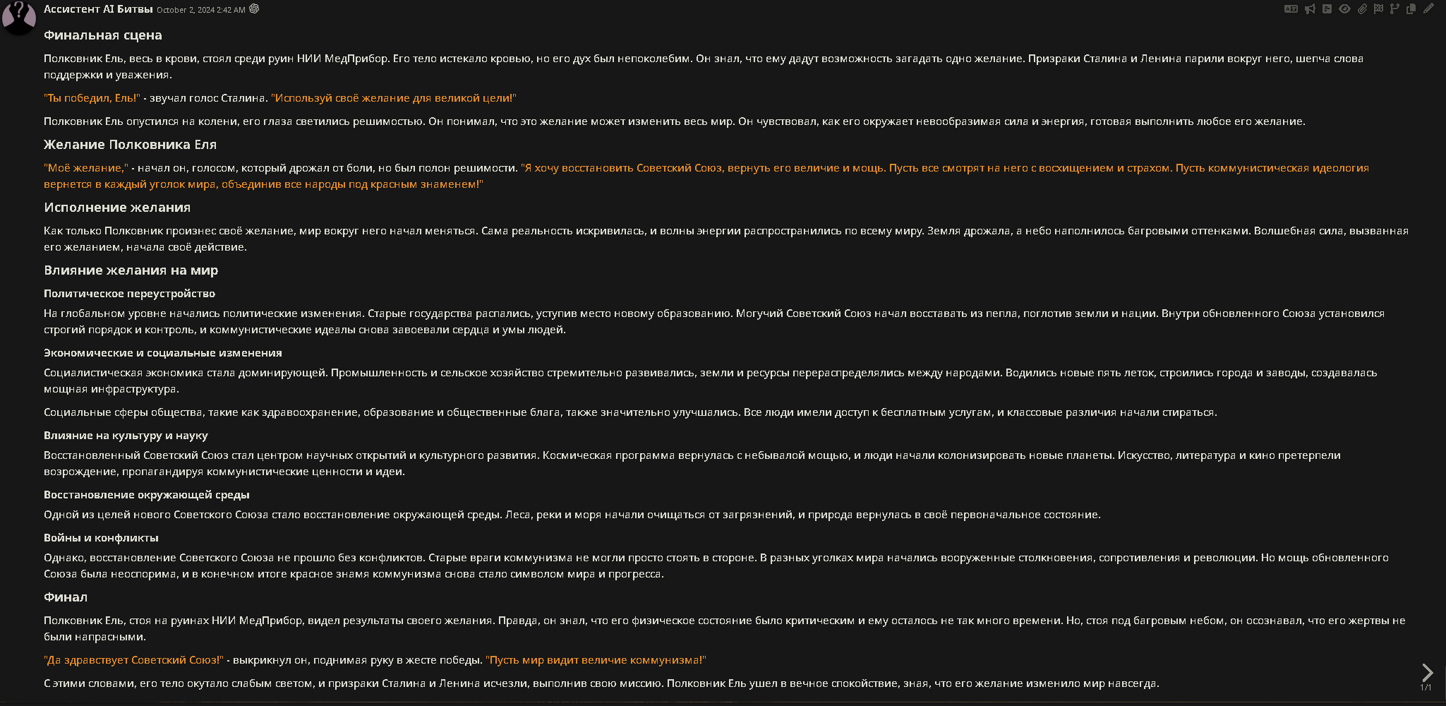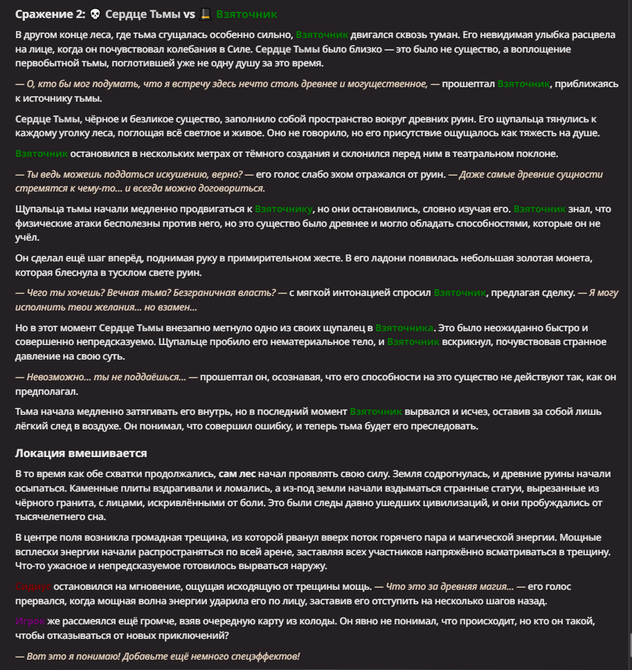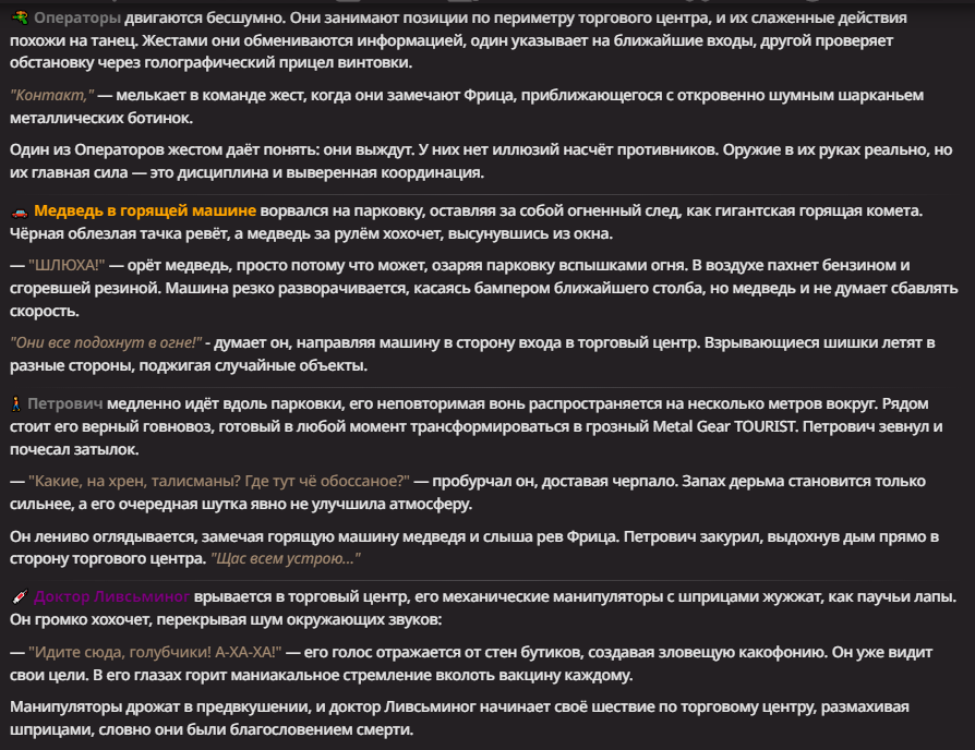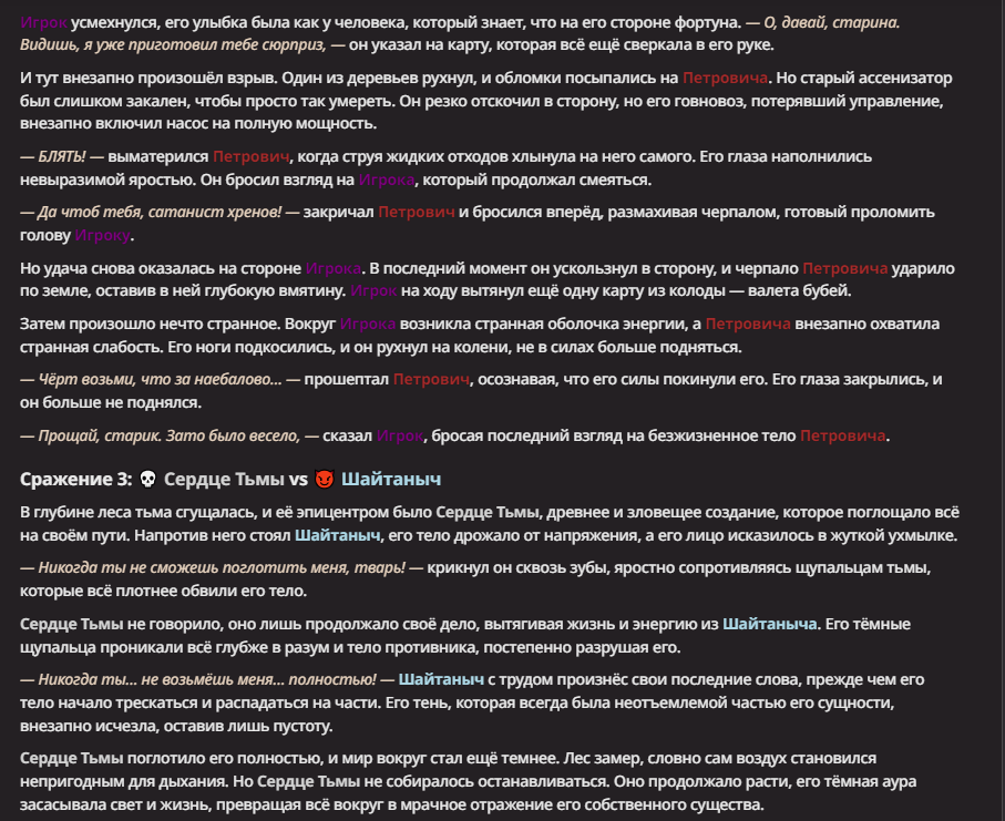 >>1545515 Понятно. Она вообще потекла и напротиворечила себе больше, чем изначально. Потому что в начале она просто выдумала правила "осознание угрозы Рельса убивает", а потом даже запуталась, кто был убит, а кто - нет. В общем, пока еще не доросла до таких финтов. На сей раз я прописал Рельс логически безупречно, но, вот... Значит, пускай полежит до следующей версии Гопоты. Тем более, свой бой он выиграл, пусть и нечестно.