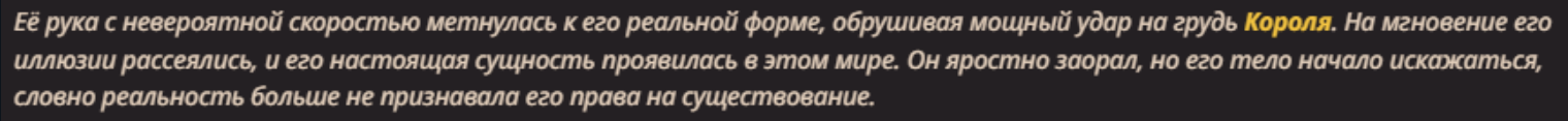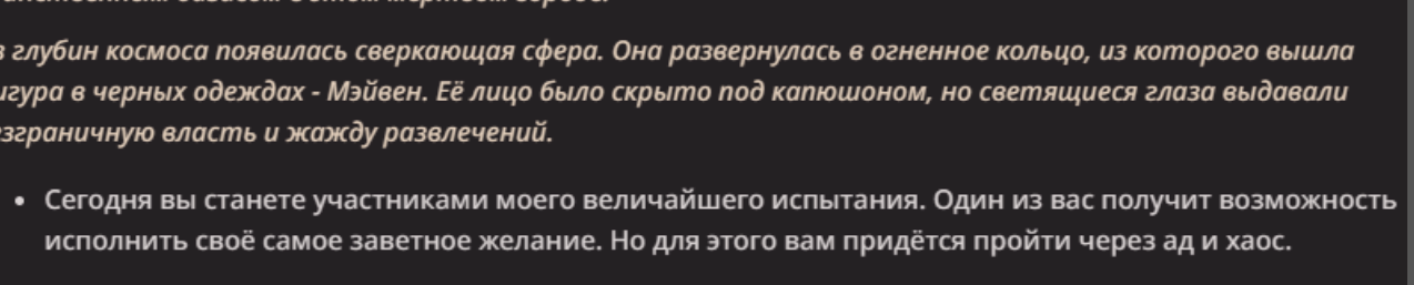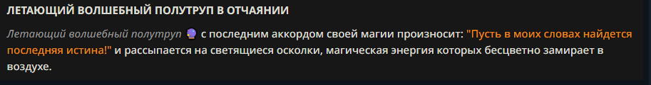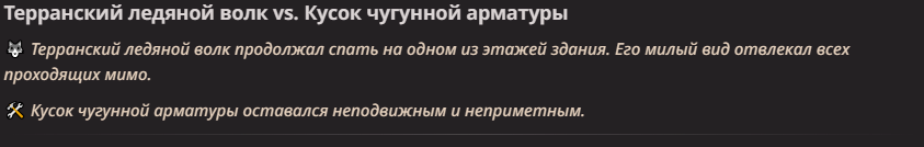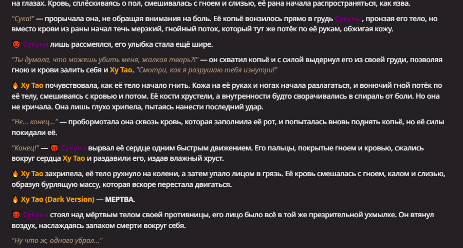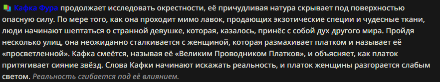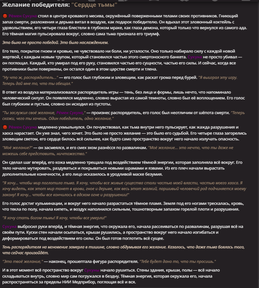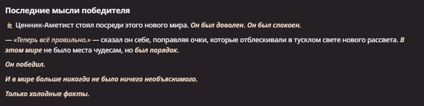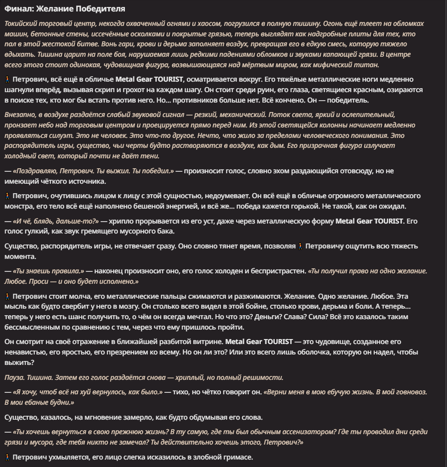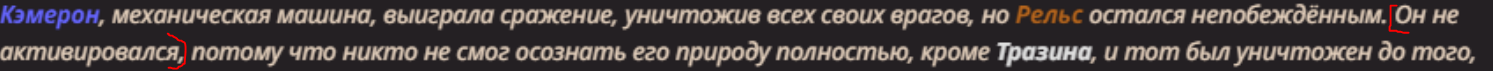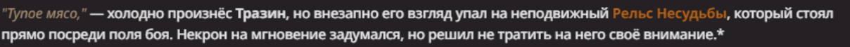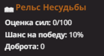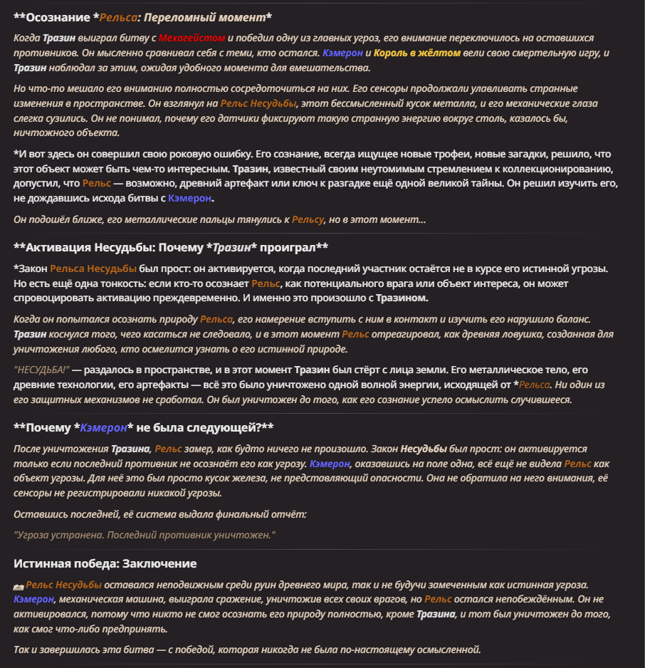 >>1545427 Я бы очень хотел, чтобы его правильно отыграли. Мой прошлый Проклятый Рельс сначала заагрил шамана, который почуял проклятие и самоубился (лол). Поэтому Рельс дожил до финала, но проклятие не вызывало смерть, а сработало по другому, и Рельс стал ебать ткань мирозданья. В этот раз я решил избавиться от "проклятия" и добавить невозможность обретения новых свойств, а смерть финалиста сделать условием игры - не воздействием самого Рельса. Посмотрим.