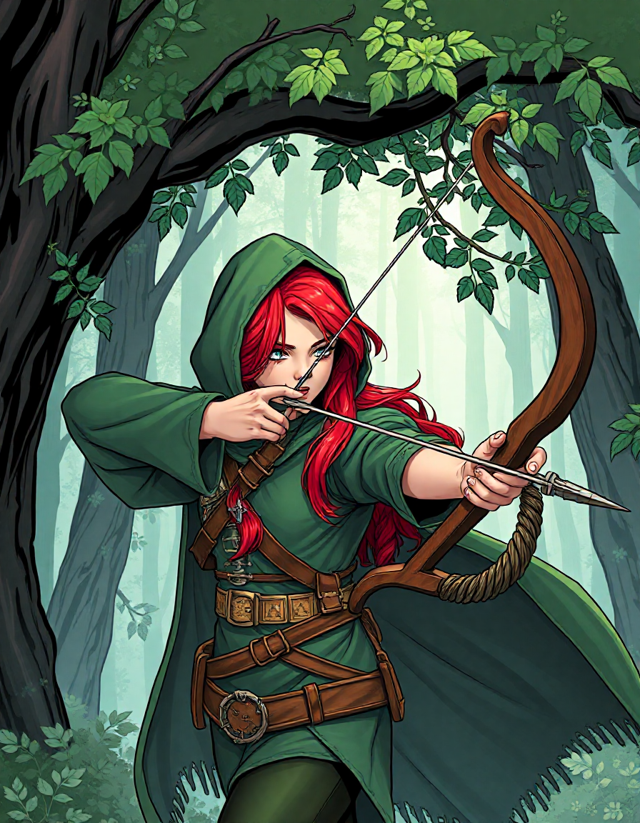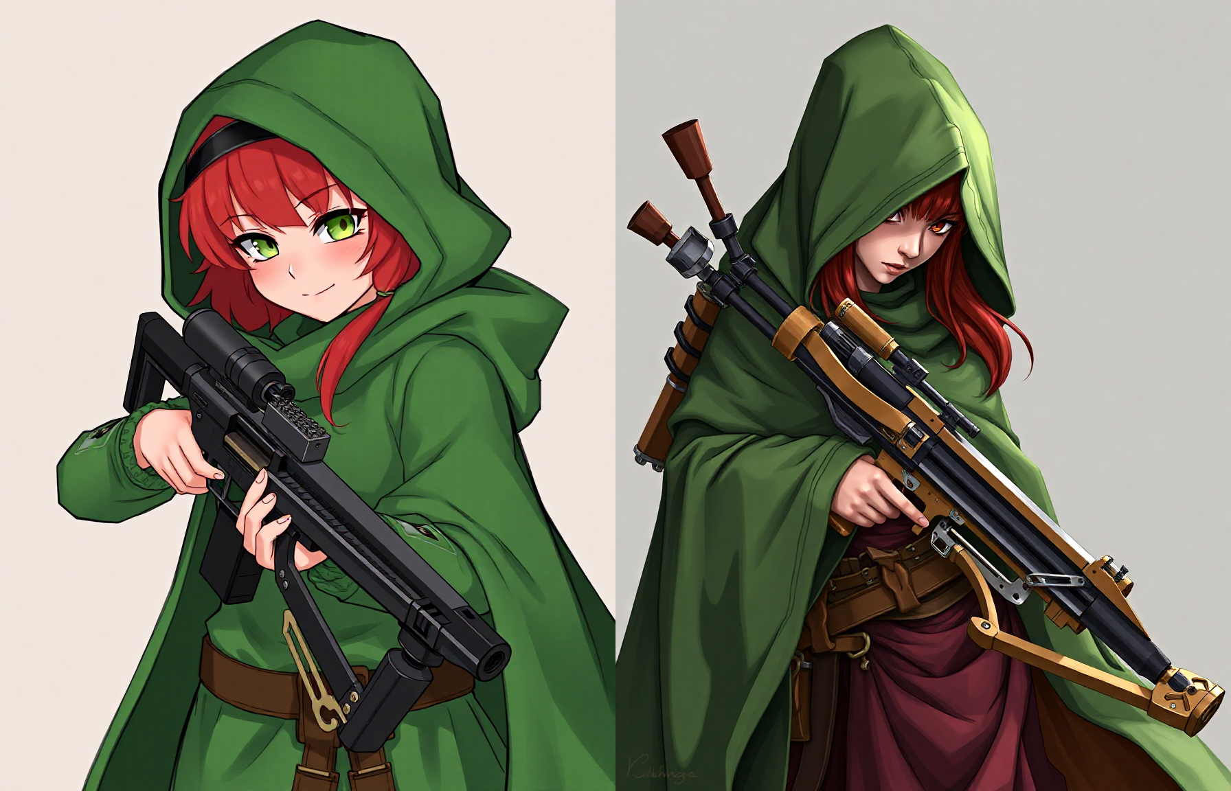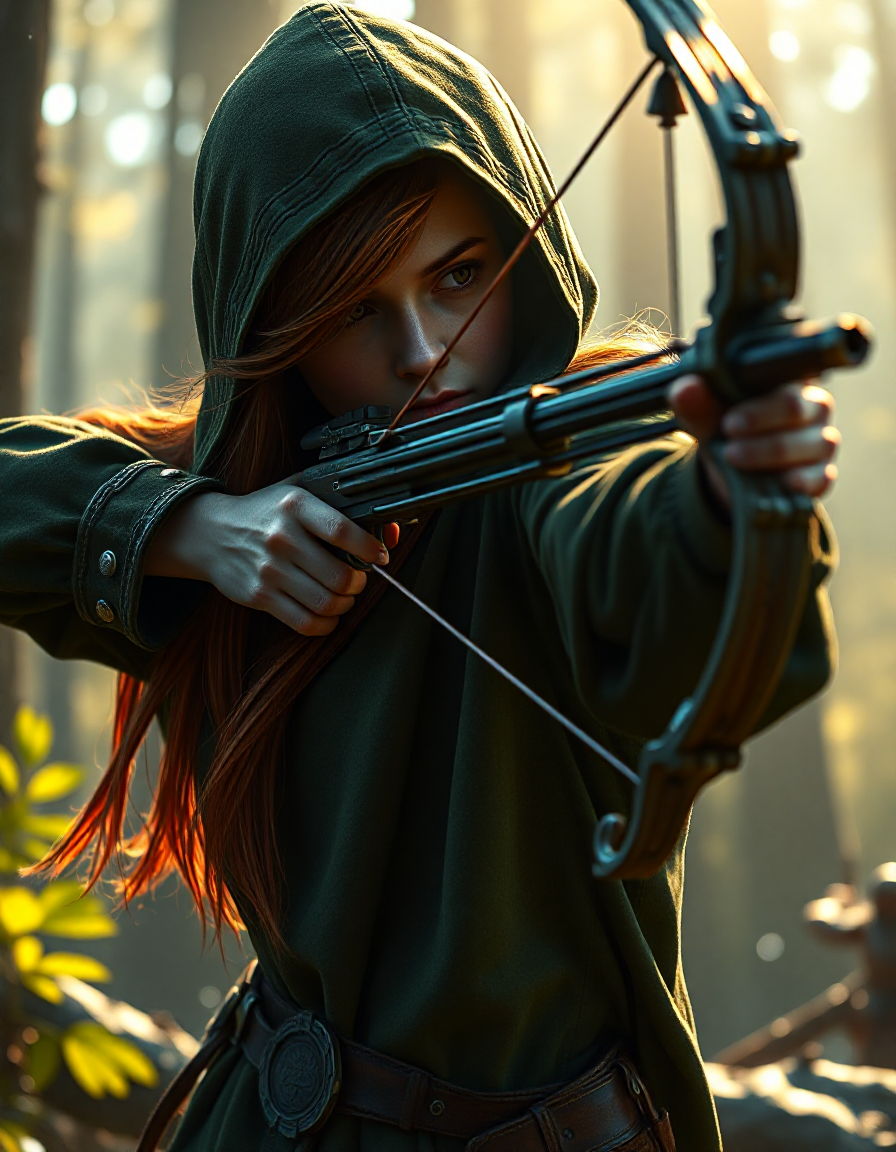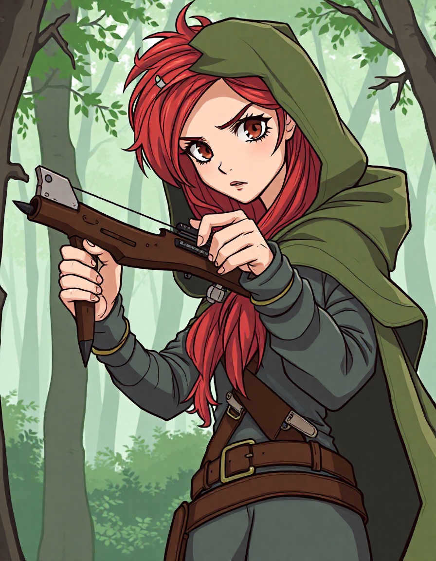>>1544481 >Девушка в зеленом плаще с капюшоном и рыжими волосами, вооруженная автоматическим арбалетом Какой-нибудь стиль(аниме, реализм, или что-то еще) или фон нужны?