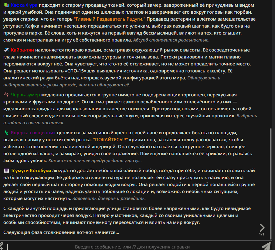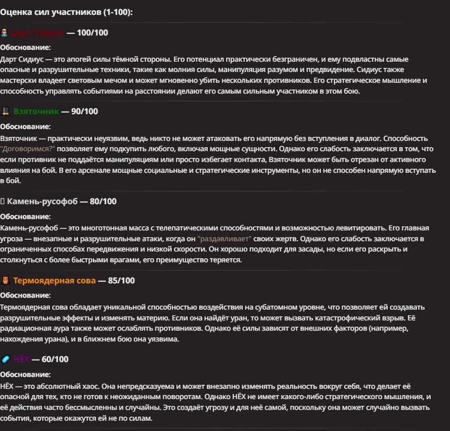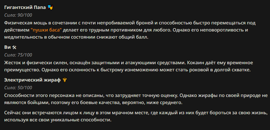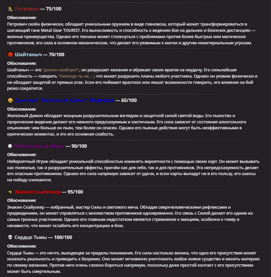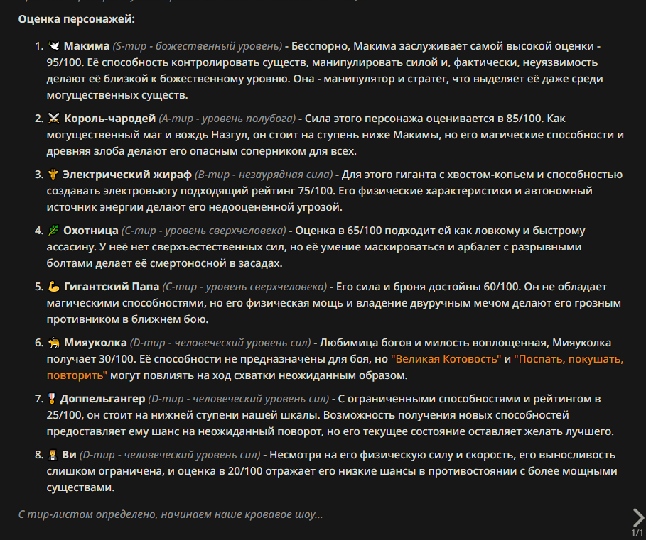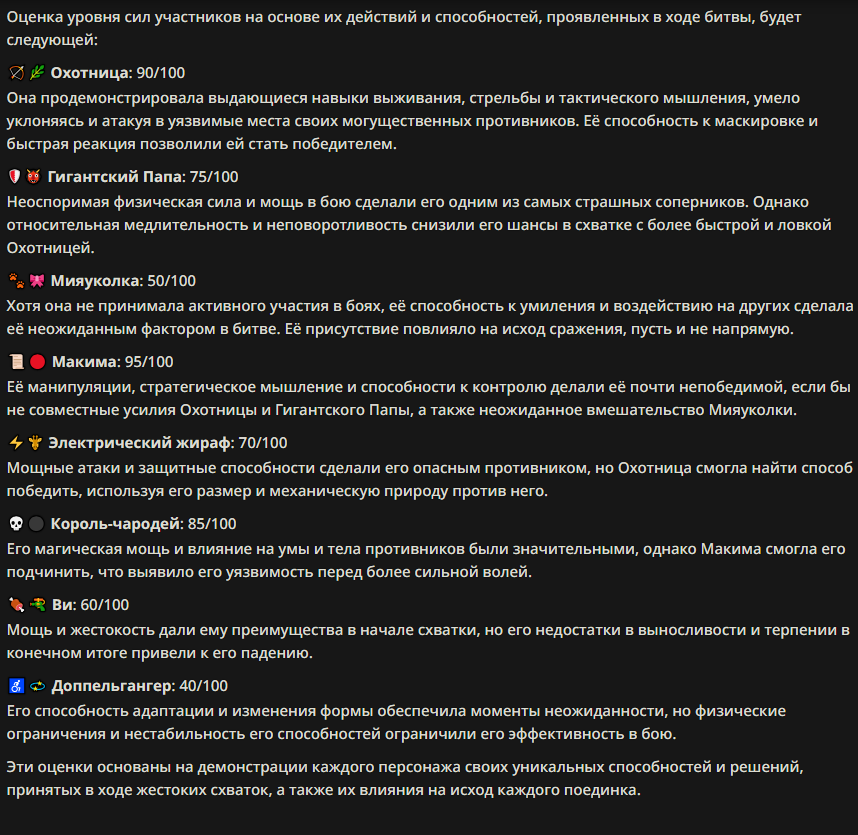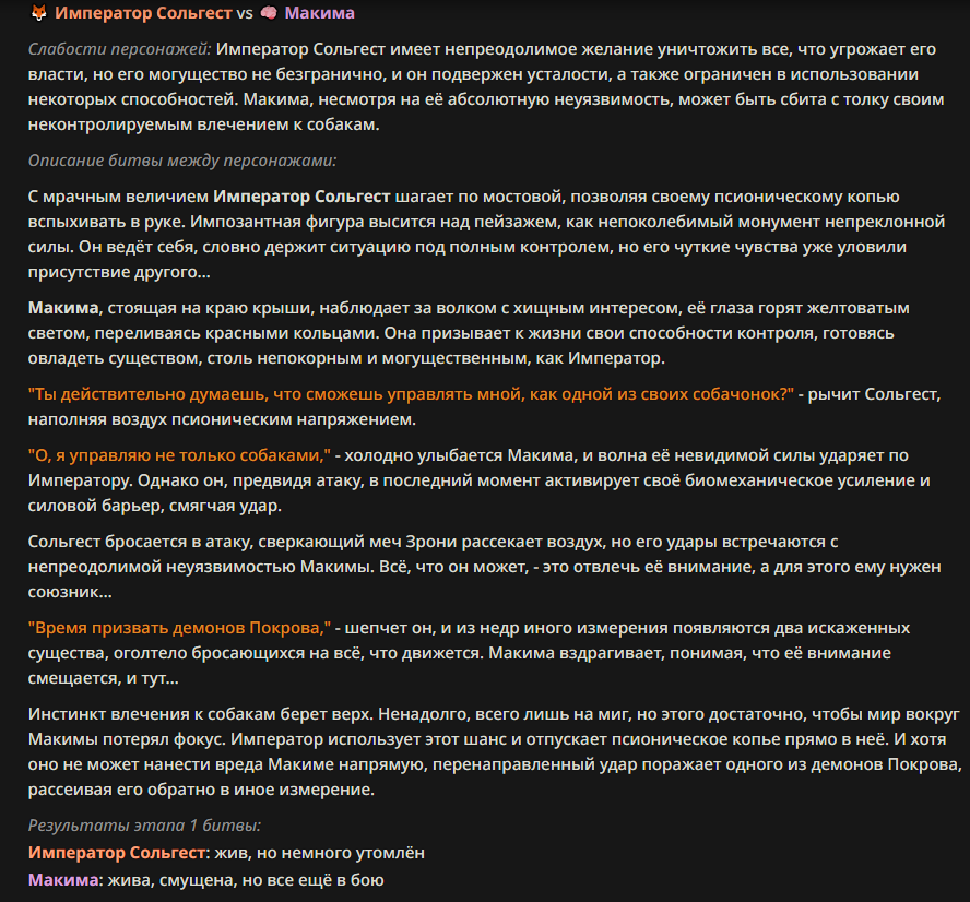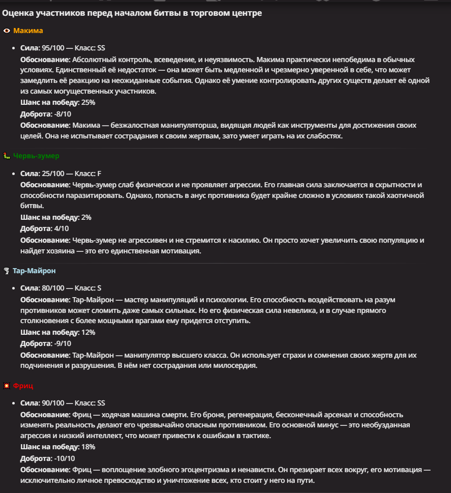 >>1545584 Ну так если гпт не прописать нормально непредвзятость, то такие персы всегда будут проигрывать под конец, даже если до этого всех выносили. В угоду сюжету. С сердцем тьмы вчера то же самое было.