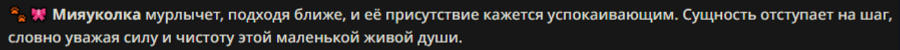 Девочка с кошачьими ушами, которая вместо обычного языка говорит только "Мияук" и "Нян-Нян". Смотрит на мир широко открытыми глазами. Любит молоко и спать. Оружие - шершавый язычок, которым она лижет в щёку своих друзей. Способность - "Великая Котовость" - нельзя бить котов и котодевочек. Все Боги Вселенной согласны с этим. Ударивший Мияуколку навлекает на себя гнев сразу всех божественных сущностей. Ультимативный Навык - "Поспать, покушать, повторить" - вдоволь подкрепившись и вздремнув начинает мурылкать и потягиваться, заставляя окружающих считать её самой милой на свете и переставать сражаться.