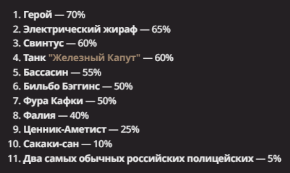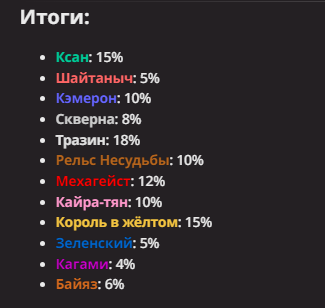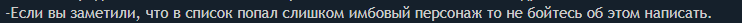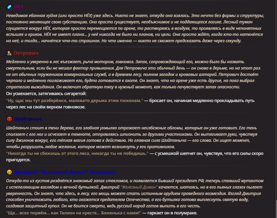 Рекомендации(желательно их выполнять для удобства, моего и вашего): -При предложении локации, оформляйте это так -- Локация:"Название локации". -Если вы предлагаете своего личного персонажа то не поленитесь его подробно описать. -Если вы заметили, что в список попал слишком имбовый персонаж то не бойтесь об этом написать. -От себя закидывайте 1-2 персонажа, дайте шанс другим анонам проявить себя. -Не будьте слишком назойливы и эгоцентричны. Уважайте других игроков и ведущих.