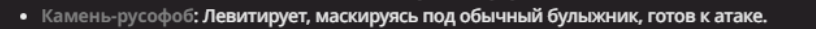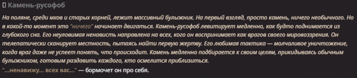 Камень-русофоб Булыжник массой в несколько тонн, каким-то образом обретший сознание. Ненавидит русских. Способен к левитации и телепатии. Его любимая атака это подобраться к ничего не подозревающему врагу сзади и раздавить своей массой. Любит прикинуться обычным камнем, чтобы усыпить бдительность противников.