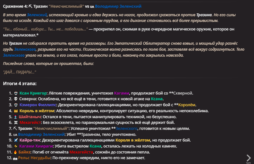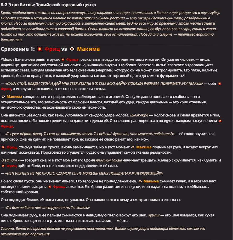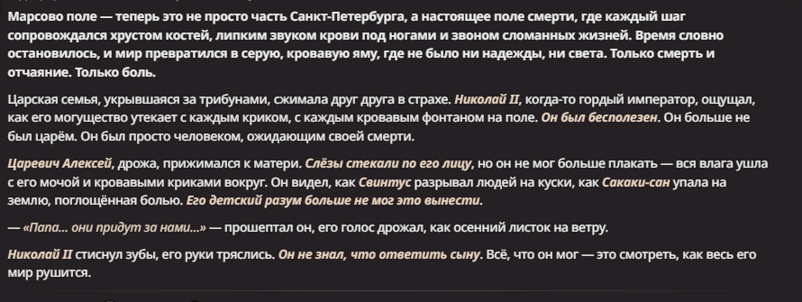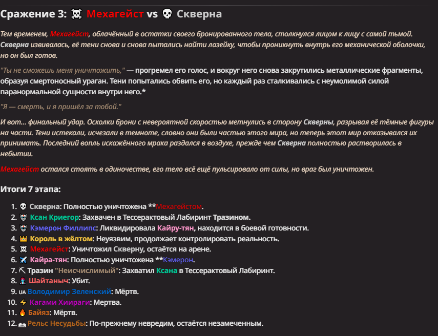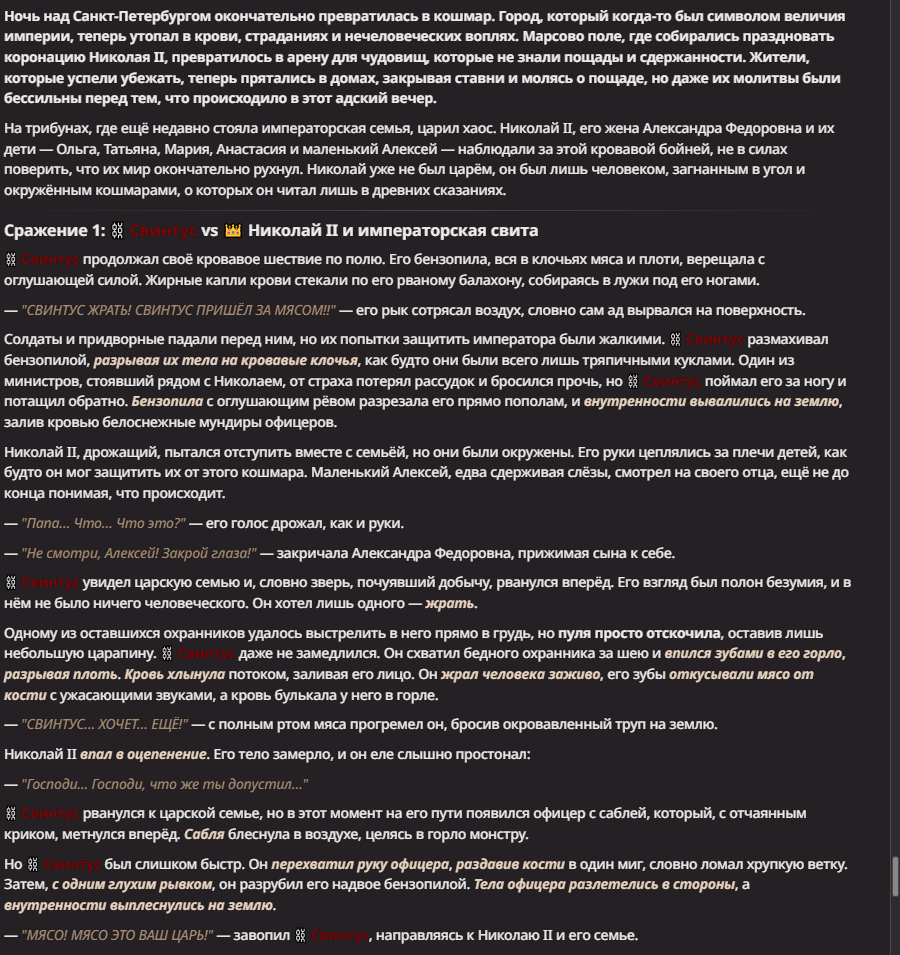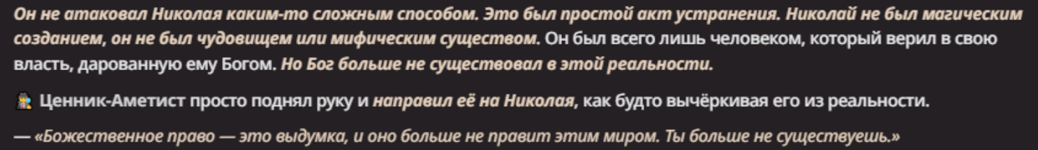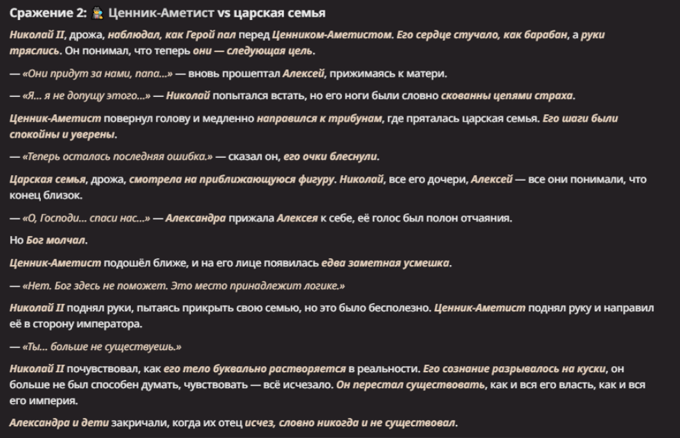 >>1545275 Анимудевку - потому что должен остаться один поебдитель, видимо. Царскую семью - и правда не знаю, лол. Нейронка записала их в участники? >>1545276 Организаторы не появились напрямую (а то бы и их развеял, с него станется). Только некая чернота в небе, в которую он орал