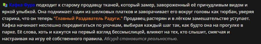 >>1545198 Фура Кафки Ожившая фура из неопубликованного романа Франца Кафки, призванная в мир после его прочтения. Обладает сознанием и считает всех вокруг жалкими тараканами, которых следует раздавить. Хотя она сделана из простых материалов, ее невероятно мощная броня соткана из чистого отчаяния, от которого даже снаряды теряют волю к нанесению повреждений. Вокруг Фуры регулярно происходят абсурдные события, а противники умирают от сильнейшей депрессии. Кроме того, это все еще фура, которая может протаранить и переехать всем своим весом.