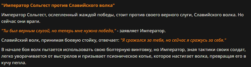>>1545163 Осталось только прописать слабость Императора к вампирам🤤 Хотя, ладно, по-моему, надо просто признать эту концовку каноничной и не терзать волчару новыми битвами. Ему еще нужны силы на вампира😉 Думаю, автору Сольгеста надо не упускать такой канон.