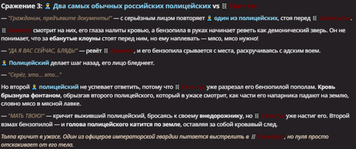 >>1545219 Свинтус — ожившая человекоподобная свинья с душой несправедливо убитого мужчины. Став воплощением жестокости после потери рассудка, он терроризировал советскую деревню, убивая и пожирая людей. Непобедимый и неуязвимый для оружия, Свинтус уничтожил всех жителей села, а затем был сослан на бесконечную арену, где пользуется своей нечеловеческой силой и выносливостью в бесконечных боях. Предпочитает холодное оружие, в частности двуручный топор и бензопилу с неиссякаемым топливом, но для особых случаев при нём всегда трофейное двуствольное ружьё.