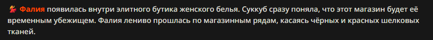 Суккуб, берущий не силой, а хитростью. Её необычайно фигуристое тело, едва прикрытое тонкими полосками чёрного шёлка, притягивает взгляды окружающих независимо от возраста и пола. Её серая кожа вместе с потом выделяет феромоны, изогнутые белые рога подчёркивают черноту длинных прямых волос, а светящиеся красные глаза заглядывают, кажется, в самую душу. Однако, внешность - лишь прикрытие: ногти и клыки Фалии остры, как бритвы, а свежая кровь и плоть исцеляют демоническое создание. Будучи суккубом, Фалия может подчинять себе существ, попавших под её чары. Поглощение её телесных жидкостей (особенно молока) помутит разум противника и заставит преданно служить демонице, как своей королеве. Фалия также может открывать порталы, но процесс занимает много времени и не позволяет перемещаться слишком далеко. На этом опасные навыки суккуба заканчиваются: она не имеет ни оружия, ни брони, а её тело приспособлено для жаркого секса сутки напролёт, а не для сражения. Без возможности охмурить цель или свиты подчинённых ею существ, она едва ли станет серьёзной угрозой.