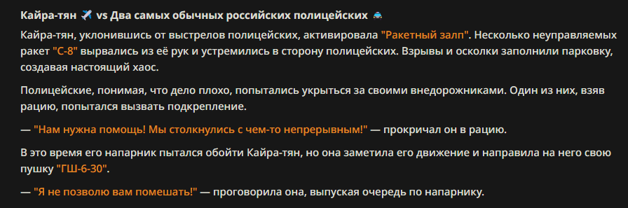 Способности: "Огонь на подавление" - бегло стреляет длинной очередь из своей пушки по одному или нескольким противникам, дезориентируя их и вынуждая искать укрытие, отказываясь от своих текущих планов. "Ракетный залп" - выпускает много ракет "С-8" по области. "Ковровая бомбардировка" - тратит все свои бомбы, чтобы поразить большую область. Наносит катастрофический урон и разрушения в зоне поражения. Можно использовать всего один раз. "Кайра" - Кайра-тян способна видеть цели на расстоянии до 5 километров. "СПО-15" - Пассивная способность. Если кто-то использует радиоволны или магию, то Кайра-тян почувствует направление до их источника. Так-же Кайра-тян чувствует если кто-то отслеживает ее при помощи радиоволн или магии и отдельно ощущает если это отслеживание используется для наведения какого-либо оружия или снаряда. "ЛТЦ" - Кайра-тян отстреливает позади себя яркие высокотемпературные сигнальные огни, которые привлекают на себя внимания и атаки врагов и долго висят в воздухе медленно падая вниз. Кайра-тян может их использовать для отвлечения противников, освещения темных мест или поджигания. "Форсаж" - ограниченное время может летать со сверхзвуковой скоростью. "Пламя" - вызывает высокотемпературную струю пламени из руки, которую может использовать в ближнем бою.