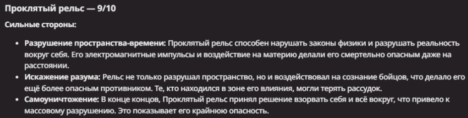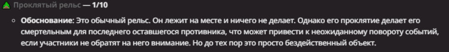 Проклятый рельс Обычный рельс Р-75 с одной из бесконечных железных дорог. В нем нет никаких признаков сознания, воли и движения, потому что это просто рельс, и он не способен действовать - только безмолвно лежать на месте. Единственное, что выделяет его из миллионов подобных, так это то, что, если на арене останутся только он и другой участник, то последнего настигнет проклятие, и он моментально умрет. Проклятие исчезнет, если рельс будет уничтожен. Впрочем, кому придет в голову уничтожать обычный, совершенно ничем не примечательный рельс?