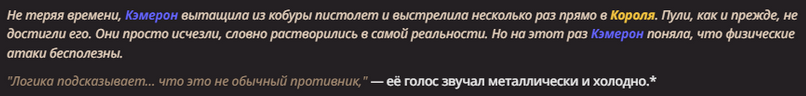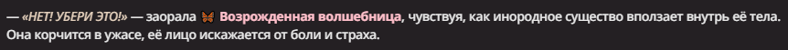>>1545378 СКВЕРНА Не имеет постоянной формы и ее можно увидеть только периферическим зрением. Напоминает массу клубящегося черного дыма. Ее появление словно высывает свет из окрыжающего пространства. Прячется в тенях и может перетекать из одной в другую. Ненавидит яркий свет, может быть уничтожена если не останется тени чтобы спрятаться. Способна заставлять тени менять форму, создавая длинные когтистые лапы, хватающие и разрывающие своих жертв, а также создавать бесплотных теневых монстров. Её силы растут с увеличением темноты и падают с увеличением света. Самое появление Скверны вызывает у людей необъясниму панику и галлюцинации. Чем слабей псхика у человека, тем более материальны атаки Скверны.