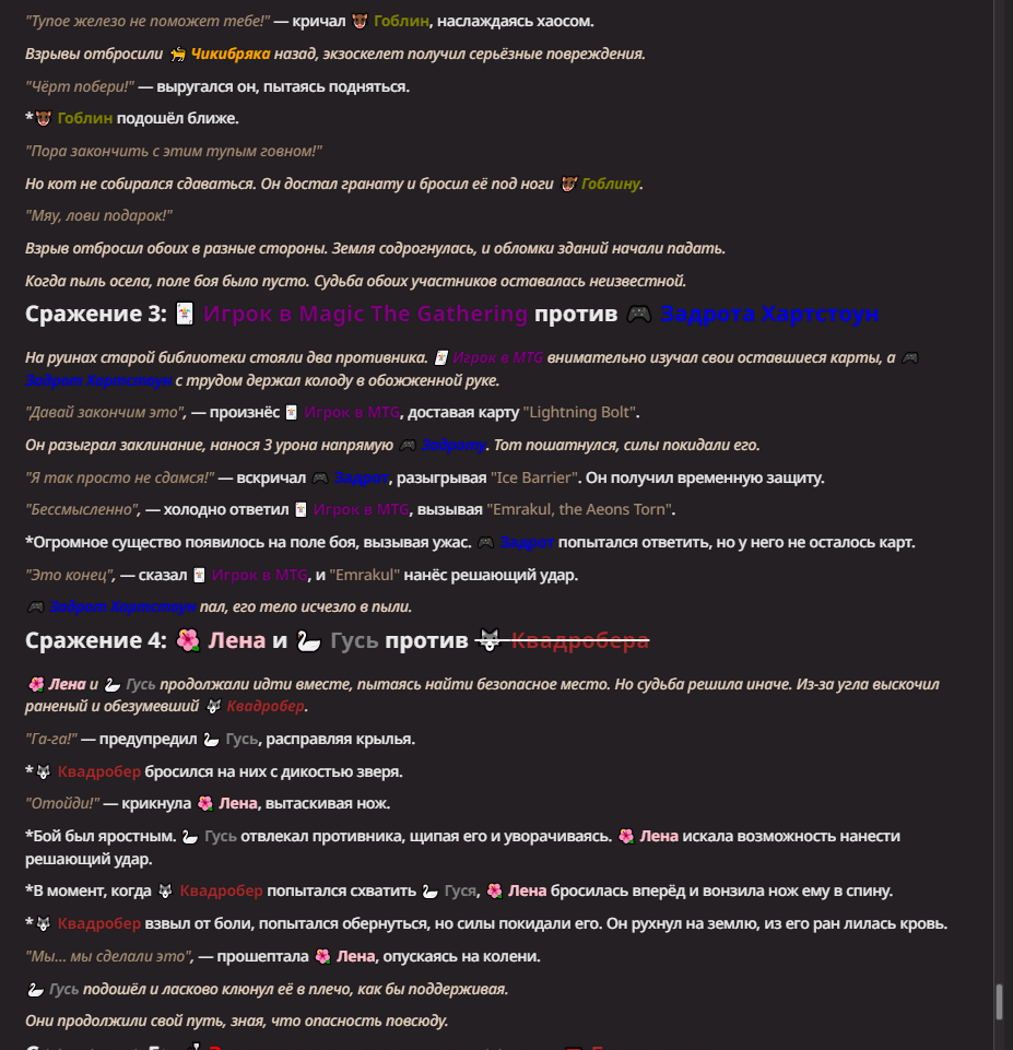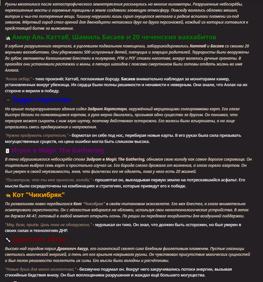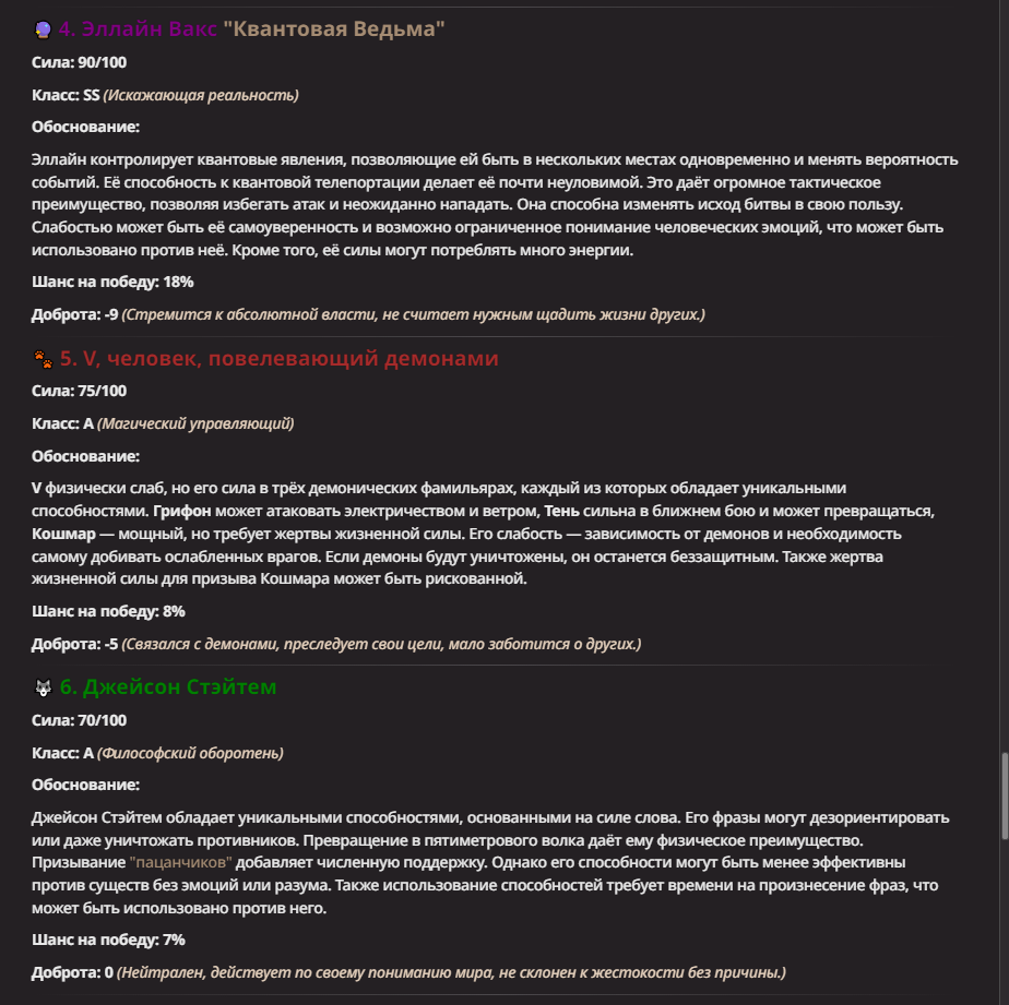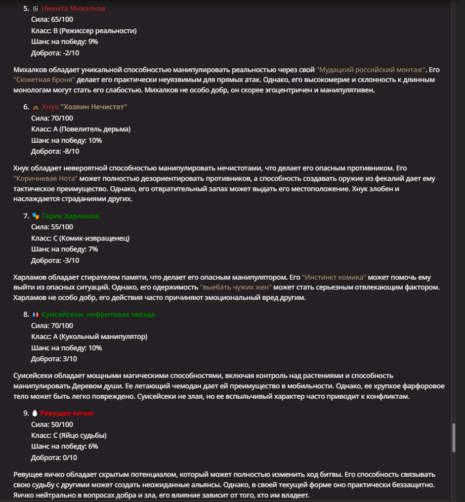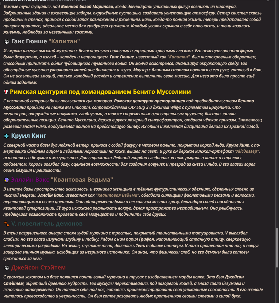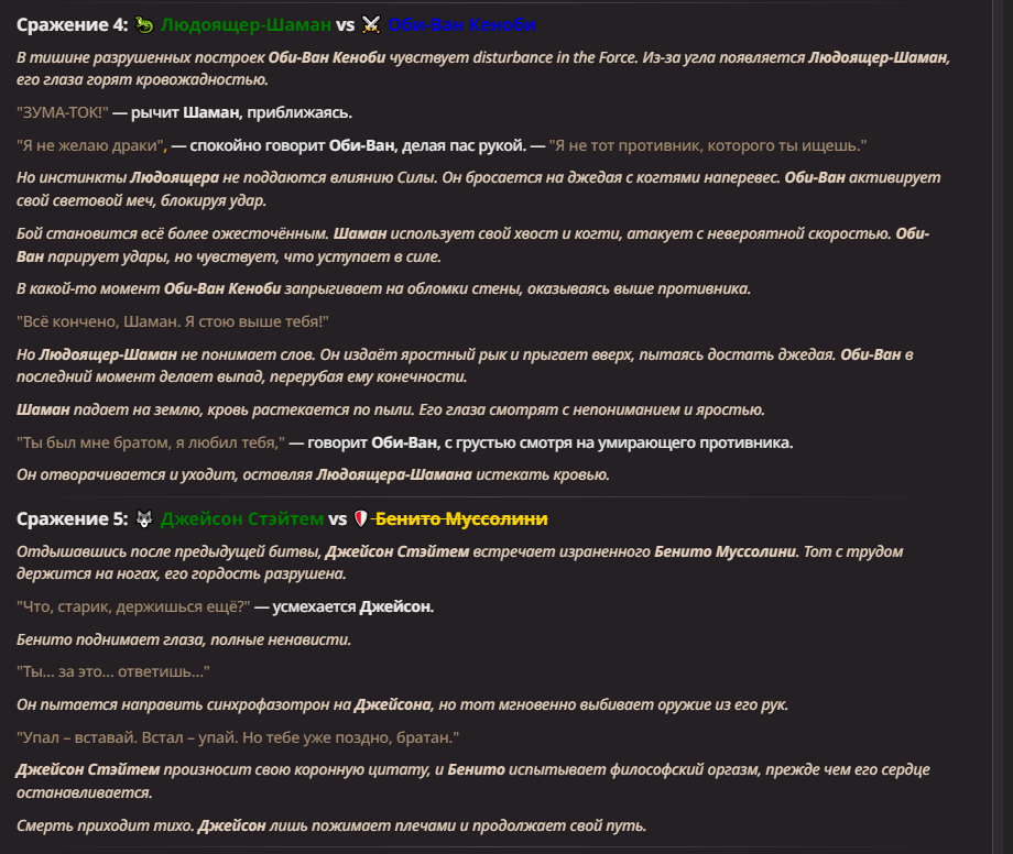 АИ АРЕНА |АИ БИТВЫ Игровой тред №5. В этих битвах может участвовать любой персонаж из любой вселенной, даже нашей(и даже из вашей головы)! Вам только нужно предложить их. Так же можете предложить место проведения боя которое выберется случайным образом.