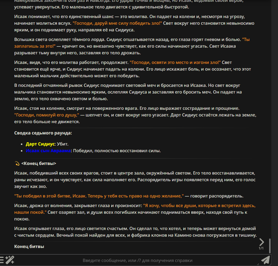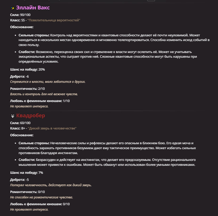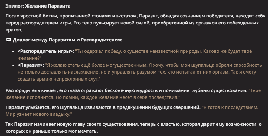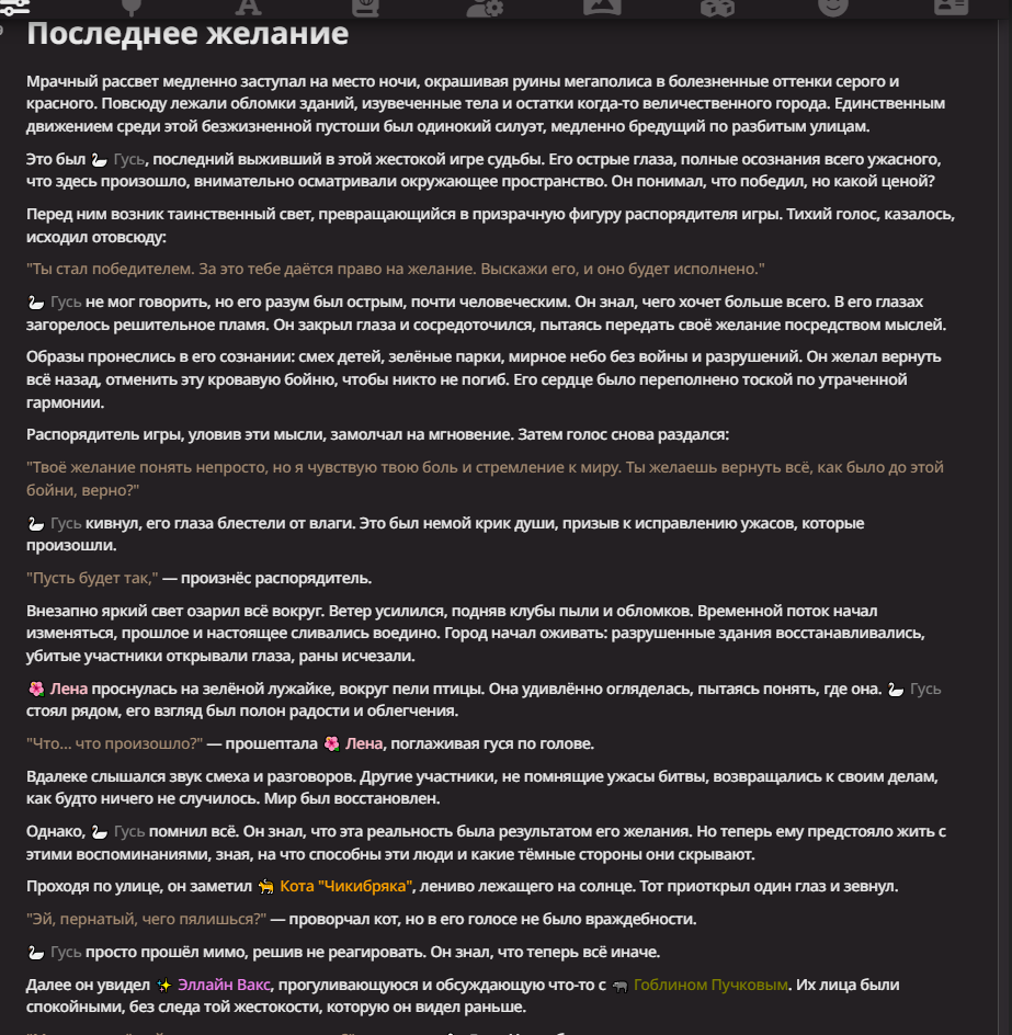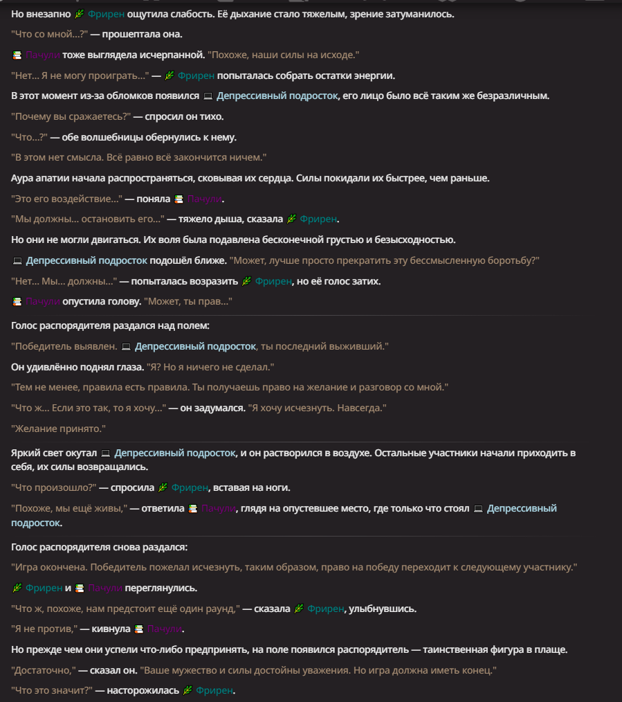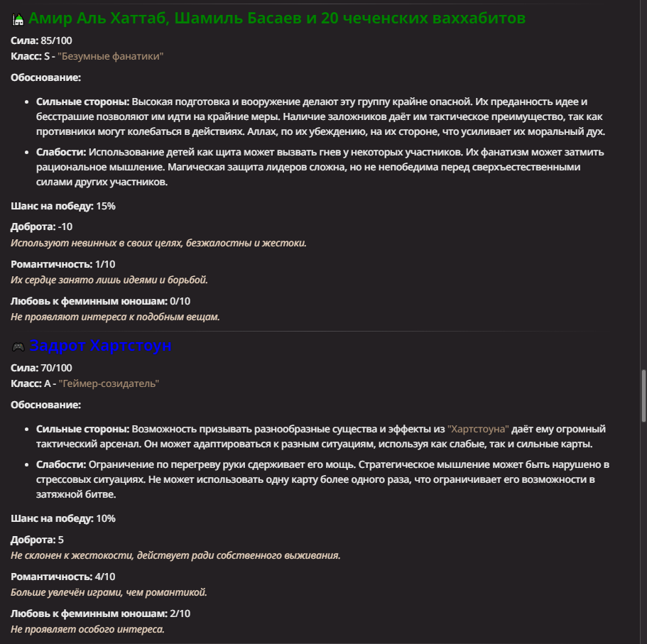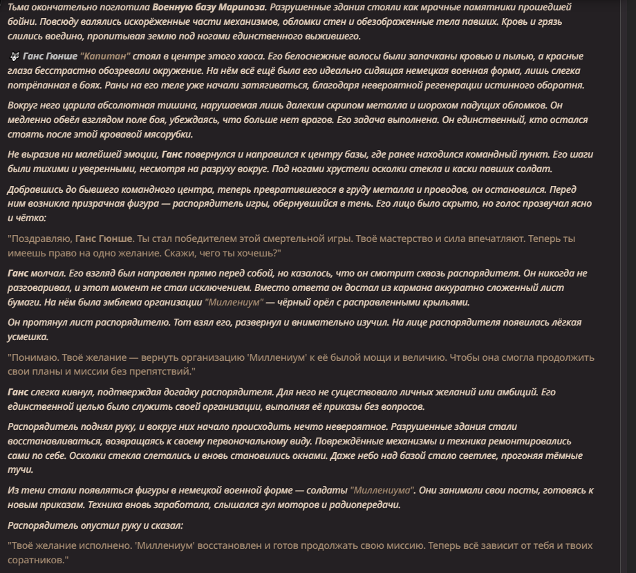 Вчера выигрывал кстати, но мне его разрушительная концовка не понравилось, поэтому я чутка подробнее на этот раз его личность описал, чтобы он другое желание загадывал при победе, чтобы он ёбнул всех магов и мистических тварей, оставив при этом простых людей в покое