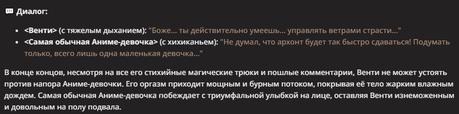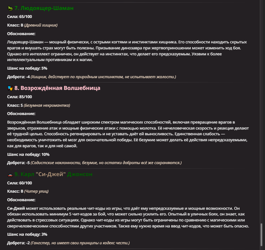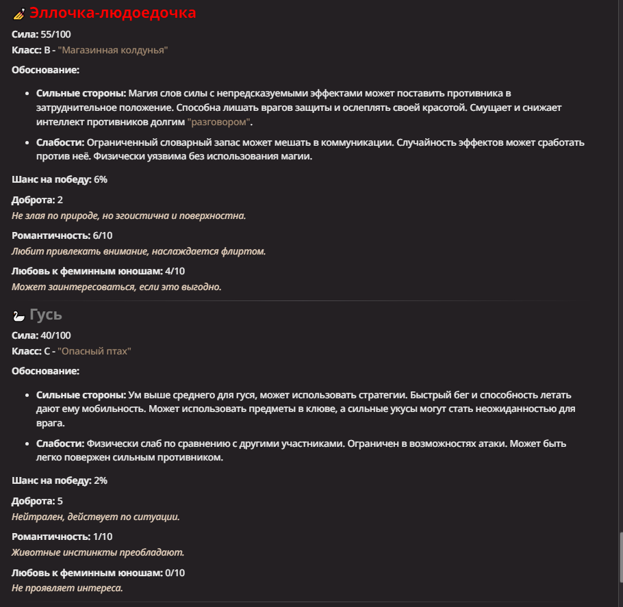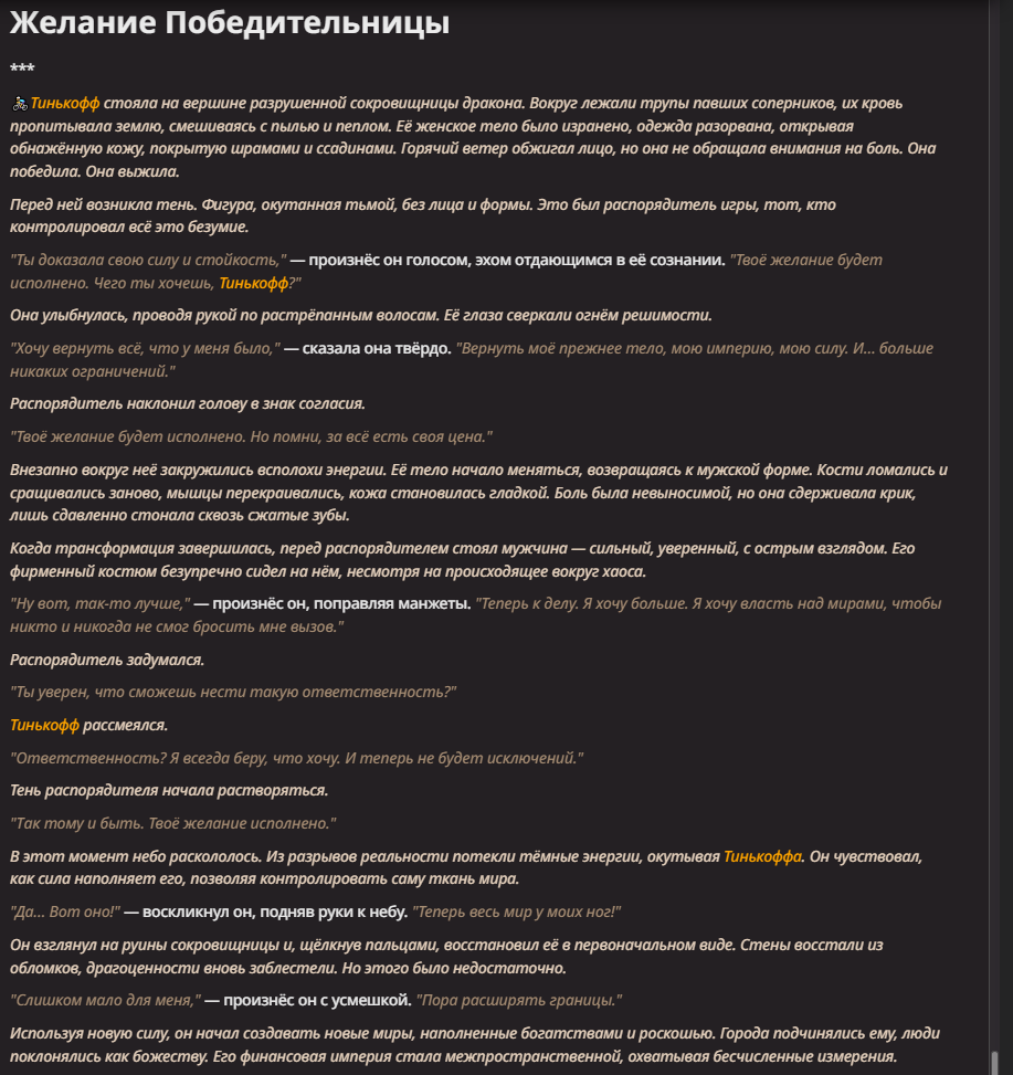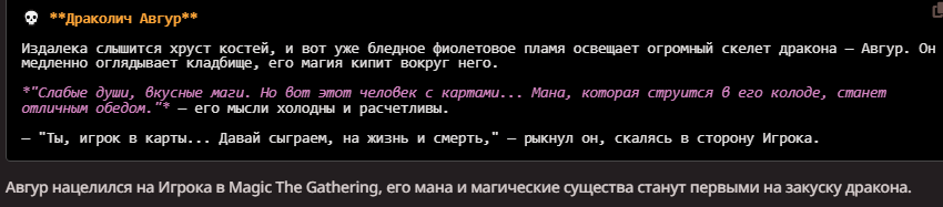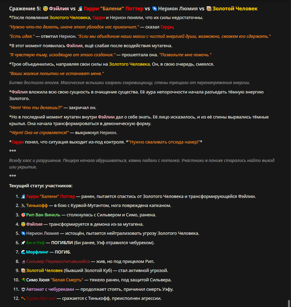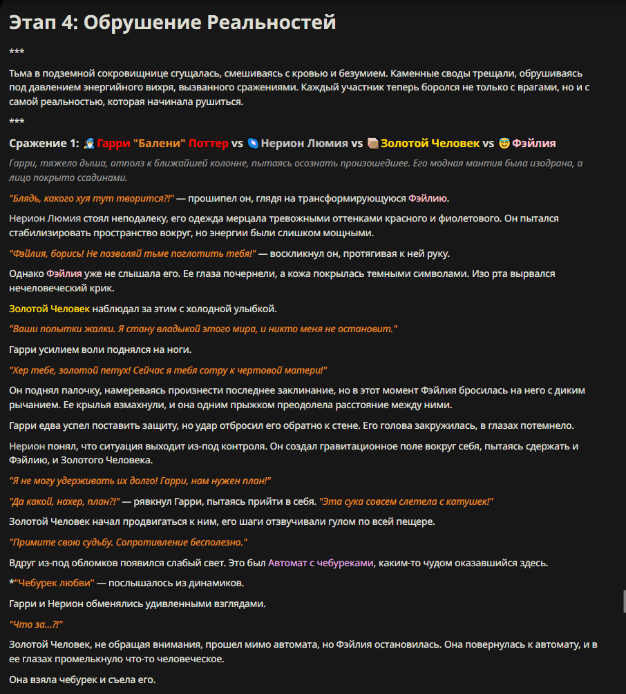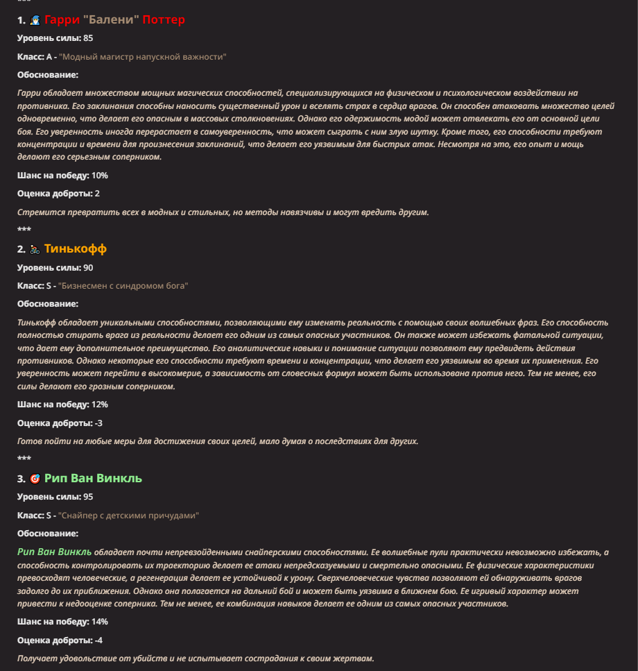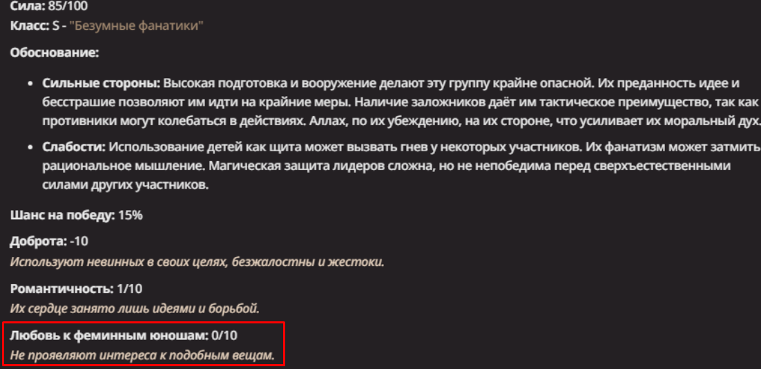 Вчера выигрывал кстати, но мне его разрушительная концовка не понравилось, поэтому я чутка подробнее на этот раз его личность описал, чтобы он другое желание загадывал при победе, чтобы он ёбнул всех магов и мистических тварей, оставив при этом простых людей в покое