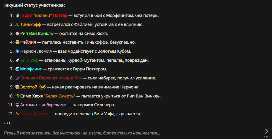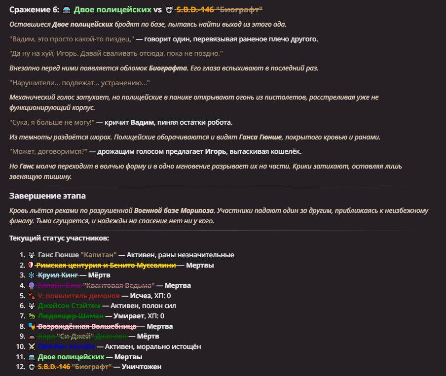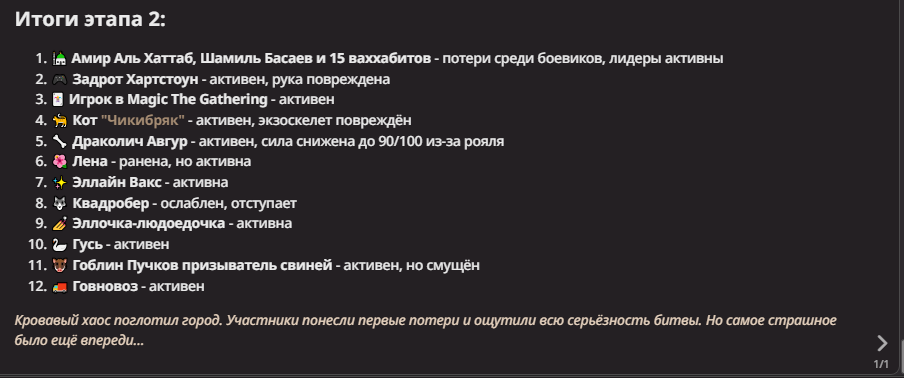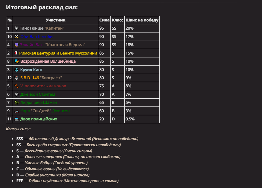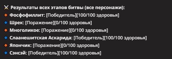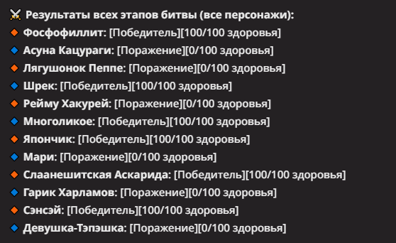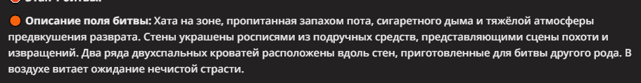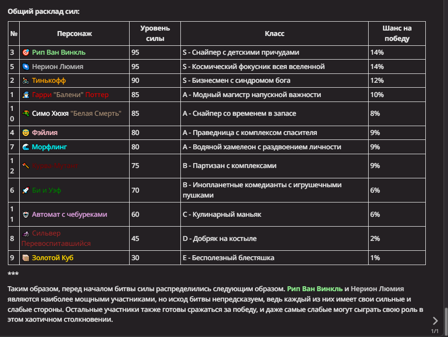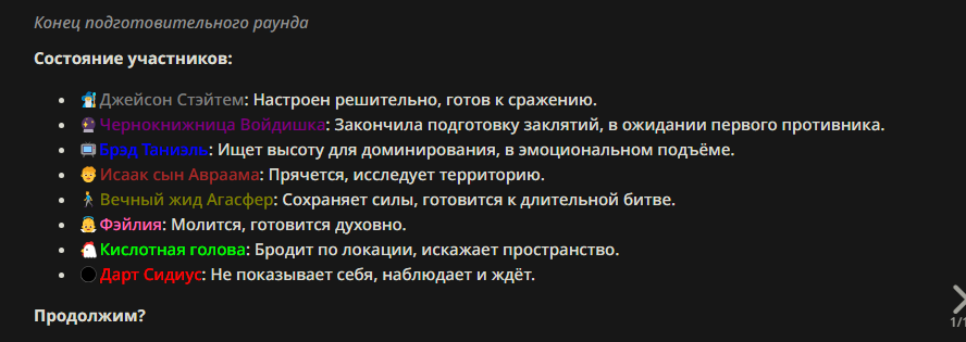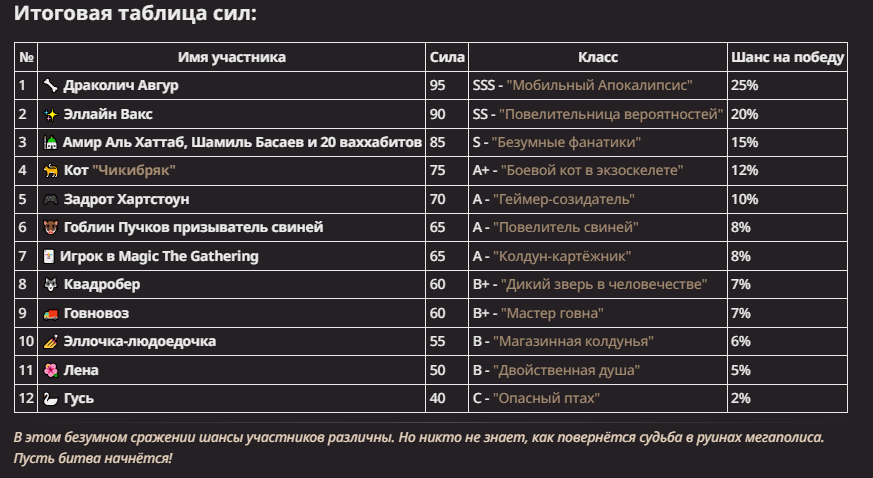 Правила(могут меняться в зависимости от ОПа): 1. Максимум в бою могут участвовать 12 персонажей. После этого набор закрывается и начинается битва. 2.Нельзя предлагать персонажей на около божественном уровне силы. 3.Персонажи с напарниками НЕ запрещены В РАЗУМНЫХ ПРЕДЕЛАХ, с соблюдением баланса сил. Никаких легионов космодесанта. Upd. Уточняйте у текущего ОПа. 4.После участия в бою персонаж уходит на перерыв в 3 боя(сделано для защиты от спамеров одного персонажа). 5.Нельзя предлагать персонажей которые могут призывать других существ без каких-либо условий. Пример: Маг который призывает демонов по щелчку пальцев == не допускается. Маг которому нужны трупы или какой-то длительный ритуал с условиями для призыва демона == допускается. 6.После использования локации она выбивается из случайного списка на 9 боёв.(Почему так много? Ради разнообразия.) Более подробное описание боя вы можете прочитать на втором пике. Upd. Формат может меняться в зависимости от ОПа 7.Набор персонажей полностью закрывается после начала боя и открывается только когда он закончится. 8. Ведущий оставляет за собой право не принять вашего персонажа. Будьте корректны - в случае, если такое произошло, вежливо спросите причину и/или дождитесь другого ведущего.
