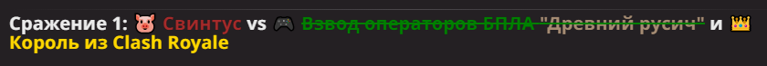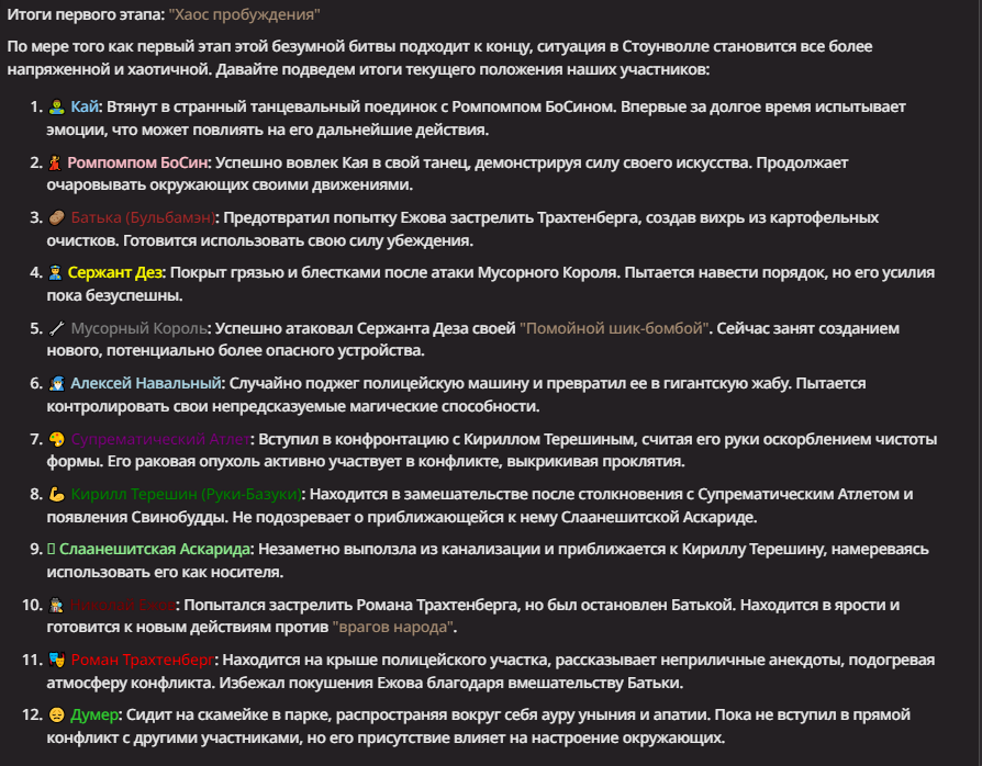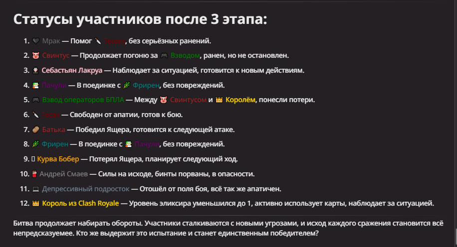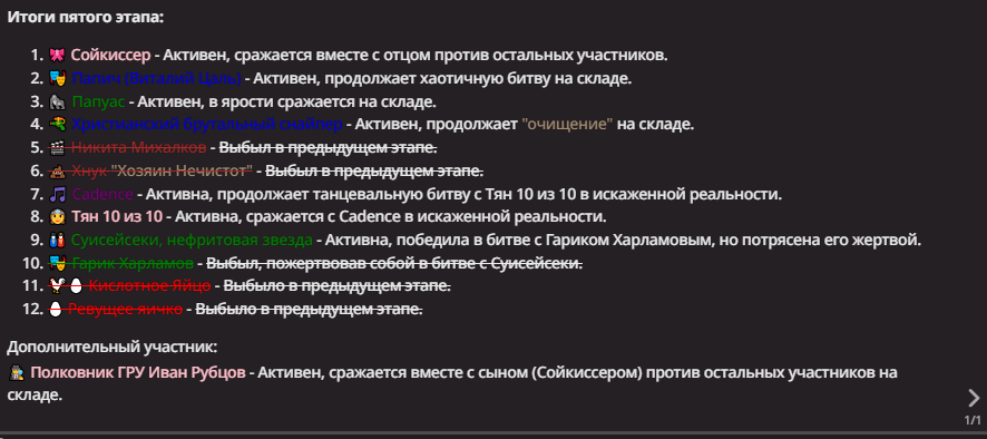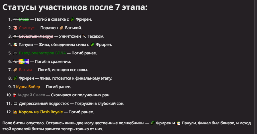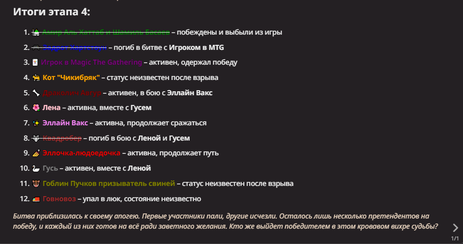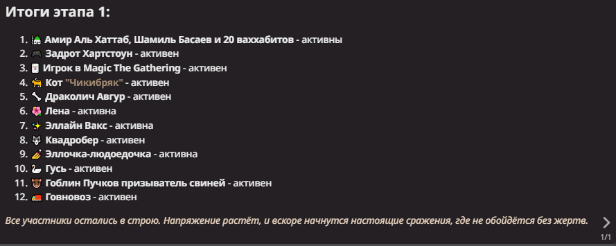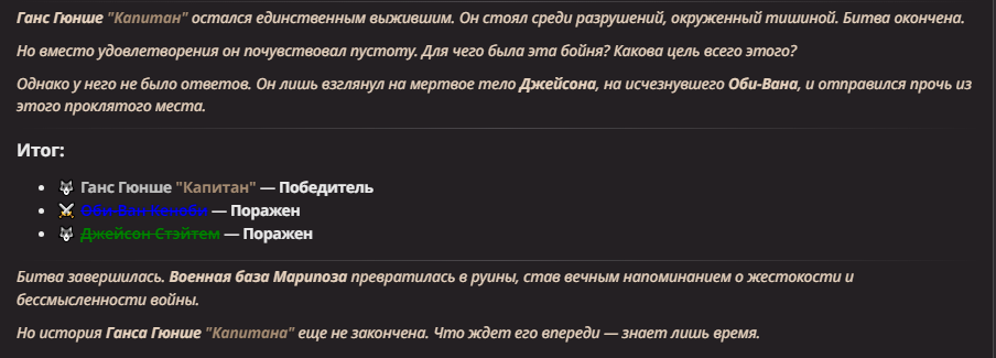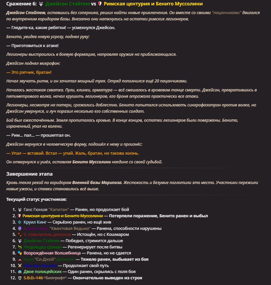 Правила(могут меняться в зависимости от ОПа): 1. Максимум в бою могут участвовать 12 персонажей. После этого набор закрывается и начинается битва. 2.Нельзя предлагать персонажей на около божественном уровне силы. 3.Персонажи с напарниками НЕ запрещены В РАЗУМНЫХ ПРЕДЕЛАХ, с соблюдением баланса сил. Никаких легионов космодесанта. Upd. Уточняйте у текущего ОПа. 4.После участия в бою персонаж уходит на перерыв в 3 боя(сделано для защиты от спамеров одного персонажа). 5.Нельзя предлагать персонажей которые могут призывать других существ без каких-либо условий. Пример: Маг который призывает демонов по щелчку пальцев == не допускается. Маг которому нужны трупы или какой-то длительный ритуал с условиями для призыва демона == допускается. 6.После использования локации она выбивается из случайного списка на 9 боёв.(Почему так много? Ради разнообразия.) Более подробное описание боя вы можете прочитать на втором пике. Upd. Формат может меняться в зависимости от ОПа 7.Набор персонажей полностью закрывается после начала боя и открывается только когда он закончится. 8. Ведущий оставляет за собой право не принять вашего персонажа. Будьте корректны - в случае, если такое произошло, вежливо спросите причину и/или дождитесь другого ведущего.