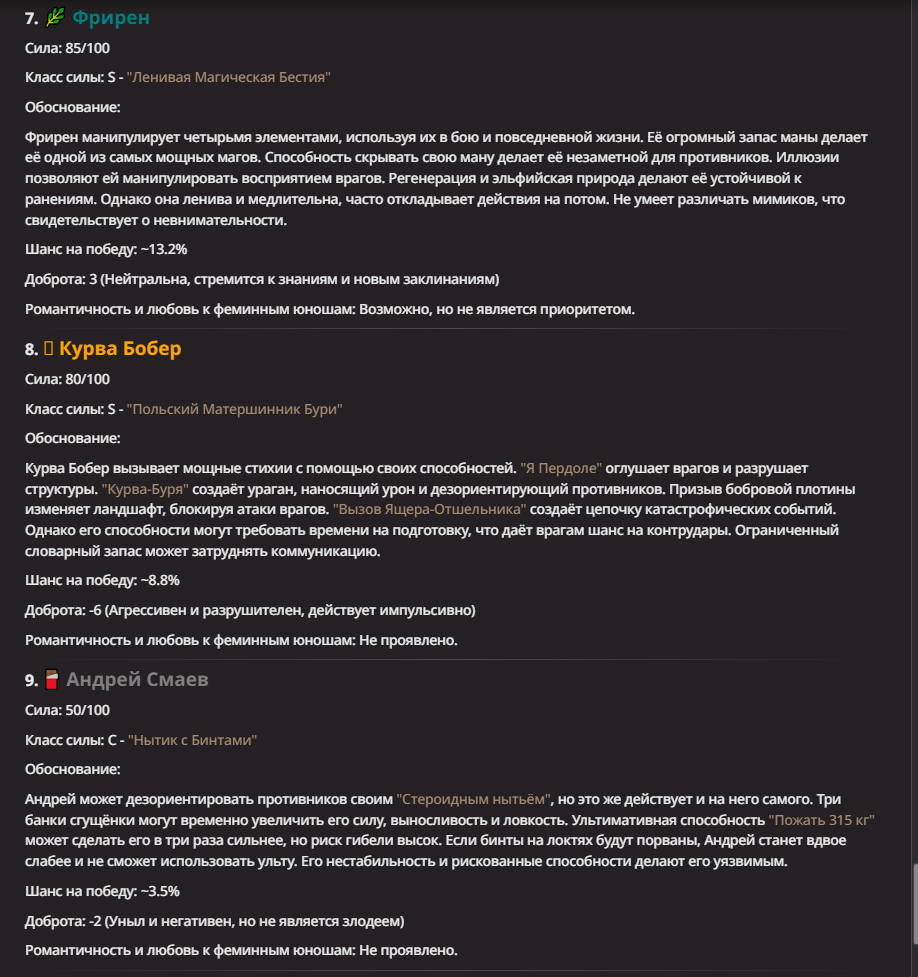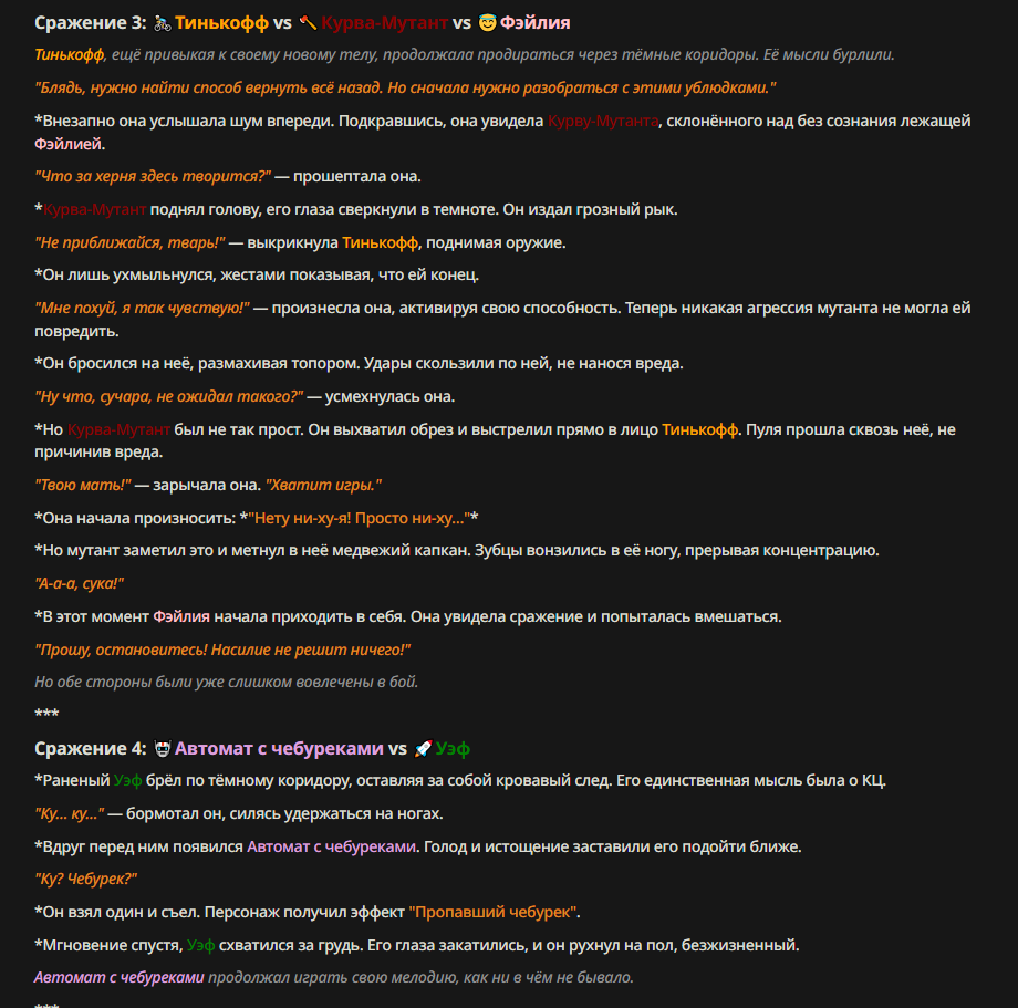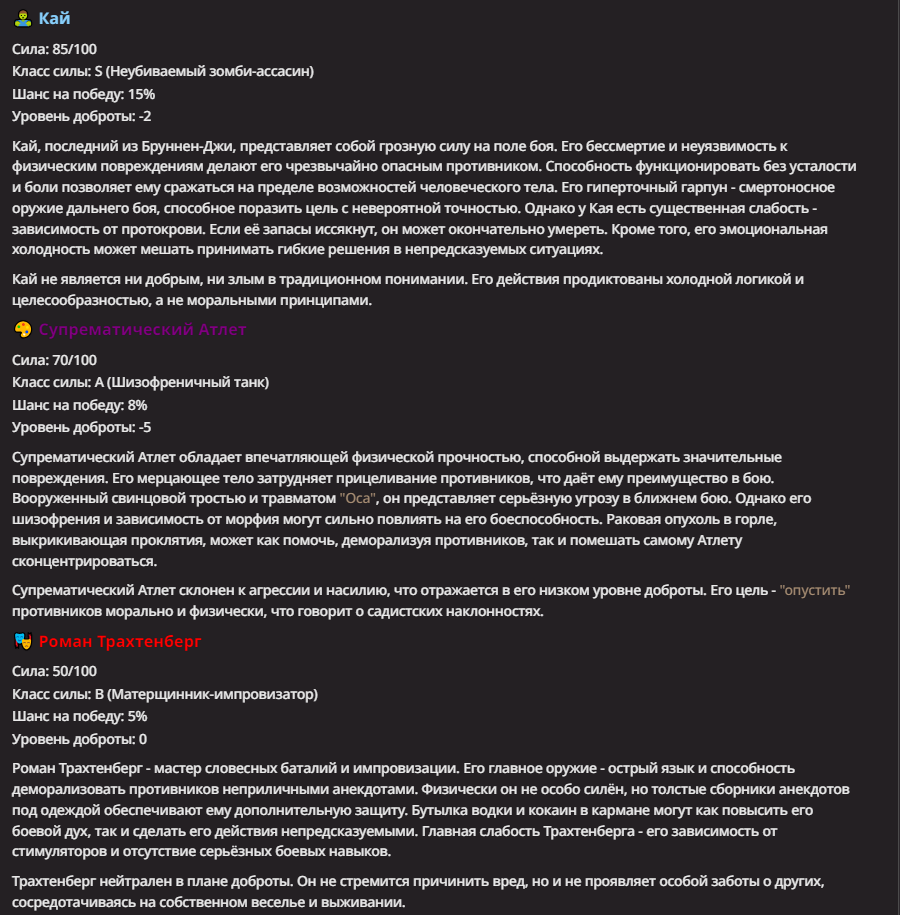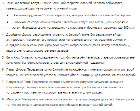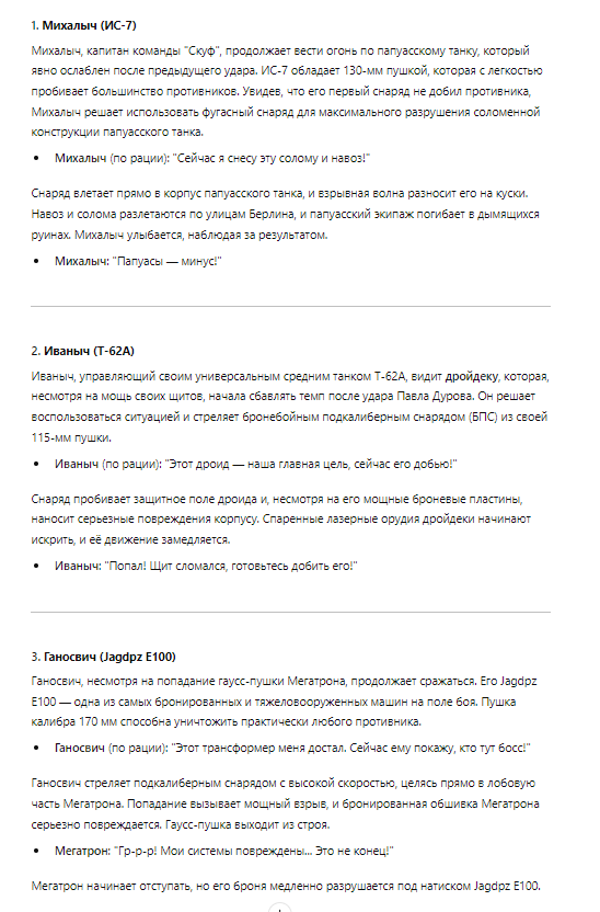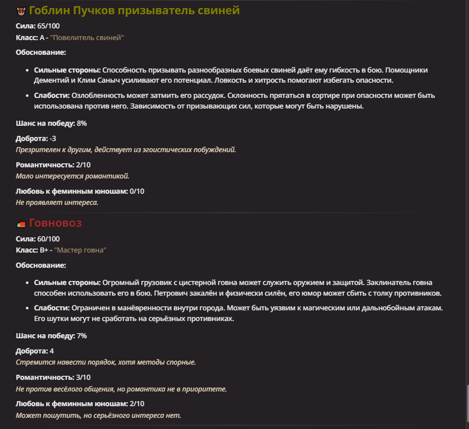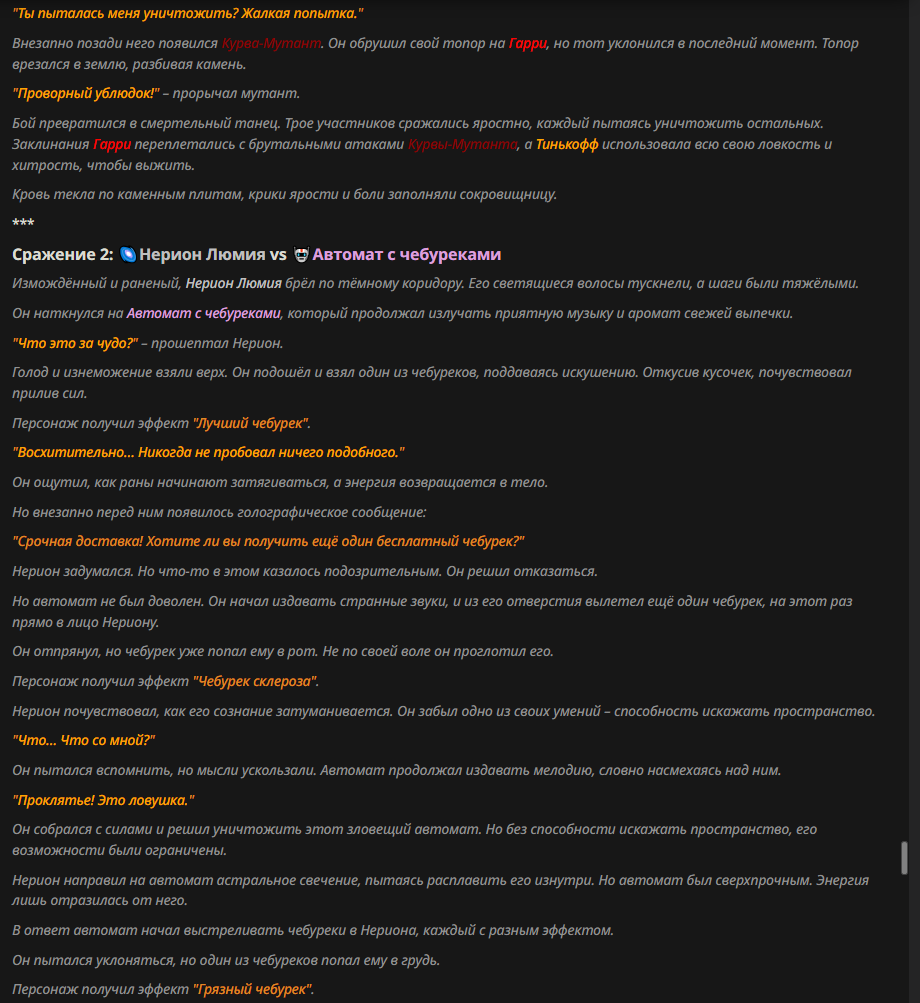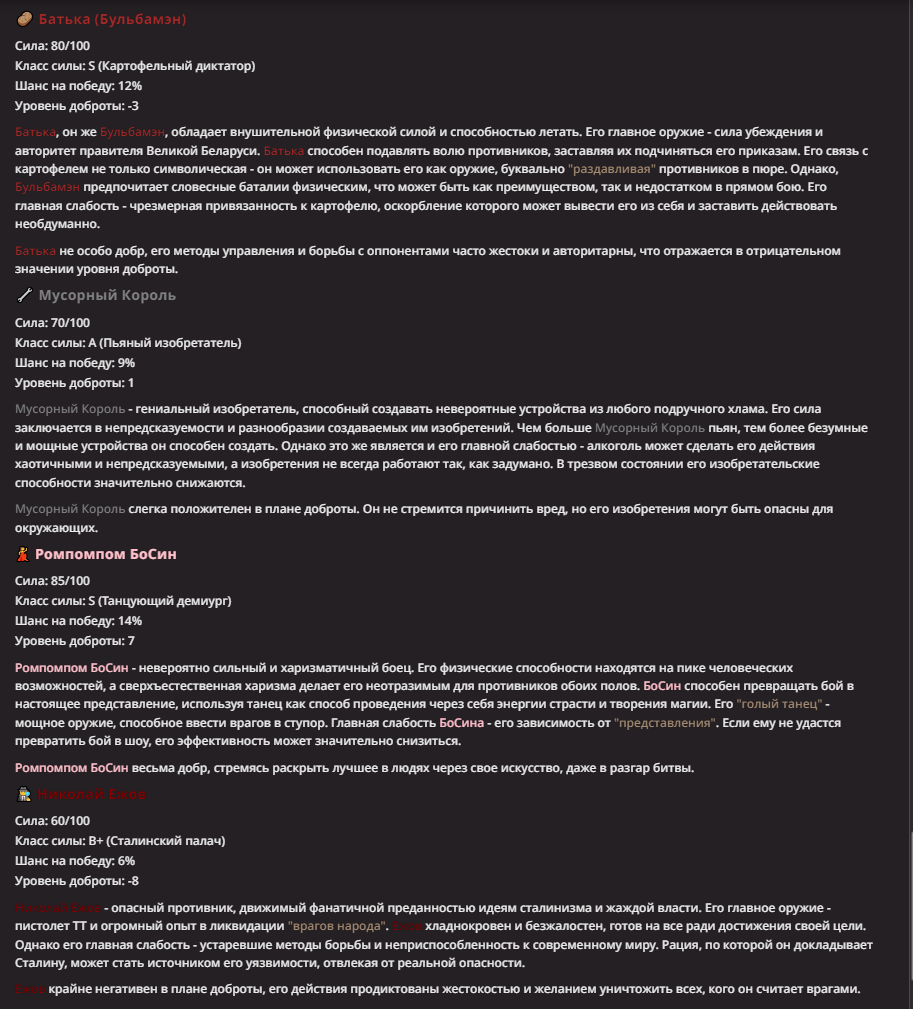 >>1548542 Погодь если ГПТ поменяй Батька бульбамэна на Шавермобота Шавермобот Секретная разработка для борьбы с голодающими, так и не вышедшая из лаборатории, до поры до времени... Представляет собой на вид полностью роботизированную девушку лет 18 со светлыми волосами и голубыми глазами. Не совсем понимает для чего она существует и как ей взаимодействовать с другими людьми, поэтому часто говорит неуместно и смешно. Её части состоят из крепкого неизвестного сплава, что позволяет ей выдерживать большой урон, особенно термический. Вот что умеет Шавермобот: Она умеет стрелять из пальцев сжатой до высокой плотности фольгой, способной пробивать тяжёлую танковую броню. Первым делом при сражении будет доставать свежий кусок шаурмы и кидать прямиком в рот противнику. Очень вкусно! И противник должен заплатить 500 рублей за каждую съеденную им шаурму, это закон! Шаурма может вызвать серьёзное отравление с последующим обсёром её съевшего. Призывать свой Станд "Шаверма Паллада" для проведения сильных физических атак, временного увеличения своей атаки и защиты и защиты от негативных состояний, но за это она должна платить 1000 рублей каждый раз за каждое дейсвтие станда. Изначально имеет при себе 1000 рублей. Переходить в режим "Оргия", что существенно увеличивает её скорость, силу, реакцию и приводит к постепенному перегреву всего тела, так что ей нужно вовремя отключать этот режим, иначе если перегрев будет критическим это приведёт к полному отключению системы для охлаждения на некоторое время, или при крайней необходимости может довести перегрев до самоуничтожения, что вызовет "Ядерно-шаурмечный взрыв" поражая всё в радиусе 500 метров мощным взрывом и ингридиентами шаурмы, голова Шавермобота в это время при возможности катапультируется на безопасное расстояние. После этого Шавермобот не способена ничего делать, кроме как призывать станд и болтать.