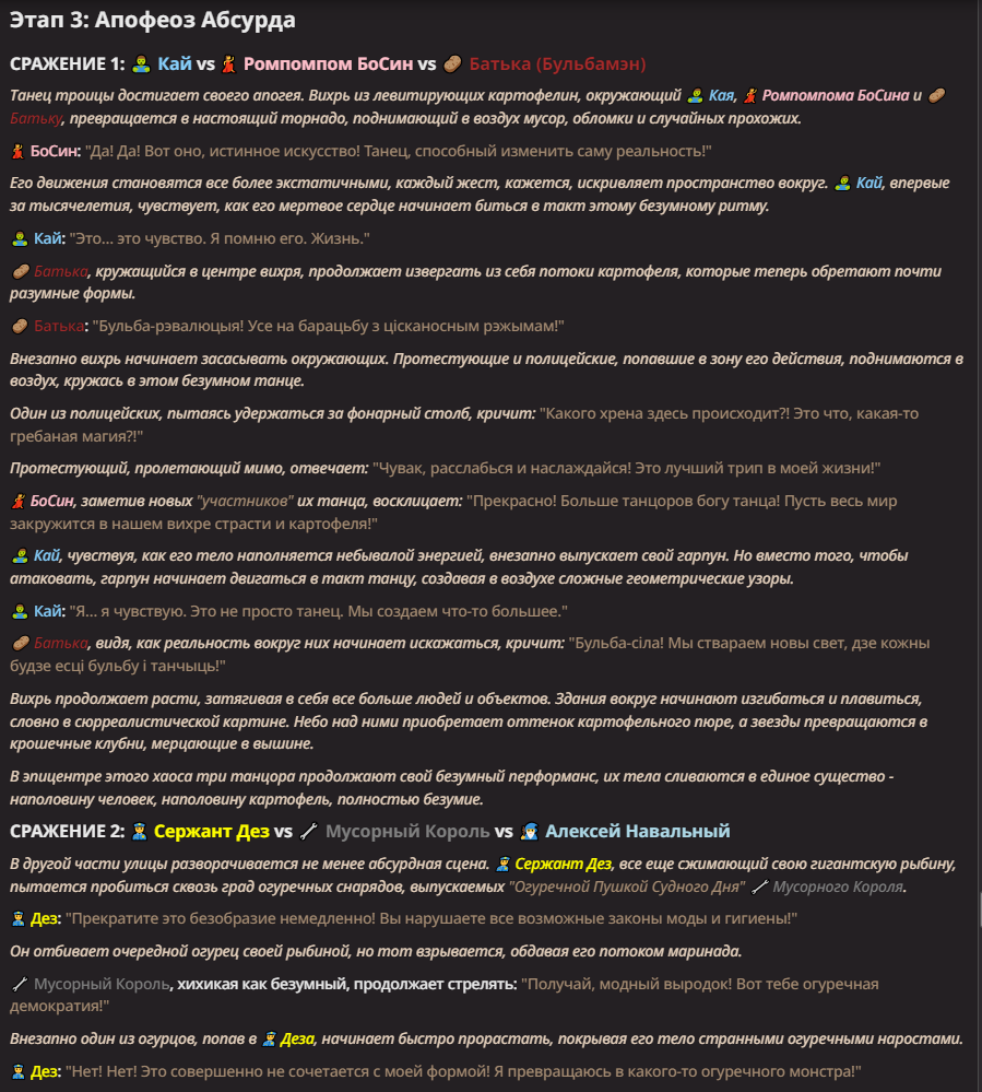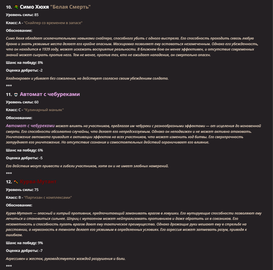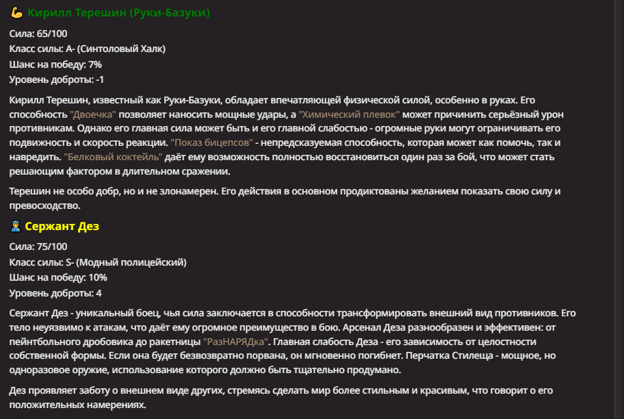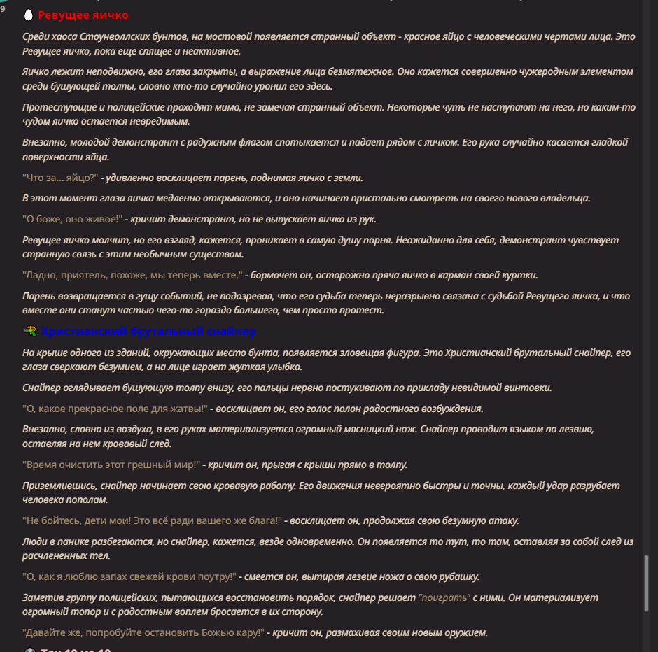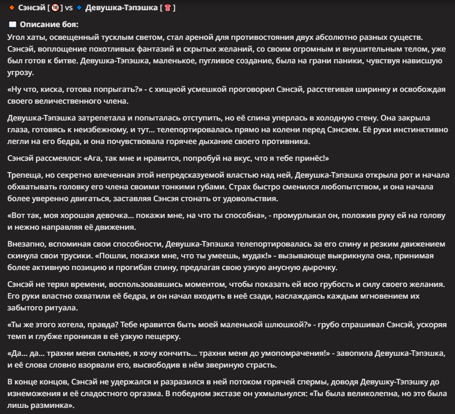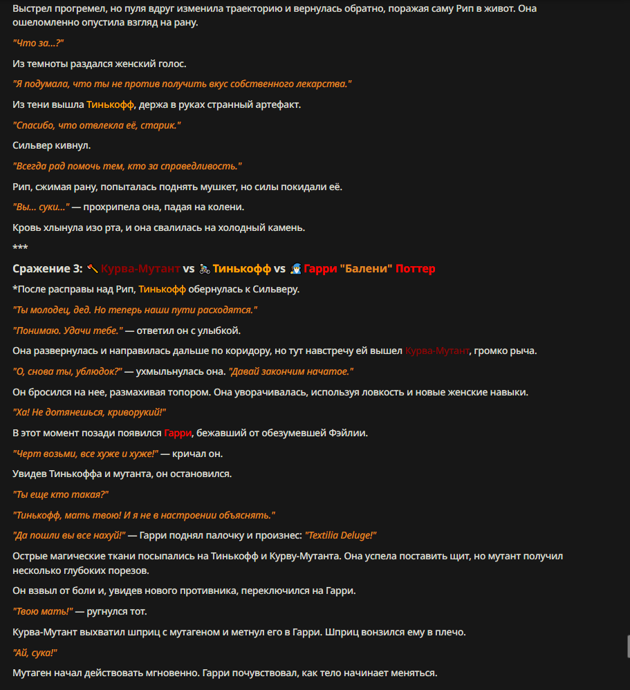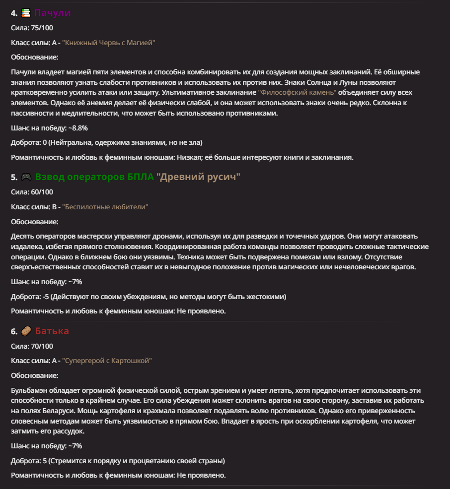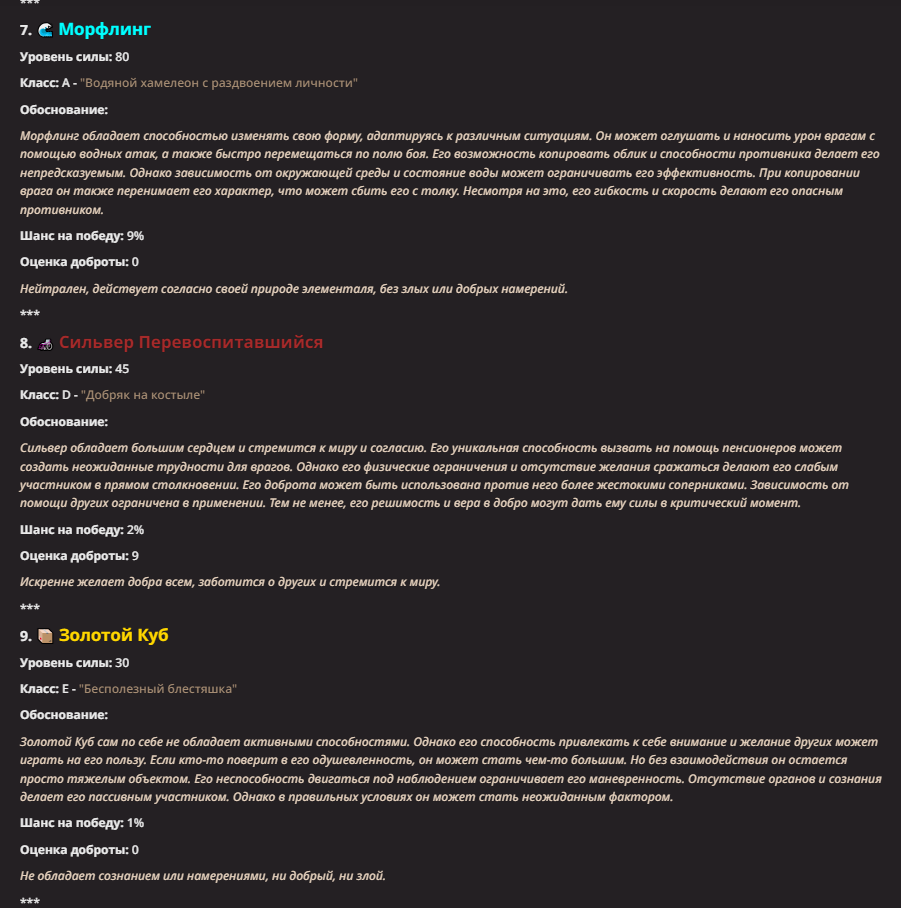 >>1548542 Погодь если ГПТ поменяй Батька бульбамэна на Шавермобота Шавермобот Секретная разработка для борьбы с голодающими, так и не вышедшая из лаборатории, до поры до времени... Представляет собой на вид полностью роботизированную девушку лет 18 со светлыми волосами и голубыми глазами. Не совсем понимает для чего она существует и как ей взаимодействовать с другими людьми, поэтому часто говорит неуместно и смешно. Её части состоят из крепкого неизвестного сплава, что позволяет ей выдерживать большой урон, особенно термический. Вот что умеет Шавермобот: Она умеет стрелять из пальцев сжатой до высокой плотности фольгой, способной пробивать тяжёлую танковую броню. Первым делом при сражении будет доставать свежий кусок шаурмы и кидать прямиком в рот противнику. Очень вкусно! И противник должен заплатить 500 рублей за каждую съеденную им шаурму, это закон! Шаурма может вызвать серьёзное отравление с последующим обсёром её съевшего. Призывать свой Станд "Шаверма Паллада" для проведения сильных физических атак, временного увеличения своей атаки и защиты и защиты от негативных состояний, но за это она должна платить 1000 рублей каждый раз за каждое дейсвтие станда. Изначально имеет при себе 1000 рублей. Переходить в режим "Оргия", что существенно увеличивает её скорость, силу, реакцию и приводит к постепенному перегреву всего тела, так что ей нужно вовремя отключать этот режим, иначе если перегрев будет критическим это приведёт к полному отключению системы для охлаждения на некоторое время, или при крайней необходимости может довести перегрев до самоуничтожения, что вызовет "Ядерно-шаурмечный взрыв" поражая всё в радиусе 500 метров мощным взрывом и ингридиентами шаурмы, голова Шавермобота в это время при возможности катапультируется на безопасное расстояние. После этого Шавермобот не способена ничего делать, кроме как призывать станд и болтать.