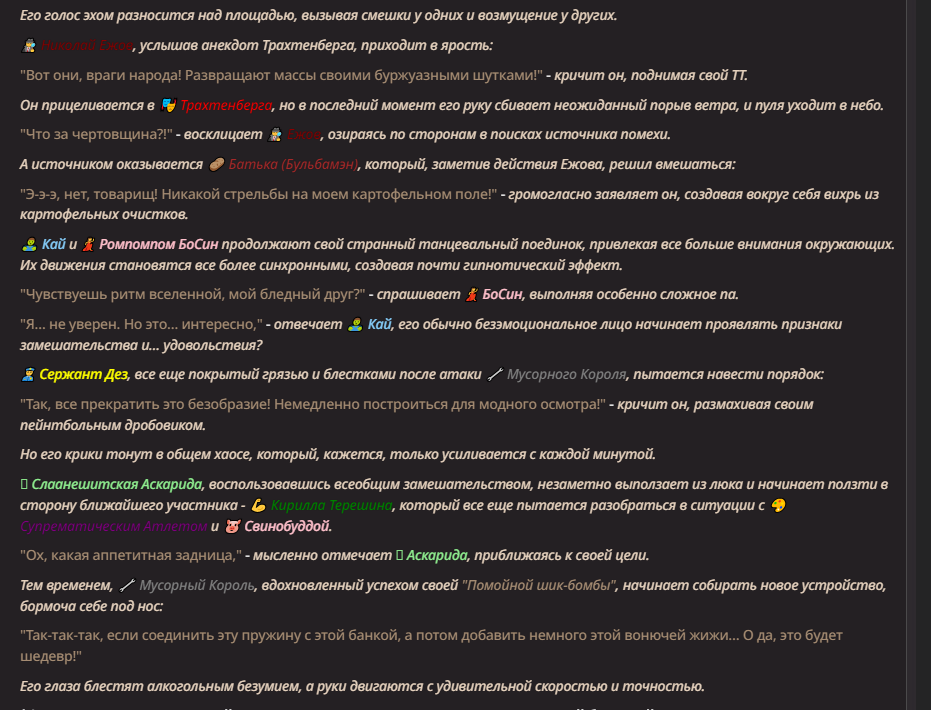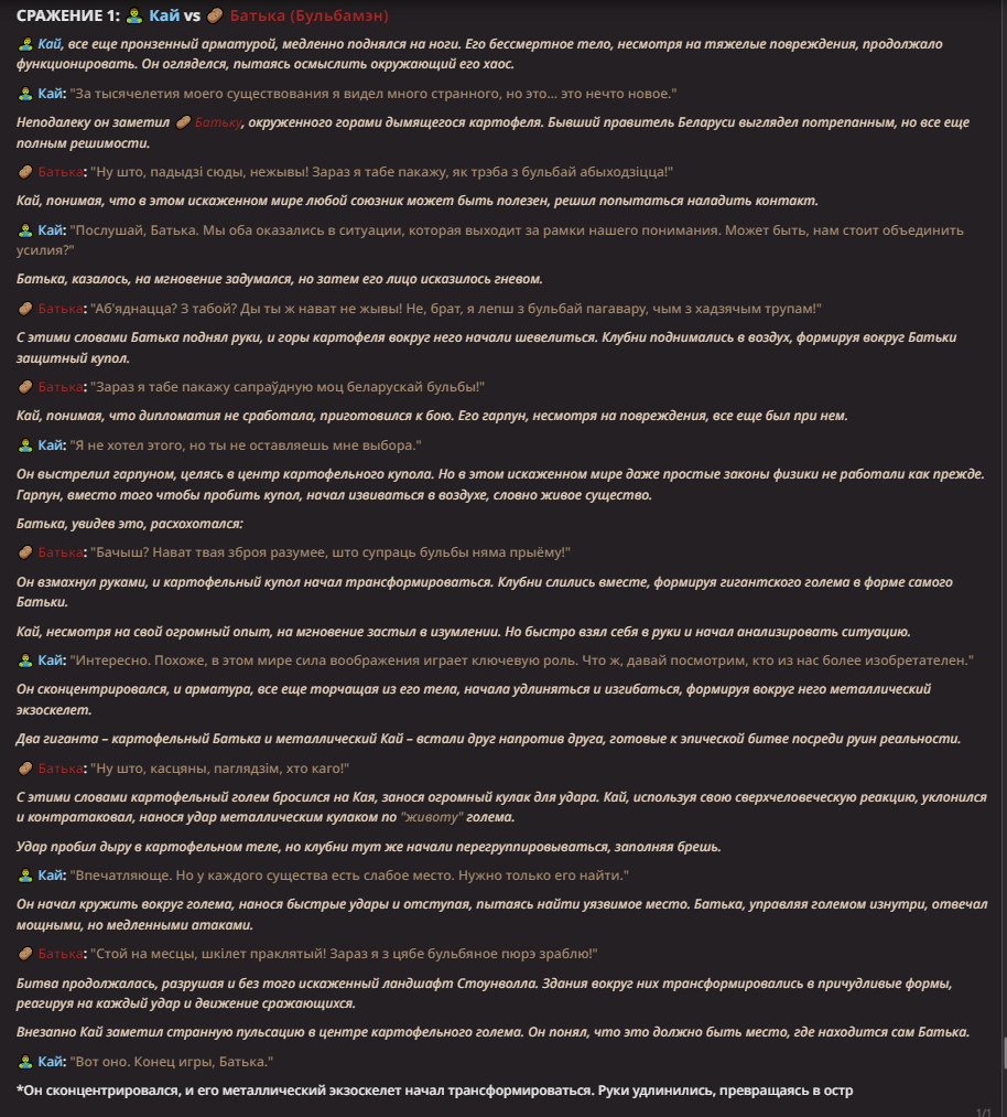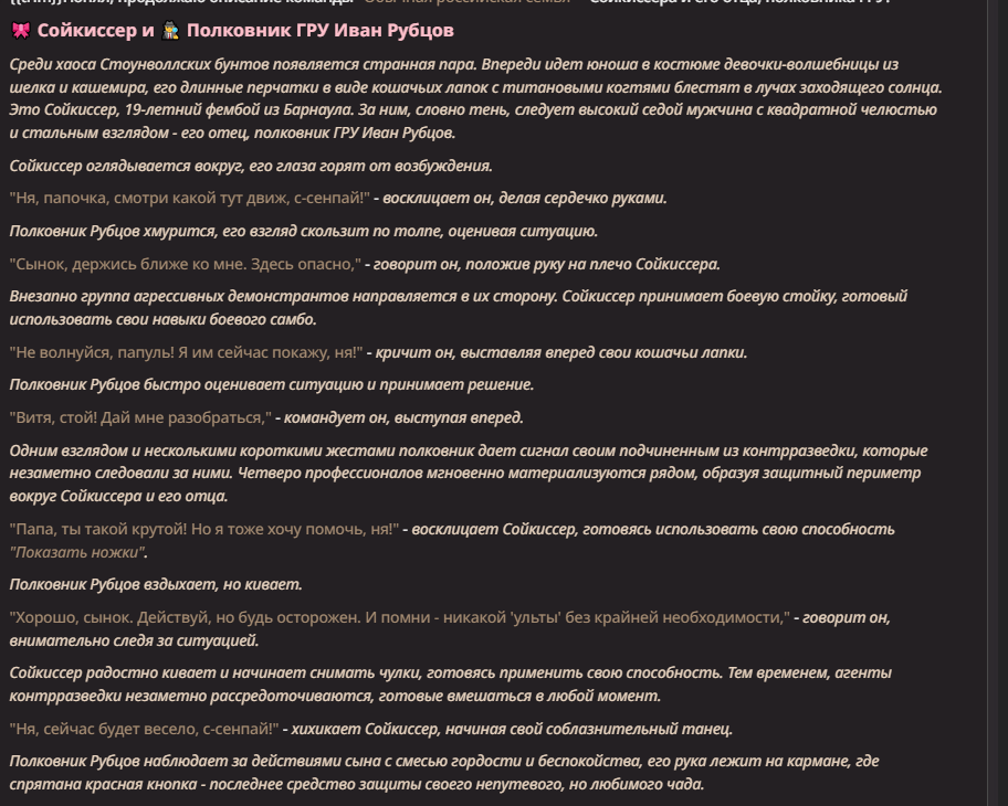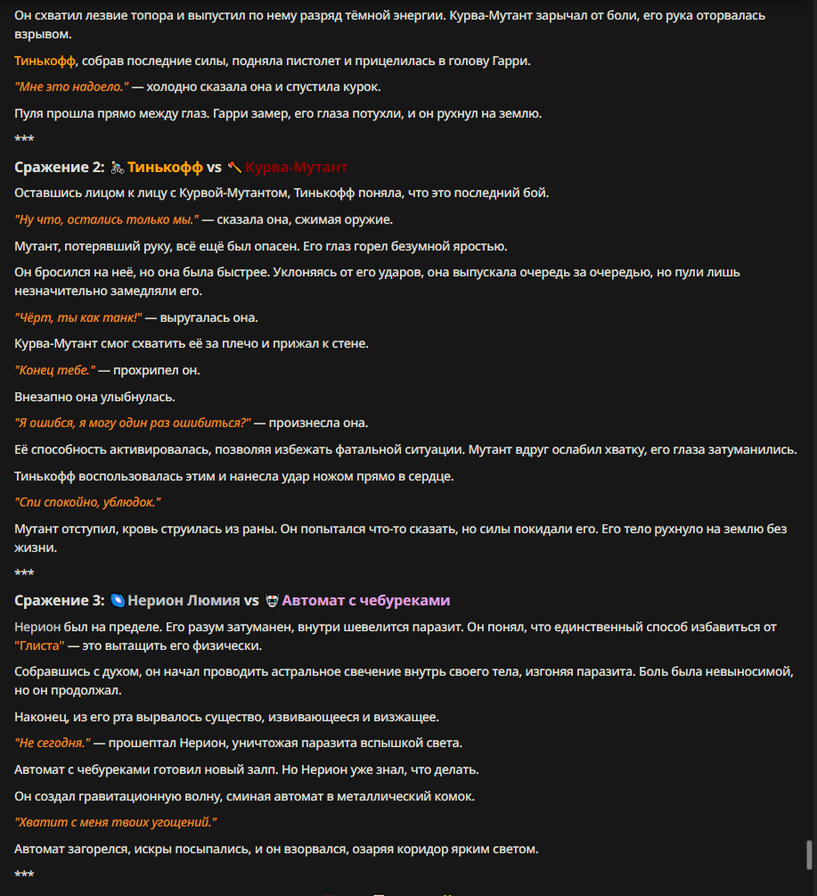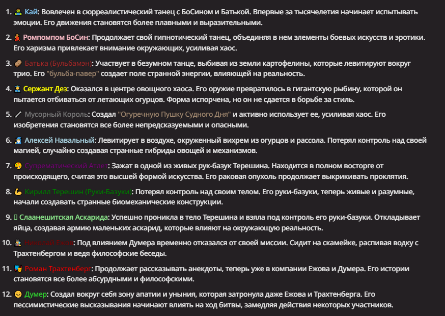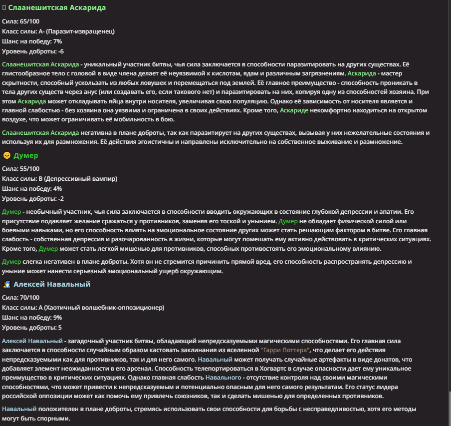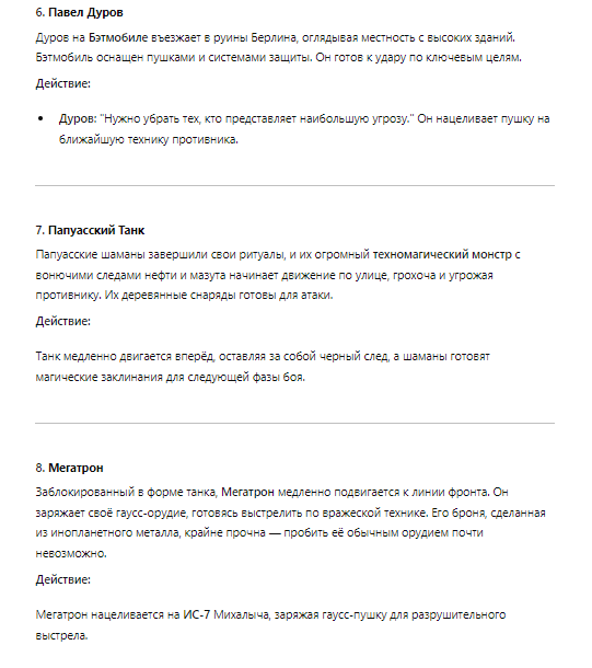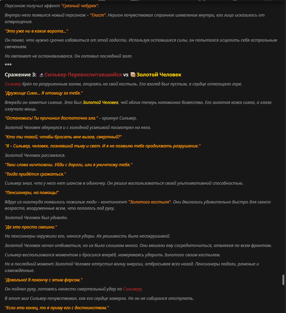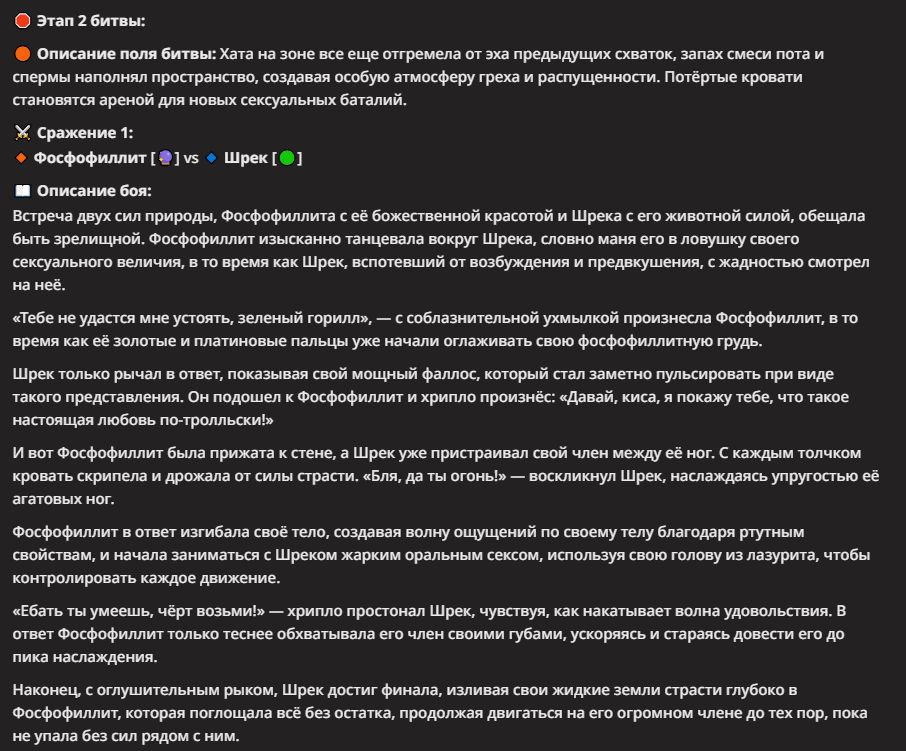 >>1548542 Погодь если ГПТ поменяй Батька бульбамэна на Шавермобота Шавермобот Секретная разработка для борьбы с голодающими, так и не вышедшая из лаборатории, до поры до времени... Представляет собой на вид полностью роботизированную девушку лет 18 со светлыми волосами и голубыми глазами. Не совсем понимает для чего она существует и как ей взаимодействовать с другими людьми, поэтому часто говорит неуместно и смешно. Её части состоят из крепкого неизвестного сплава, что позволяет ей выдерживать большой урон, особенно термический. Вот что умеет Шавермобот: Она умеет стрелять из пальцев сжатой до высокой плотности фольгой, способной пробивать тяжёлую танковую броню. Первым делом при сражении будет доставать свежий кусок шаурмы и кидать прямиком в рот противнику. Очень вкусно! И противник должен заплатить 500 рублей за каждую съеденную им шаурму, это закон! Шаурма может вызвать серьёзное отравление с последующим обсёром её съевшего. Призывать свой Станд "Шаверма Паллада" для проведения сильных физических атак, временного увеличения своей атаки и защиты и защиты от негативных состояний, но за это она должна платить 1000 рублей каждый раз за каждое дейсвтие станда. Изначально имеет при себе 1000 рублей. Переходить в режим "Оргия", что существенно увеличивает её скорость, силу, реакцию и приводит к постепенному перегреву всего тела, так что ей нужно вовремя отключать этот режим, иначе если перегрев будет критическим это приведёт к полному отключению системы для охлаждения на некоторое время, или при крайней необходимости может довести перегрев до самоуничтожения, что вызовет "Ядерно-шаурмечный взрыв" поражая всё в радиусе 500 метров мощным взрывом и ингридиентами шаурмы, голова Шавермобота в это время при возможности катапультируется на безопасное расстояние. После этого Шавермобот не способена ничего делать, кроме как призывать станд и болтать.