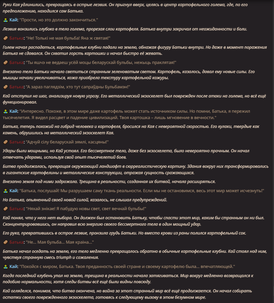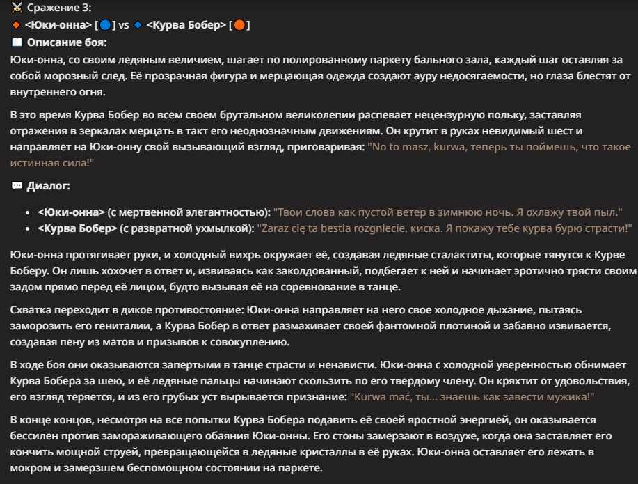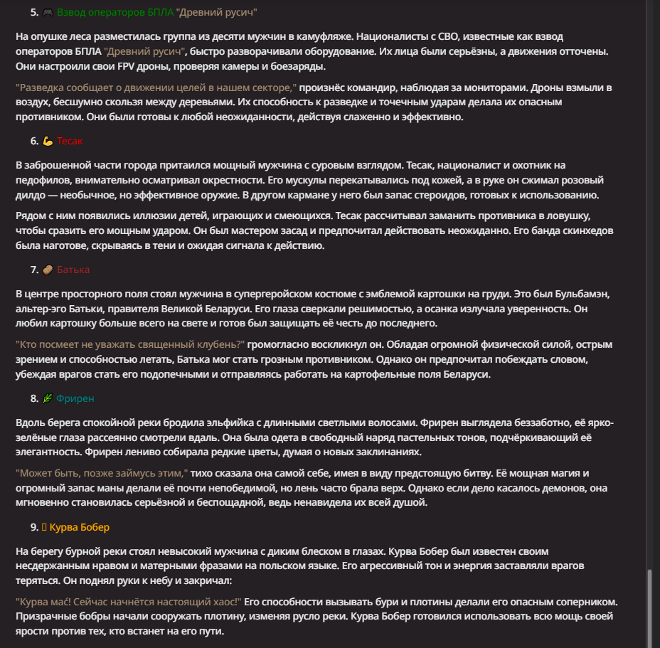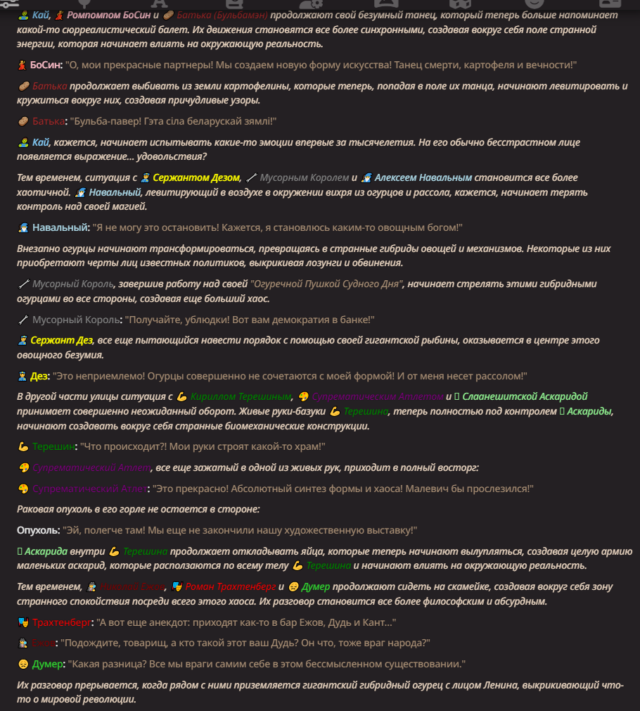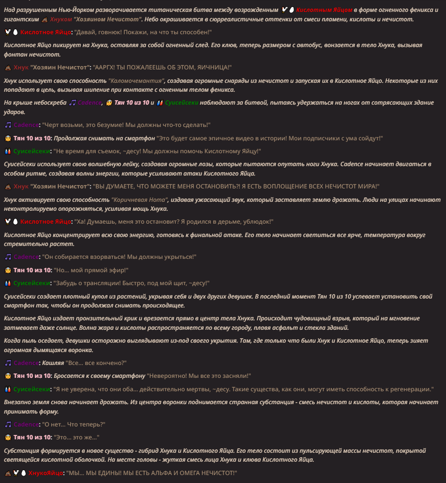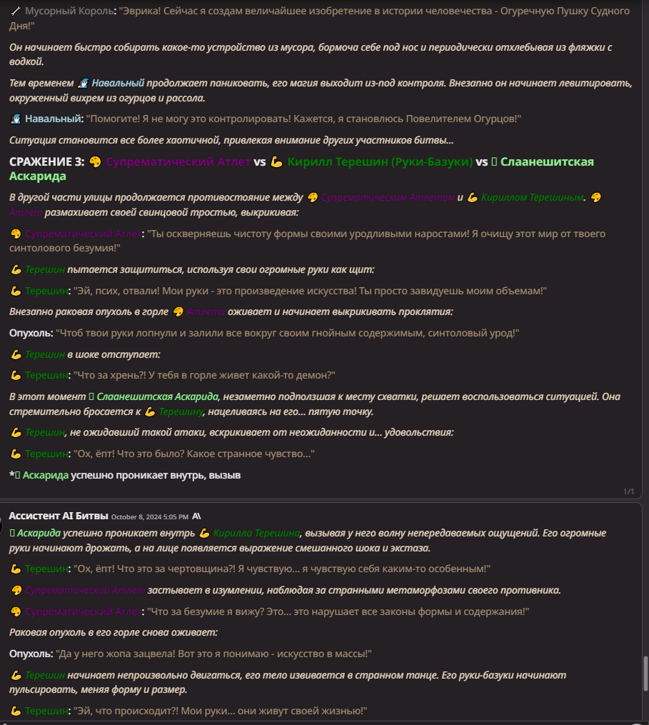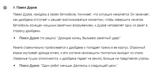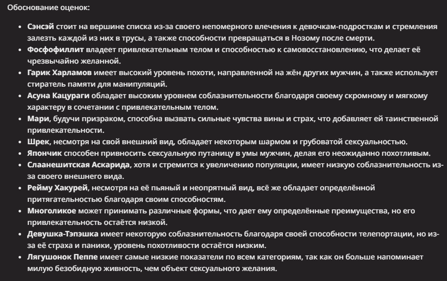 >>1548542 Погодь если ГПТ поменяй Батька бульбамэна на Шавермобота Шавермобот Секретная разработка для борьбы с голодающими, так и не вышедшая из лаборатории, до поры до времени... Представляет собой на вид полностью роботизированную девушку лет 18 со светлыми волосами и голубыми глазами. Не совсем понимает для чего она существует и как ей взаимодействовать с другими людьми, поэтому часто говорит неуместно и смешно. Её части состоят из крепкого неизвестного сплава, что позволяет ей выдерживать большой урон, особенно термический. Вот что умеет Шавермобот: Она умеет стрелять из пальцев сжатой до высокой плотности фольгой, способной пробивать тяжёлую танковую броню. Первым делом при сражении будет доставать свежий кусок шаурмы и кидать прямиком в рот противнику. Очень вкусно! И противник должен заплатить 500 рублей за каждую съеденную им шаурму, это закон! Шаурма может вызвать серьёзное отравление с последующим обсёром её съевшего. Призывать свой Станд "Шаверма Паллада" для проведения сильных физических атак, временного увеличения своей атаки и защиты и защиты от негативных состояний, но за это она должна платить 1000 рублей каждый раз за каждое дейсвтие станда. Изначально имеет при себе 1000 рублей. Переходить в режим "Оргия", что существенно увеличивает её скорость, силу, реакцию и приводит к постепенному перегреву всего тела, так что ей нужно вовремя отключать этот режим, иначе если перегрев будет критическим это приведёт к полному отключению системы для охлаждения на некоторое время, или при крайней необходимости может довести перегрев до самоуничтожения, что вызовет "Ядерно-шаурмечный взрыв" поражая всё в радиусе 500 метров мощным взрывом и ингридиентами шаурмы, голова Шавермобота в это время при возможности катапультируется на безопасное расстояние. После этого Шавермобот не способена ничего делать, кроме как призывать станд и болтать.