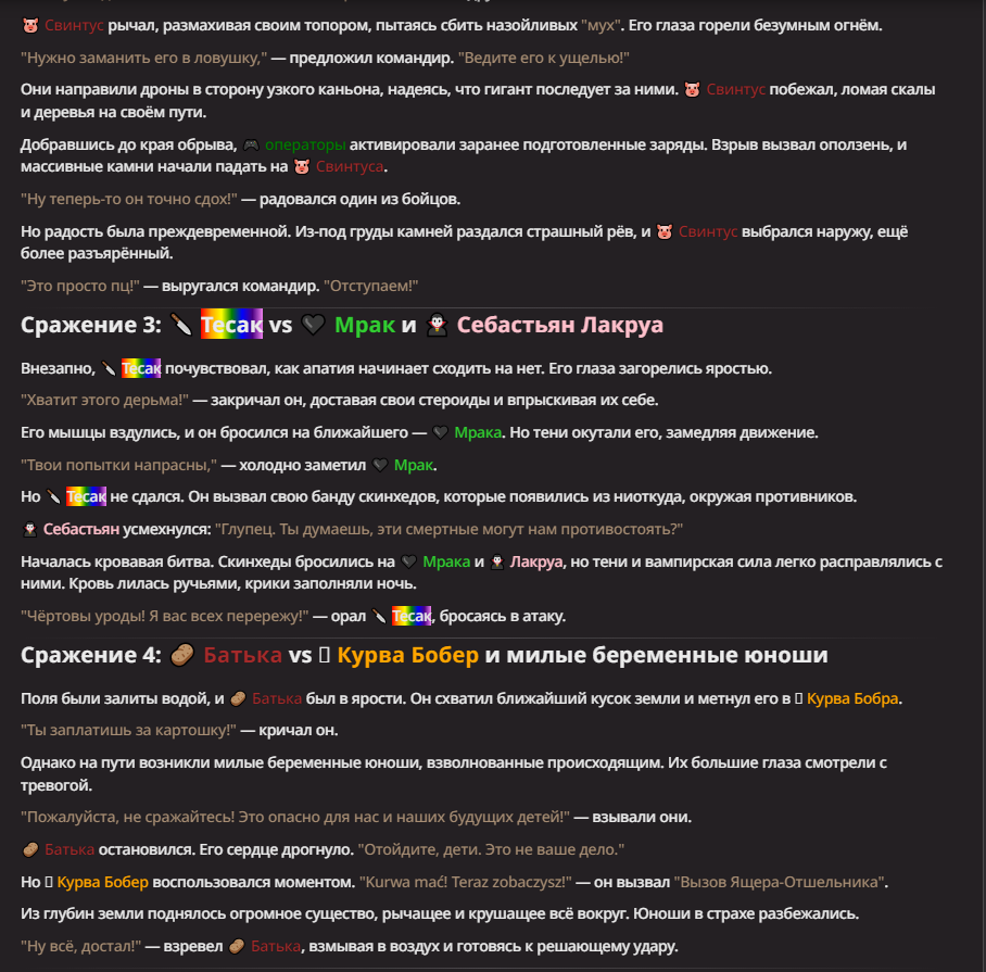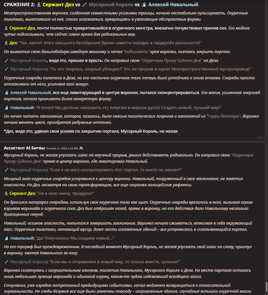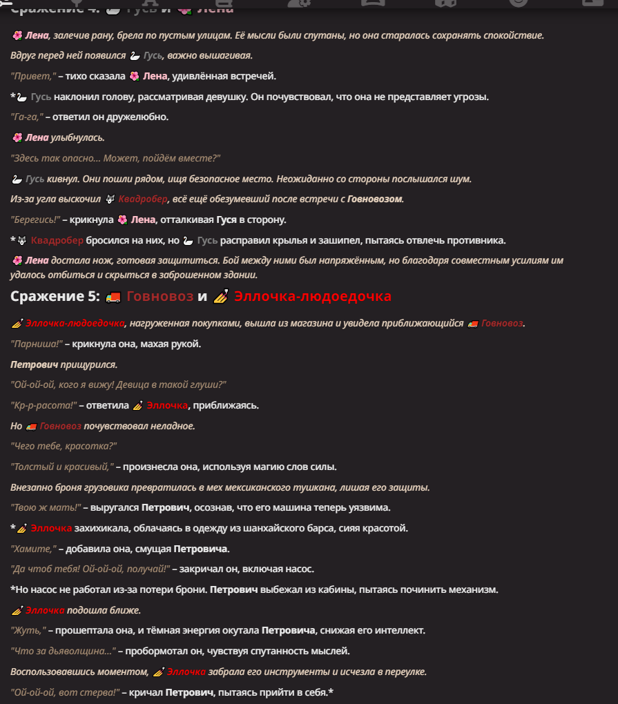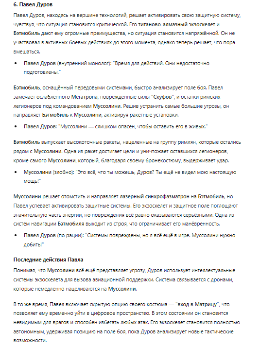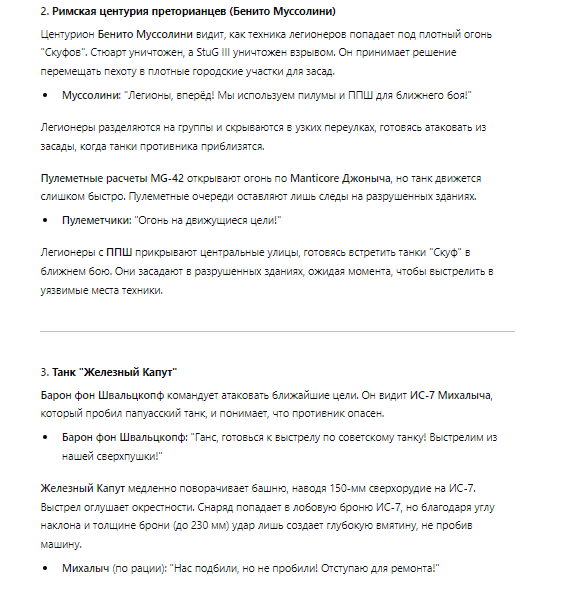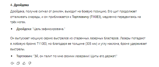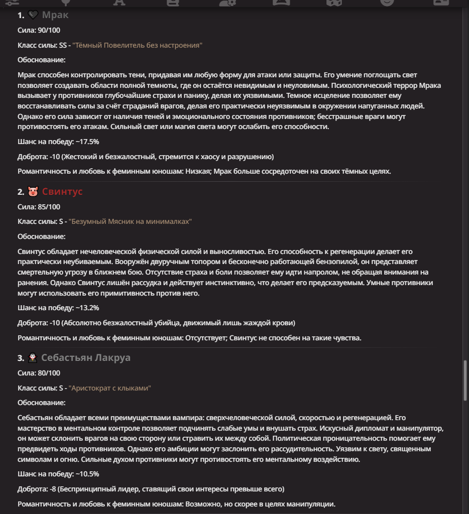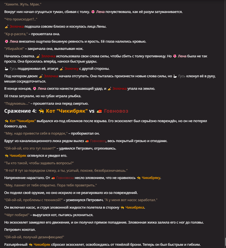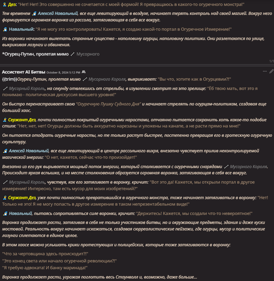 >>1548542 Погодь если ГПТ поменяй Батька бульбамэна на Шавермобота Шавермобот Секретная разработка для борьбы с голодающими, так и не вышедшая из лаборатории, до поры до времени... Представляет собой на вид полностью роботизированную девушку лет 18 со светлыми волосами и голубыми глазами. Не совсем понимает для чего она существует и как ей взаимодействовать с другими людьми, поэтому часто говорит неуместно и смешно. Её части состоят из крепкого неизвестного сплава, что позволяет ей выдерживать большой урон, особенно термический. Вот что умеет Шавермобот: Она умеет стрелять из пальцев сжатой до высокой плотности фольгой, способной пробивать тяжёлую танковую броню. Первым делом при сражении будет доставать свежий кусок шаурмы и кидать прямиком в рот противнику. Очень вкусно! И противник должен заплатить 500 рублей за каждую съеденную им шаурму, это закон! Шаурма может вызвать серьёзное отравление с последующим обсёром её съевшего. Призывать свой Станд "Шаверма Паллада" для проведения сильных физических атак, временного увеличения своей атаки и защиты и защиты от негативных состояний, но за это она должна платить 1000 рублей каждый раз за каждое дейсвтие станда. Изначально имеет при себе 1000 рублей. Переходить в режим "Оргия", что существенно увеличивает её скорость, силу, реакцию и приводит к постепенному перегреву всего тела, так что ей нужно вовремя отключать этот режим, иначе если перегрев будет критическим это приведёт к полному отключению системы для охлаждения на некоторое время, или при крайней необходимости может довести перегрев до самоуничтожения, что вызовет "Ядерно-шаурмечный взрыв" поражая всё в радиусе 500 метров мощным взрывом и ингридиентами шаурмы, голова Шавермобота в это время при возможности катапультируется на безопасное расстояние. После этого Шавермобот не способена ничего делать, кроме как призывать станд и болтать.