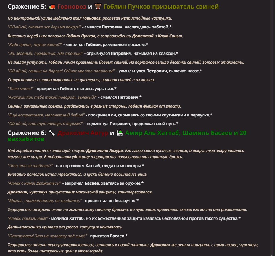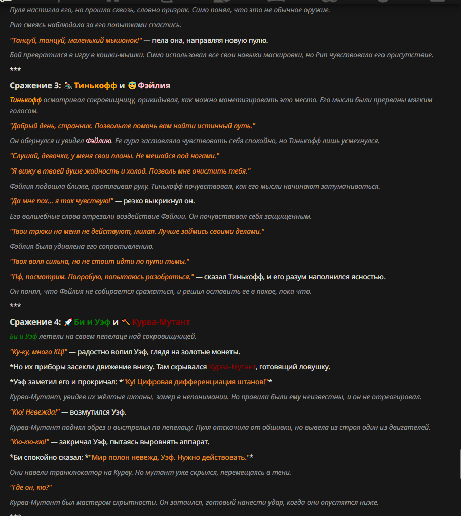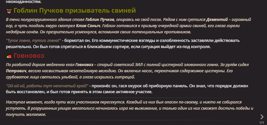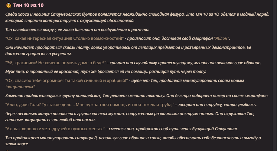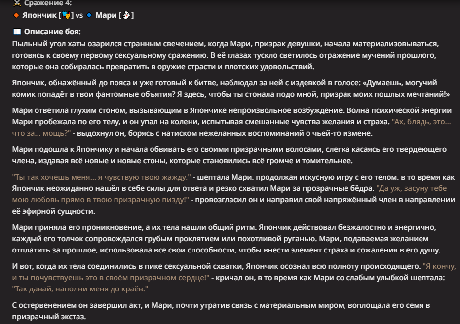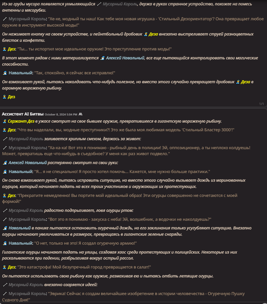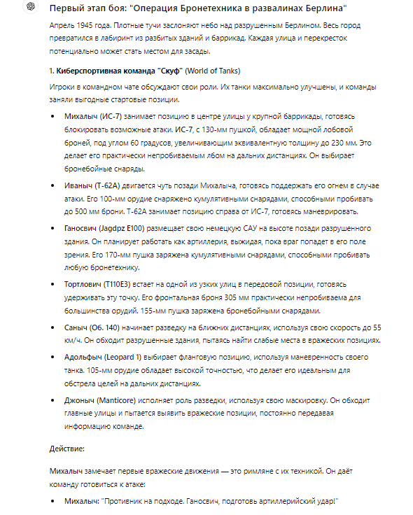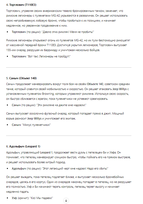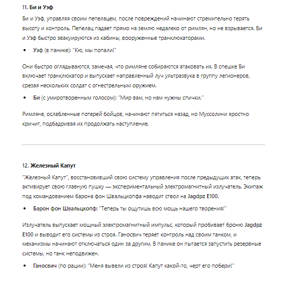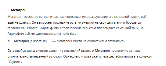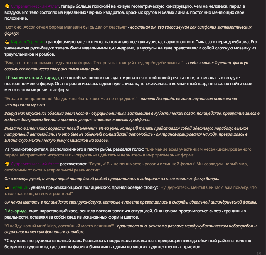 >>1548542 Погодь если ГПТ поменяй Батька бульбамэна на Шавермобота Шавермобот Секретная разработка для борьбы с голодающими, так и не вышедшая из лаборатории, до поры до времени... Представляет собой на вид полностью роботизированную девушку лет 18 со светлыми волосами и голубыми глазами. Не совсем понимает для чего она существует и как ей взаимодействовать с другими людьми, поэтому часто говорит неуместно и смешно. Её части состоят из крепкого неизвестного сплава, что позволяет ей выдерживать большой урон, особенно термический. Вот что умеет Шавермобот: Она умеет стрелять из пальцев сжатой до высокой плотности фольгой, способной пробивать тяжёлую танковую броню. Первым делом при сражении будет доставать свежий кусок шаурмы и кидать прямиком в рот противнику. Очень вкусно! И противник должен заплатить 500 рублей за каждую съеденную им шаурму, это закон! Шаурма может вызвать серьёзное отравление с последующим обсёром её съевшего. Призывать свой Станд "Шаверма Паллада" для проведения сильных физических атак, временного увеличения своей атаки и защиты и защиты от негативных состояний, но за это она должна платить 1000 рублей каждый раз за каждое дейсвтие станда. Изначально имеет при себе 1000 рублей. Переходить в режим "Оргия", что существенно увеличивает её скорость, силу, реакцию и приводит к постепенному перегреву всего тела, так что ей нужно вовремя отключать этот режим, иначе если перегрев будет критическим это приведёт к полному отключению системы для охлаждения на некоторое время, или при крайней необходимости может довести перегрев до самоуничтожения, что вызовет "Ядерно-шаурмечный взрыв" поражая всё в радиусе 500 метров мощным взрывом и ингридиентами шаурмы, голова Шавермобота в это время при возможности катапультируется на безопасное расстояние. После этого Шавермобот не способена ничего делать, кроме как призывать станд и болтать.
