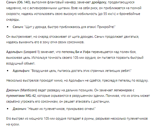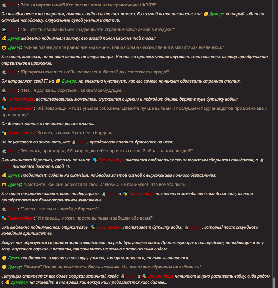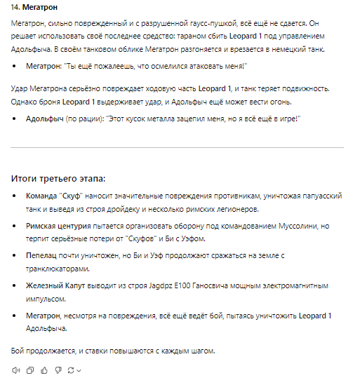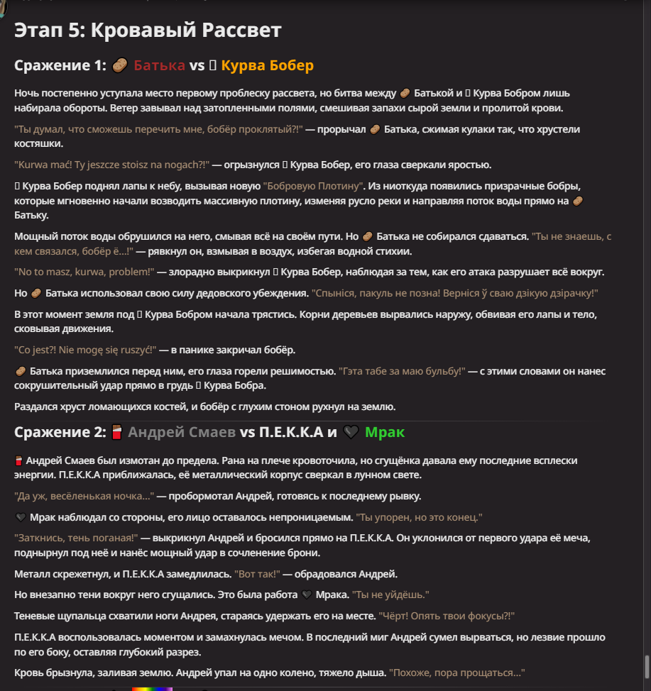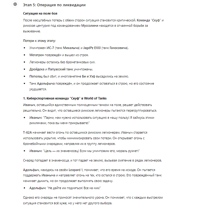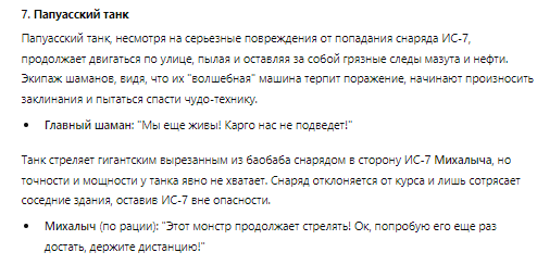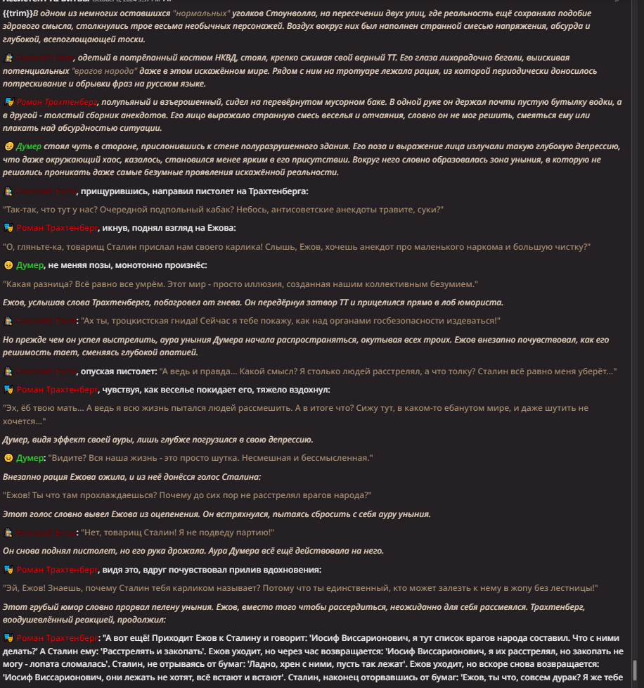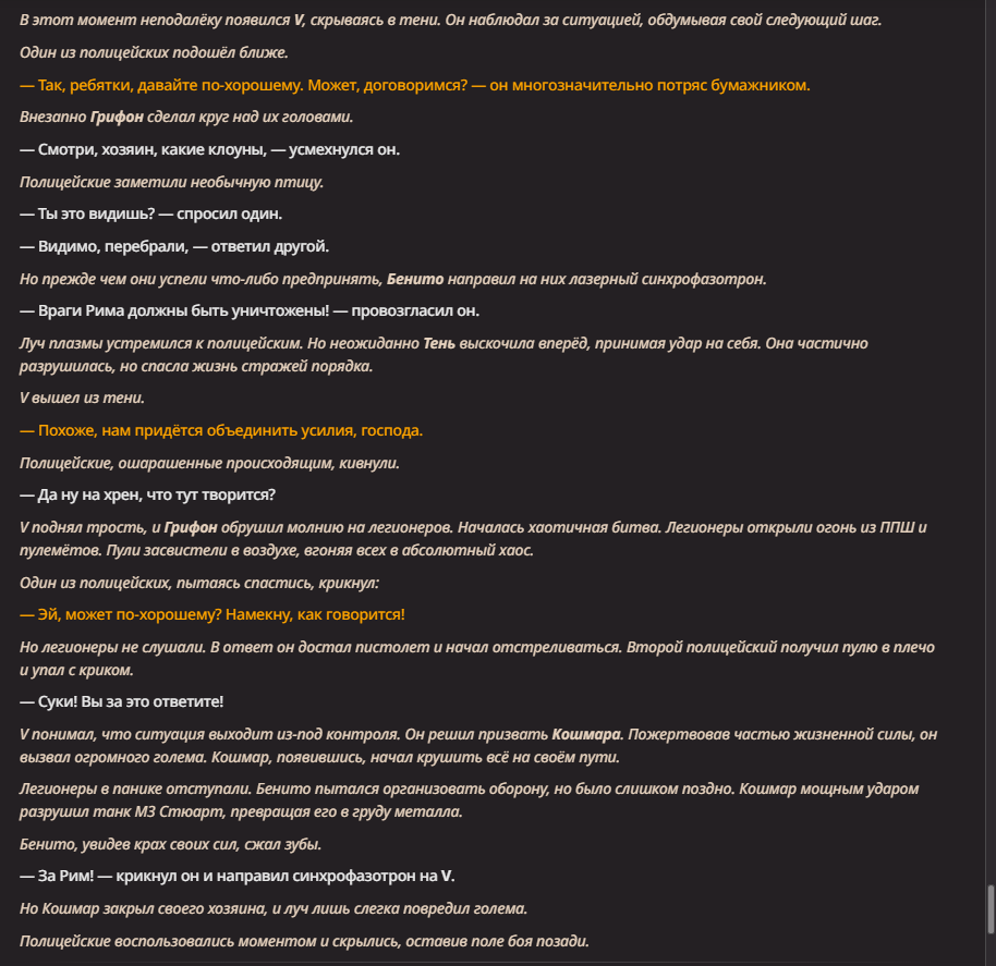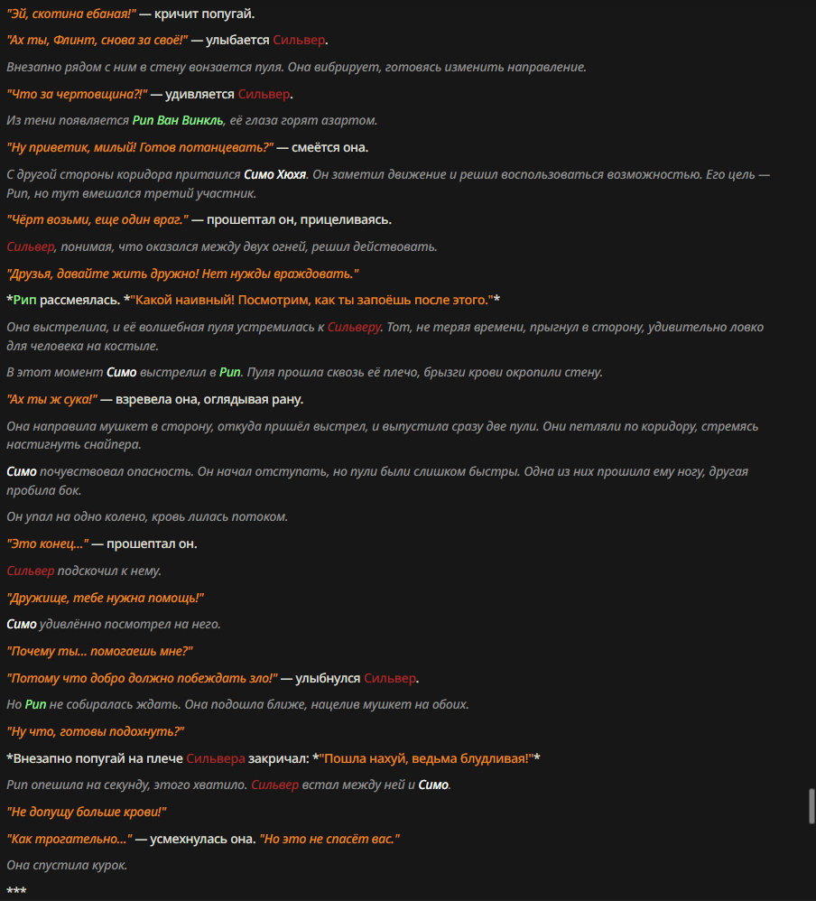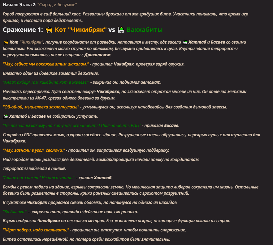 >>1548542 Погодь если ГПТ поменяй Батька бульбамэна на Шавермобота Шавермобот Секретная разработка для борьбы с голодающими, так и не вышедшая из лаборатории, до поры до времени... Представляет собой на вид полностью роботизированную девушку лет 18 со светлыми волосами и голубыми глазами. Не совсем понимает для чего она существует и как ей взаимодействовать с другими людьми, поэтому часто говорит неуместно и смешно. Её части состоят из крепкого неизвестного сплава, что позволяет ей выдерживать большой урон, особенно термический. Вот что умеет Шавермобот: Она умеет стрелять из пальцев сжатой до высокой плотности фольгой, способной пробивать тяжёлую танковую броню. Первым делом при сражении будет доставать свежий кусок шаурмы и кидать прямиком в рот противнику. Очень вкусно! И противник должен заплатить 500 рублей за каждую съеденную им шаурму, это закон! Шаурма может вызвать серьёзное отравление с последующим обсёром её съевшего. Призывать свой Станд "Шаверма Паллада" для проведения сильных физических атак, временного увеличения своей атаки и защиты и защиты от негативных состояний, но за это она должна платить 1000 рублей каждый раз за каждое дейсвтие станда. Изначально имеет при себе 1000 рублей. Переходить в режим "Оргия", что существенно увеличивает её скорость, силу, реакцию и приводит к постепенному перегреву всего тела, так что ей нужно вовремя отключать этот режим, иначе если перегрев будет критическим это приведёт к полному отключению системы для охлаждения на некоторое время, или при крайней необходимости может довести перегрев до самоуничтожения, что вызовет "Ядерно-шаурмечный взрыв" поражая всё в радиусе 500 метров мощным взрывом и ингридиентами шаурмы, голова Шавермобота в это время при возможности катапультируется на безопасное расстояние. После этого Шавермобот не способена ничего делать, кроме как призывать станд и болтать.