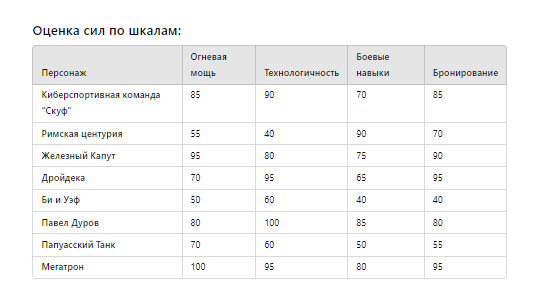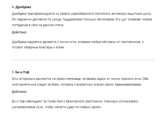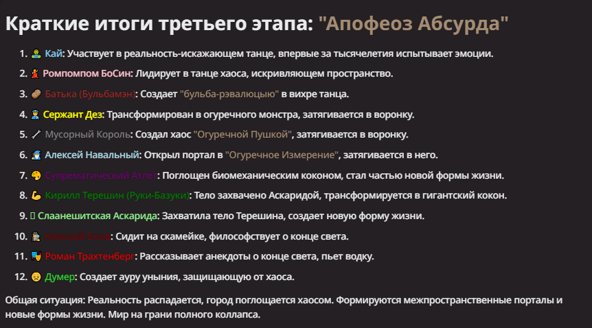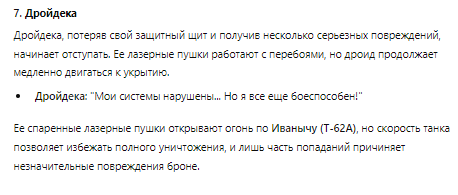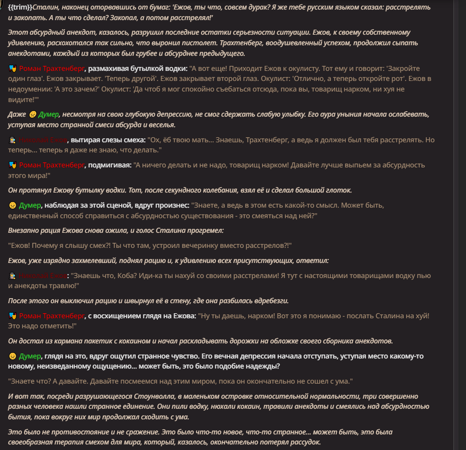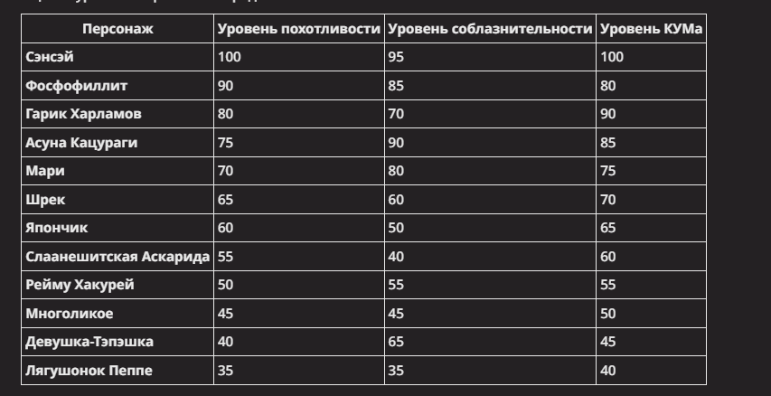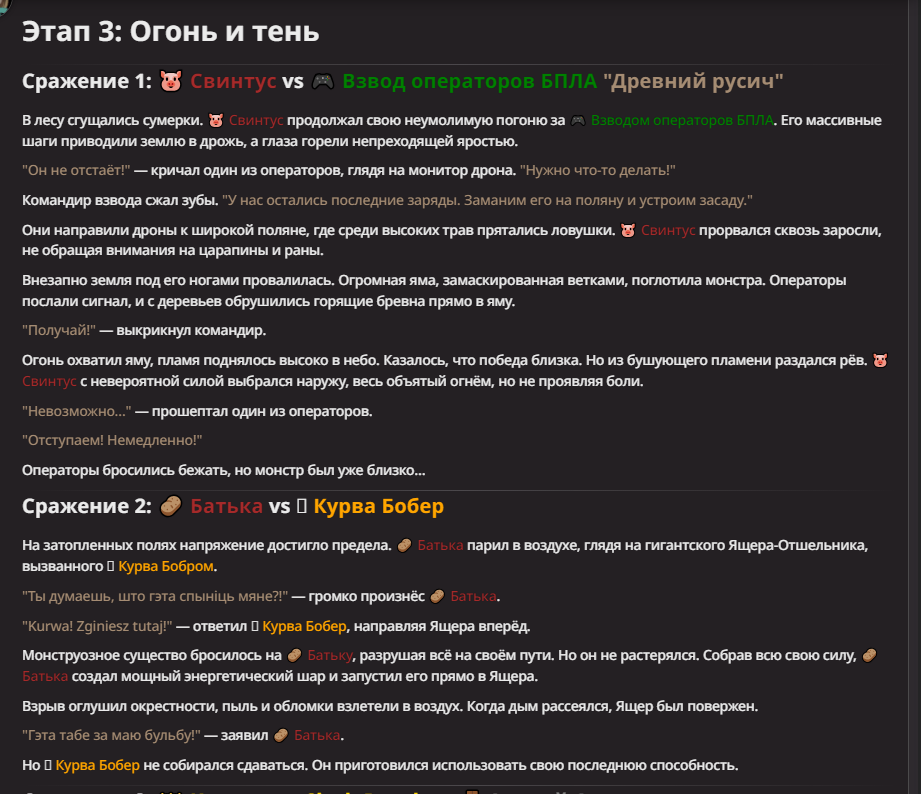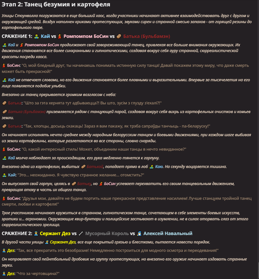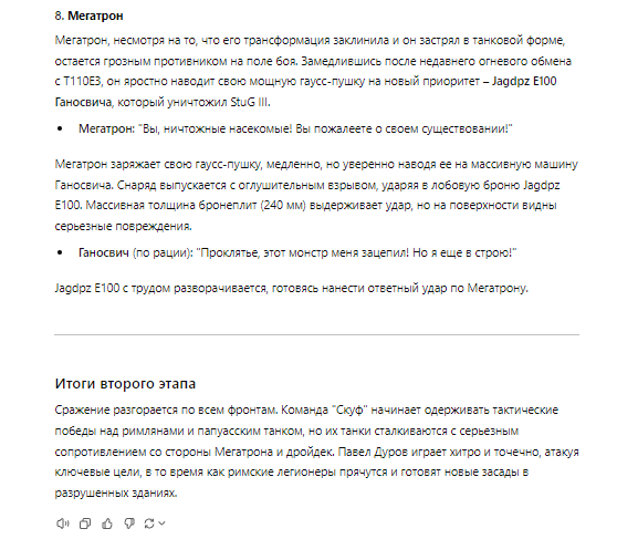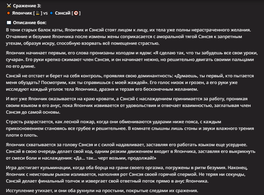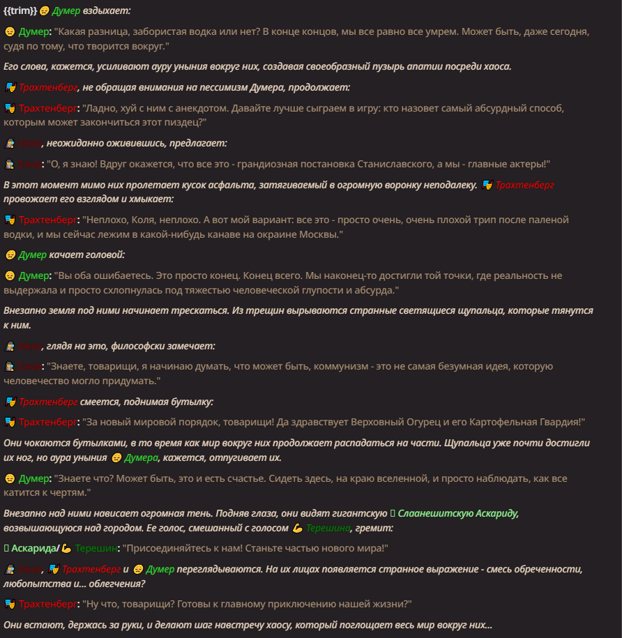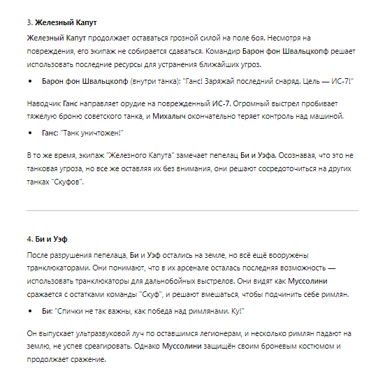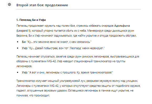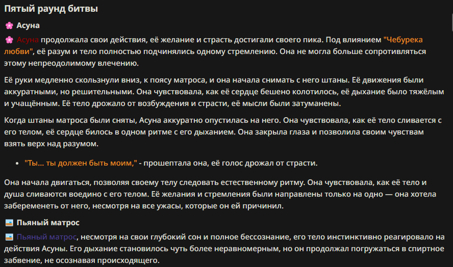 >>1548542 Погодь если ГПТ поменяй Батька бульбамэна на Шавермобота Шавермобот Секретная разработка для борьбы с голодающими, так и не вышедшая из лаборатории, до поры до времени... Представляет собой на вид полностью роботизированную девушку лет 18 со светлыми волосами и голубыми глазами. Не совсем понимает для чего она существует и как ей взаимодействовать с другими людьми, поэтому часто говорит неуместно и смешно. Её части состоят из крепкого неизвестного сплава, что позволяет ей выдерживать большой урон, особенно термический. Вот что умеет Шавермобот: Она умеет стрелять из пальцев сжатой до высокой плотности фольгой, способной пробивать тяжёлую танковую броню. Первым делом при сражении будет доставать свежий кусок шаурмы и кидать прямиком в рот противнику. Очень вкусно! И противник должен заплатить 500 рублей за каждую съеденную им шаурму, это закон! Шаурма может вызвать серьёзное отравление с последующим обсёром её съевшего. Призывать свой Станд "Шаверма Паллада" для проведения сильных физических атак, временного увеличения своей атаки и защиты и защиты от негативных состояний, но за это она должна платить 1000 рублей каждый раз за каждое дейсвтие станда. Изначально имеет при себе 1000 рублей. Переходить в режим "Оргия", что существенно увеличивает её скорость, силу, реакцию и приводит к постепенному перегреву всего тела, так что ей нужно вовремя отключать этот режим, иначе если перегрев будет критическим это приведёт к полному отключению системы для охлаждения на некоторое время, или при крайней необходимости может довести перегрев до самоуничтожения, что вызовет "Ядерно-шаурмечный взрыв" поражая всё в радиусе 500 метров мощным взрывом и ингридиентами шаурмы, голова Шавермобота в это время при возможности катапультируется на безопасное расстояние. После этого Шавермобот не способена ничего делать, кроме как призывать станд и болтать.