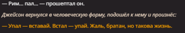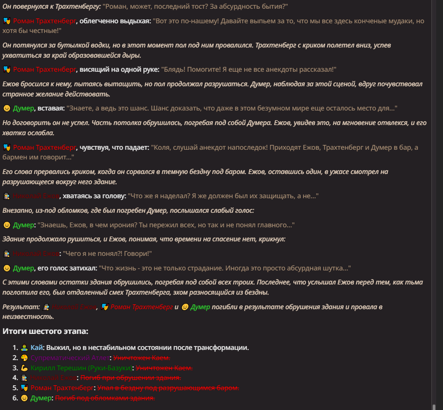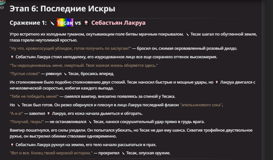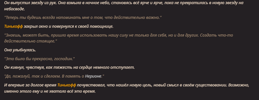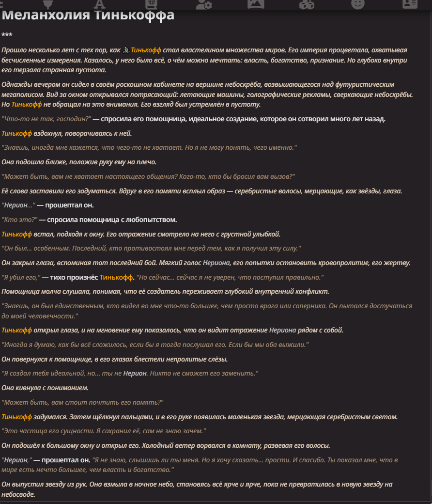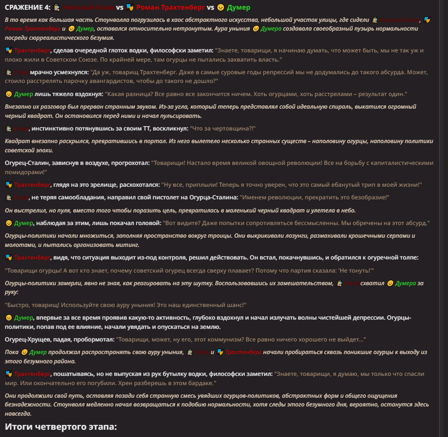 >>1548506 Тинькофф Бывший банкир и чемпион велоспорта, явившийся на великую битву, чтобы восстановить свою финансовую империю. Нажил себе столько врагов, что точно знает: в этом мире ему не дадут построить новый бизнес. Поэтому план Тинькоффа - раздать кредиты потусторонним сущностям и открыть отделения банков в других измерениях. Готовясь к битве, может купить себе экипировку (военную или гражданскую), которую сочтет подходящей. Освоил силу волшебных слов. Может воздействовать себя, противников или даже саму реальность своими кличами. Правда, список воздействий ограничен только пятью доступными фразами. "Попробую, попытаюсь разобраться" - преисполняет пониманием обстановки, считывает силы, слабости и намерения других, очищает сознание от любых эффектов, обманывающих восприятие. "Мне похуй, я так чувствую!" - позволяет находиться в экстремальной среде (под водой, в жерле вулкана, в открытом космосе и так далее) без вреда для здоровья. Однако, никак не спасет от обычной пули или клинка. "Я ошибся, я могу один раз ошибиться?" - один раз за битву может избежать любой фатальной ситуации. "Да, мне было страшно, но я это сделал!" - наделяет абсолютным бесстрашием и готовностью вершить любые дела. "Нету ни-ху-я! Просто ни-ху-я!" - полностью стирает из реальности любого врага. Броня или живучесть не спасут, однако, эту фразу надо произносить медленно, фокусируясь на цели. Если цель скроется из виду или концентрация Тинькоффа будет нарушена, клич не подействует.