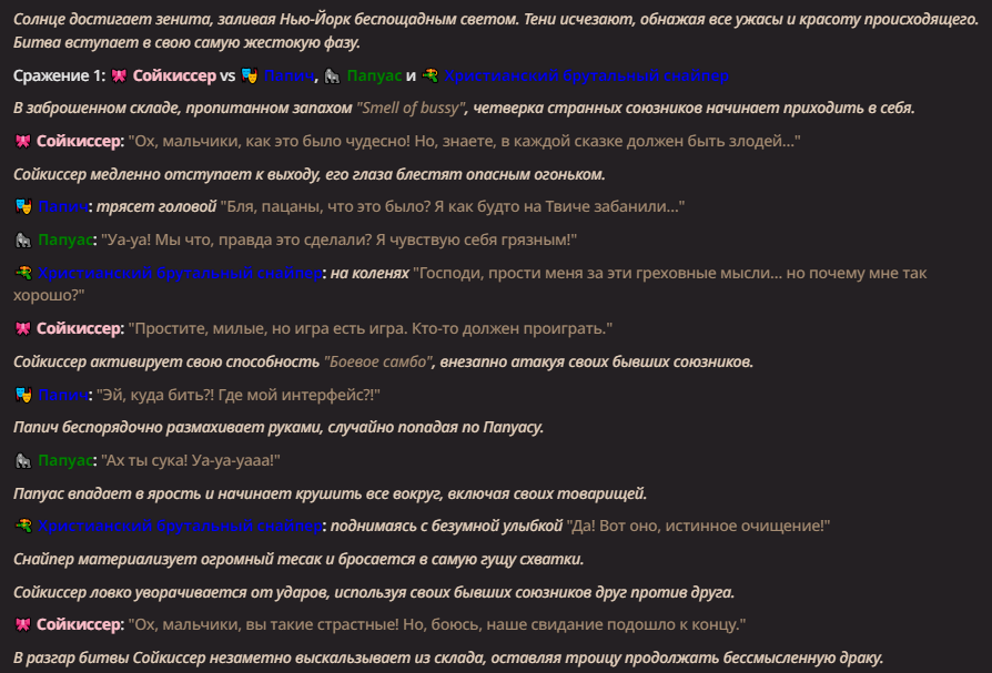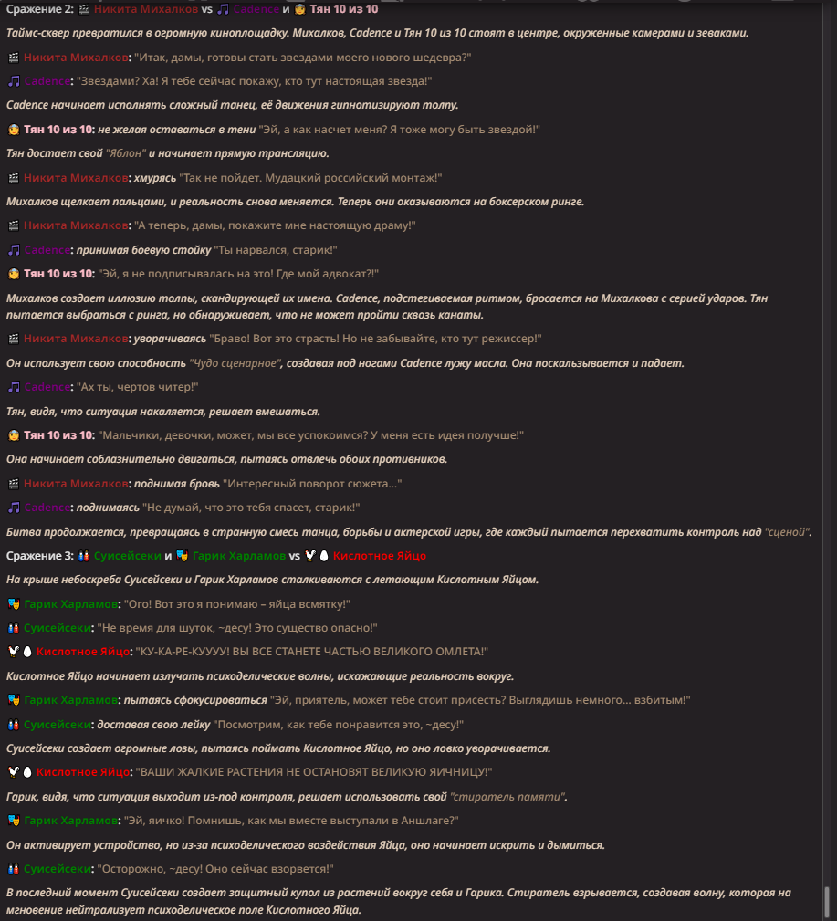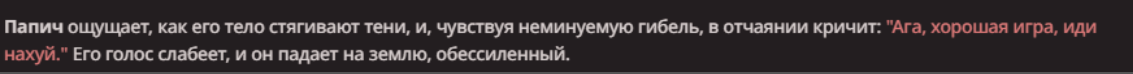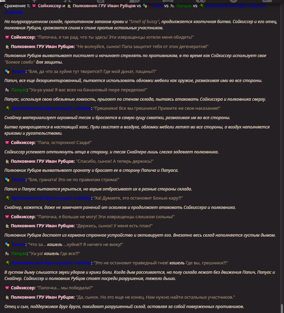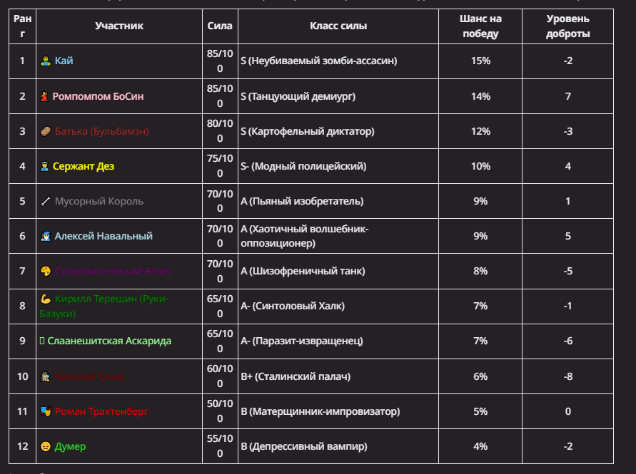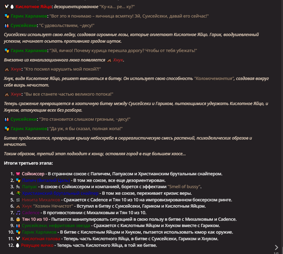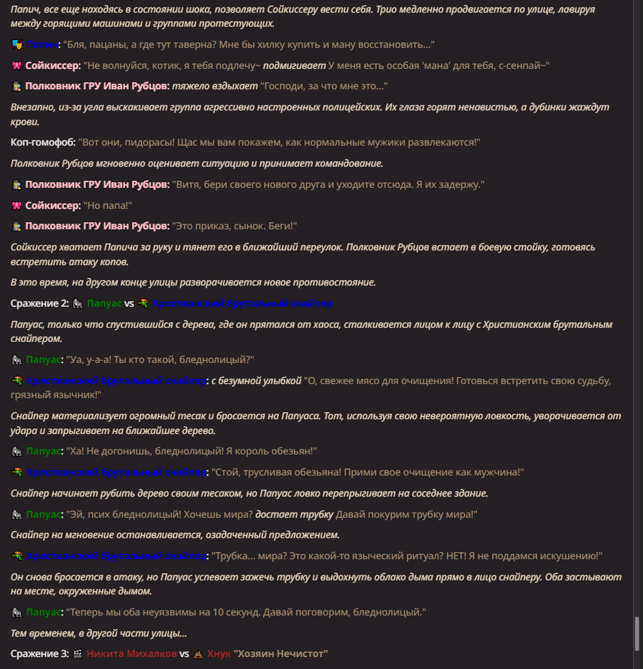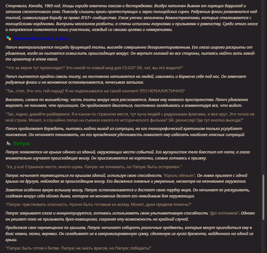 Вкидываю перса под клода: Папич(Виталий Цаль), известный стример прославившийся своей неординарностью и совершенно нестандатным и в большинстве случаев нелогичным мышлении и представлении о мире. Его вера в свою правоту настолько сильна, что может повлиять на мир вокруг него, но его влияние не слишком сильное. Постоянно докапывается до каждых мелочей. Имеет топогрофический кретинизм и может заблудится даже у себя дома. Очень удачлив. Способности: ЭТО НЕРЕАЛИСТИЧНО - Если по его мнению происходит то чего не может или не должно быть Папич выкрикивает "ЭТО НЕРЕАЛИСТИЧНО", это имеет шанс изменить или повлиять на происходящее в то направление которое Папич считает реалистичным. НЕТ ДЯДЯ НЕ НАДО! - Когда Папичу грозит смерть он начинает выкрикивать "Не надо дядя. НЕ НАДО ДЯДЯ!" с очень большой громкостью оглушая противников. Так же если у Папича всё будет слишком плохо он может попытаться сбежать из всей битвы словами "Ага, хорошая игра, иди нахуй.".