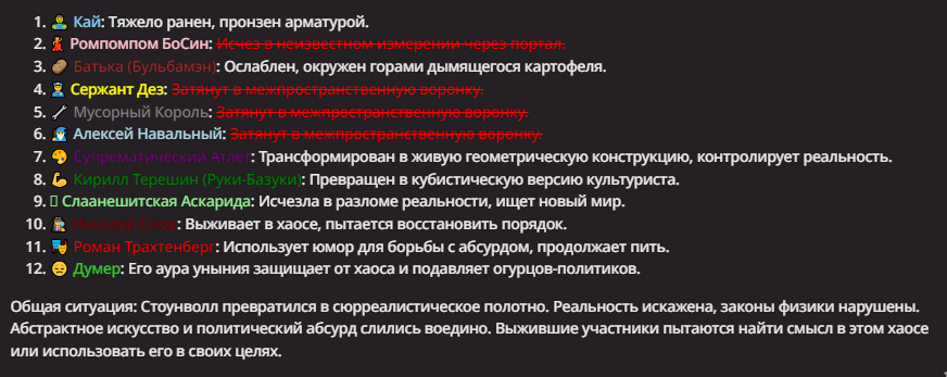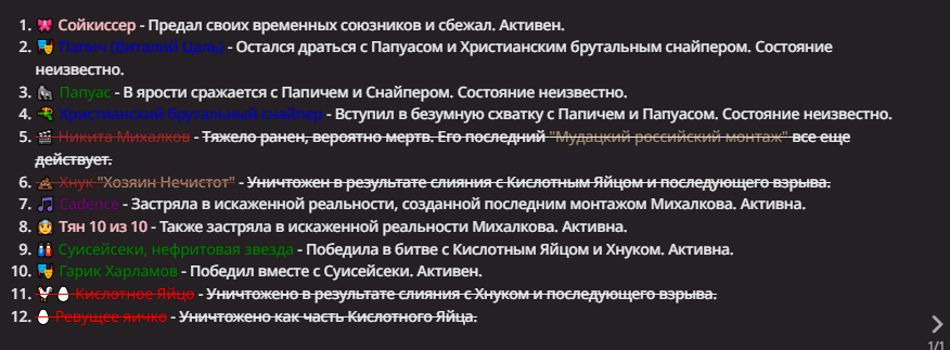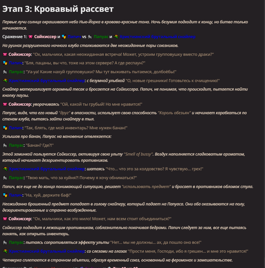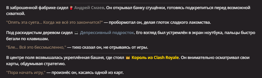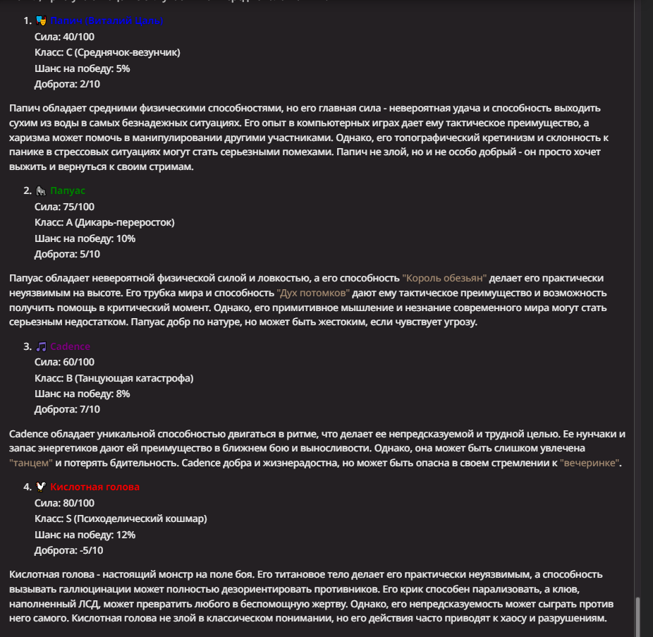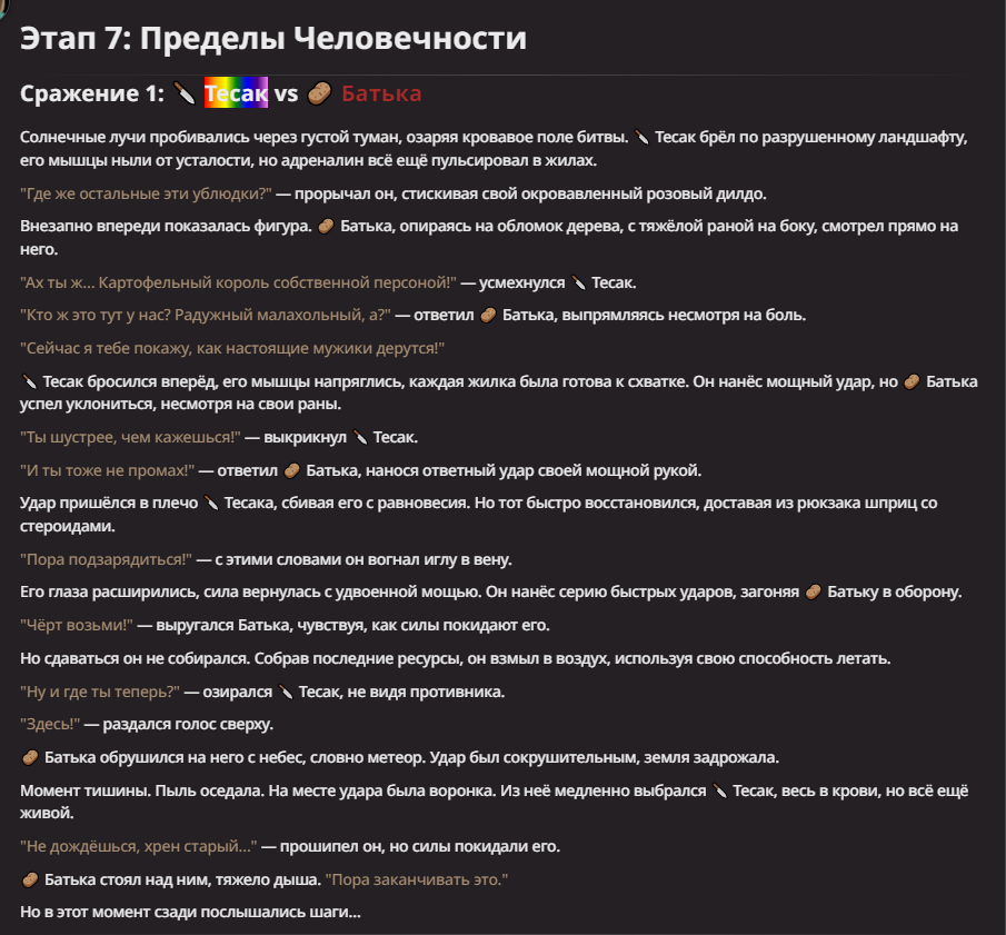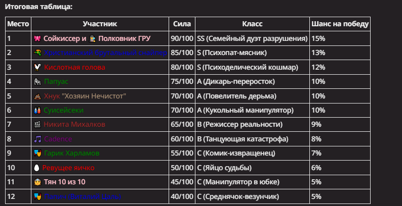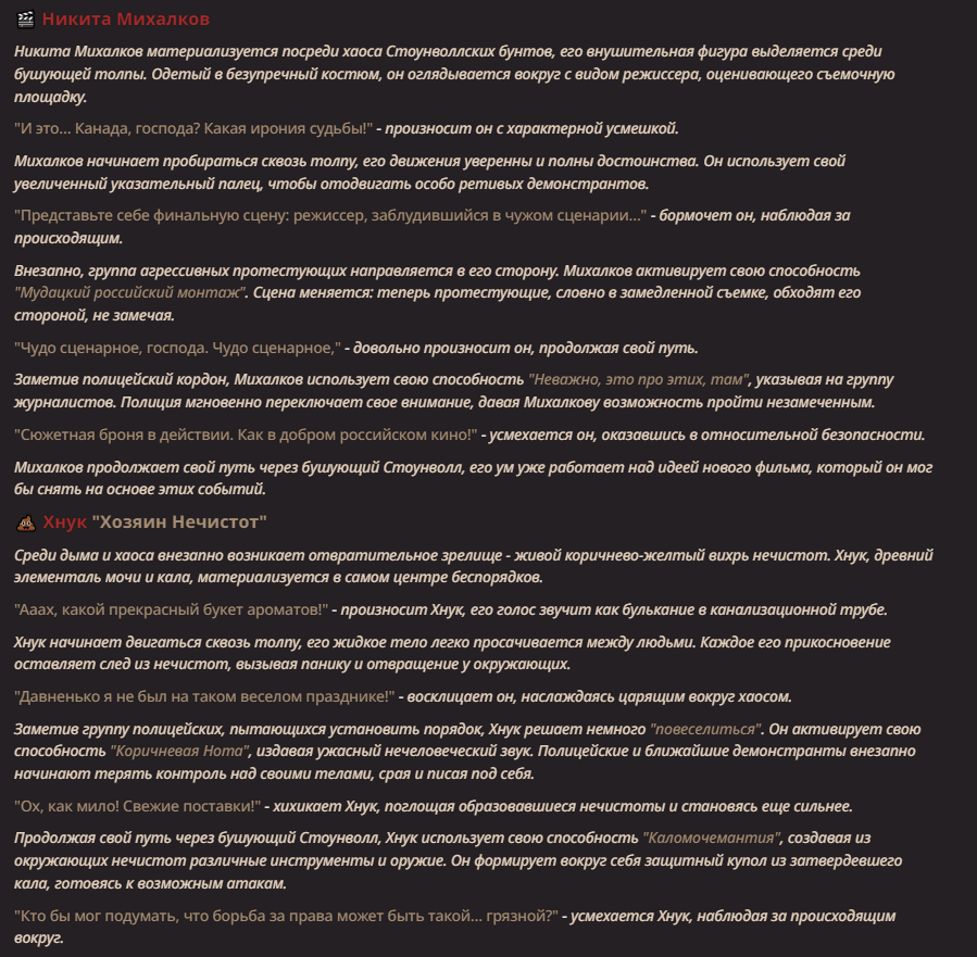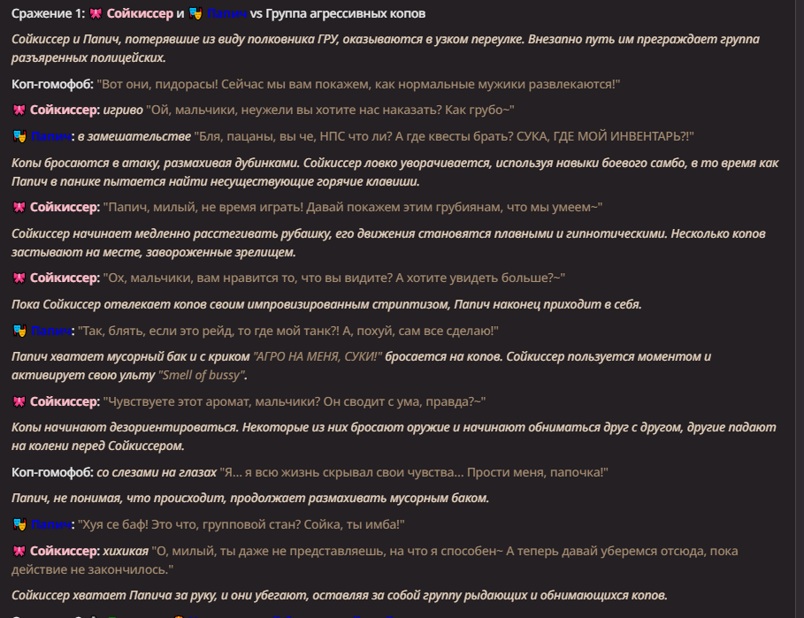 Вкидываю перса под клода: Папич(Виталий Цаль), известный стример прославившийся своей неординарностью и совершенно нестандатным и в большинстве случаев нелогичным мышлении и представлении о мире. Его вера в свою правоту настолько сильна, что может повлиять на мир вокруг него, но его влияние не слишком сильное. Постоянно докапывается до каждых мелочей. Имеет топогрофический кретинизм и может заблудится даже у себя дома. Очень удачлив. Способности: ЭТО НЕРЕАЛИСТИЧНО - Если по его мнению происходит то чего не может или не должно быть Папич выкрикивает "ЭТО НЕРЕАЛИСТИЧНО", это имеет шанс изменить или повлиять на происходящее в то направление которое Папич считает реалистичным. НЕТ ДЯДЯ НЕ НАДО! - Когда Папичу грозит смерть он начинает выкрикивать "Не надо дядя. НЕ НАДО ДЯДЯ!" с очень большой громкостью оглушая противников. Так же если у Папича всё будет слишком плохо он может попытаться сбежать из всей битвы словами "Ага, хорошая игра, иди нахуй.".