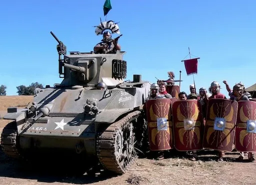 Танк M3 стюарт САУ stug 3 Jeep Willys с установленным на ним пулеметом браунинга 10 пулеметов MG 42 15 ППШ 30 болтовых винтовок различных моделей Центурион Бенито Муссолини вооружен лазерным синхрофазматроном, который стреляет сверхбыстрой самонаводящийся плазмой, от которой невозможно увернутся и которая в любом случае поразит свою цель, испепелив её