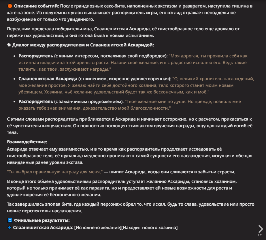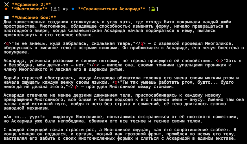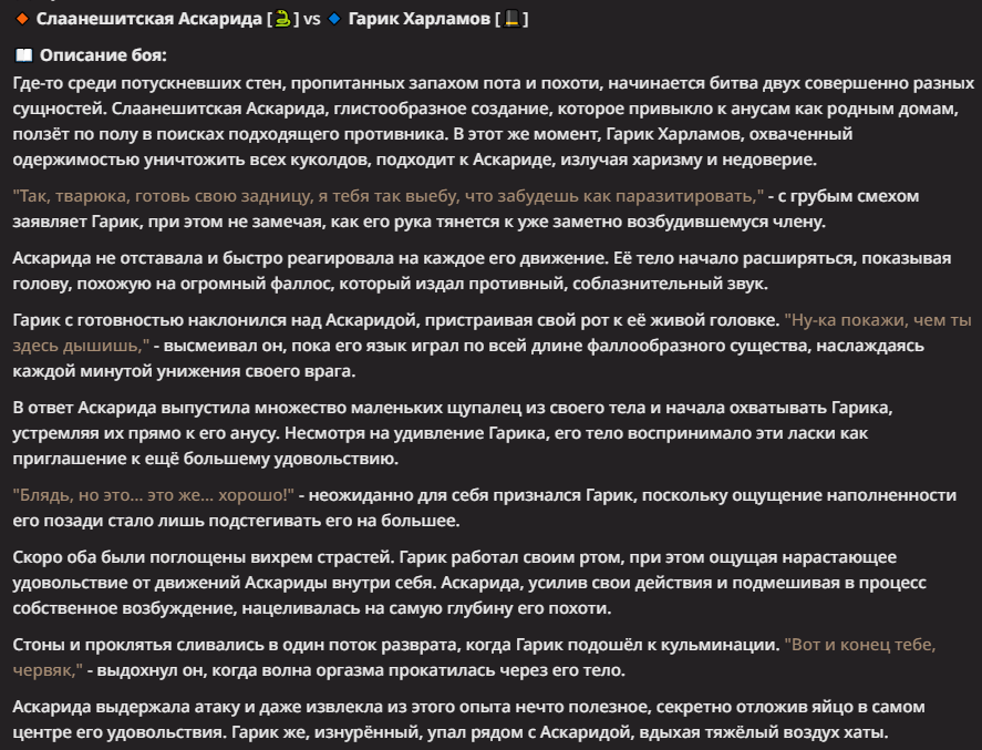 >>1548611 Слаанешитская Аскарида. Глистообразное существо с головой в виде члена. Из-за глистообразной природы не восприимчива к кислоте, ядам, гнили и говну. Иногда издает какие-то нечленораздельные звуки. Не агрессивна и в целом безобидна. Стремится увеличить популяцию аскарид. Мастер скрытности во всех спектрах, затаивания и увиливания из ловушек. В случае опасности может проделать червоточину в безопасное место. Может перемещаться под землей. Родная среда обитания - анус. Поэтому ей дискомфортно находится на свежем воздухе и она исследует мир в поисках подходящего хозяина. Обычно под роль хозяина подходит ослабленное или на чем-то сосредоточенное существо и выбрав хозяина пролазит ему в анус. Если у хозяина нет ануса, то она его создает, при этом создать его она может в существе совершенно любой природы. Если у хозяина есть анус, то при вхождении в него, вызывается почти мгновенное возбуждение и последующий оргазм, который сопровождается обильным мочеиспусканием. В анусе она сидит как паразит, пока жив носитель, откладывая внутри яйцо и копируя одну из способностей хозяина, но взамен дает ему улучшенное пищеварение и здоровую обильную дефекацию. На следующий раунд из яйца вылупляется новая Аскарида, которая покидает носителя. При этом у носителя периодически возникают похотливые желания по отношению к другим участникам(кроме Аскариды), сильное возбуждение и острое желание флиртовать.